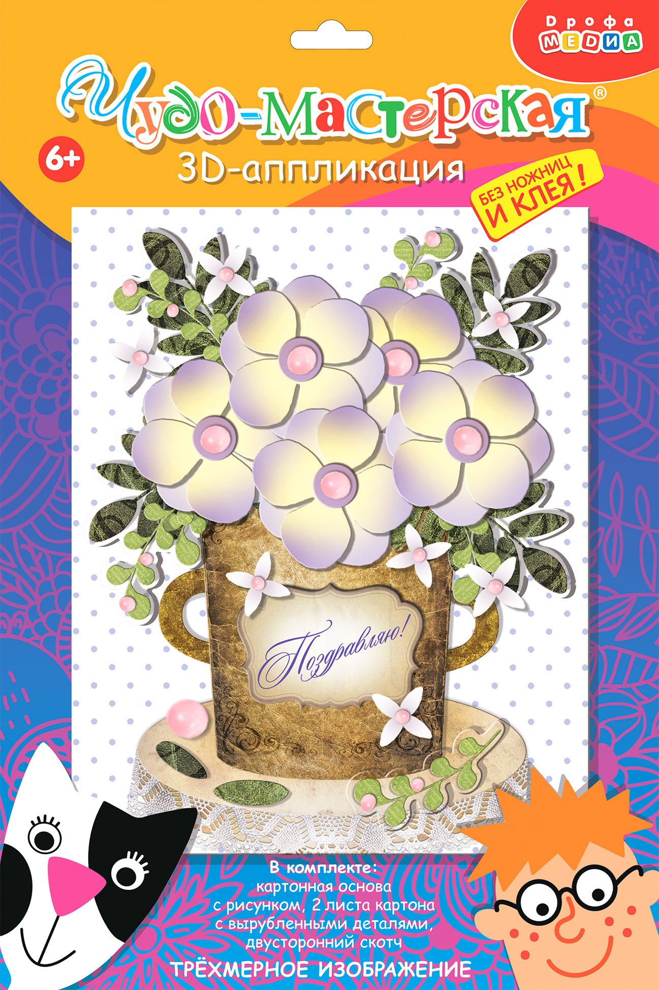 3D-аппликация – современный и очень увлекательный вид творчества. Данный набор позволит создать необыкновенно выразительную 3D-картину. Яркие и красочные детали изображения, выполненные из плотного картона, выступают над основой, создавая причудливый и сказочный мир. Этот удивительный 3D-эффект возникает благодаря использованию объёмного двустороннего скотча. Готовое изделие смотрится необыкновенно эффектно.