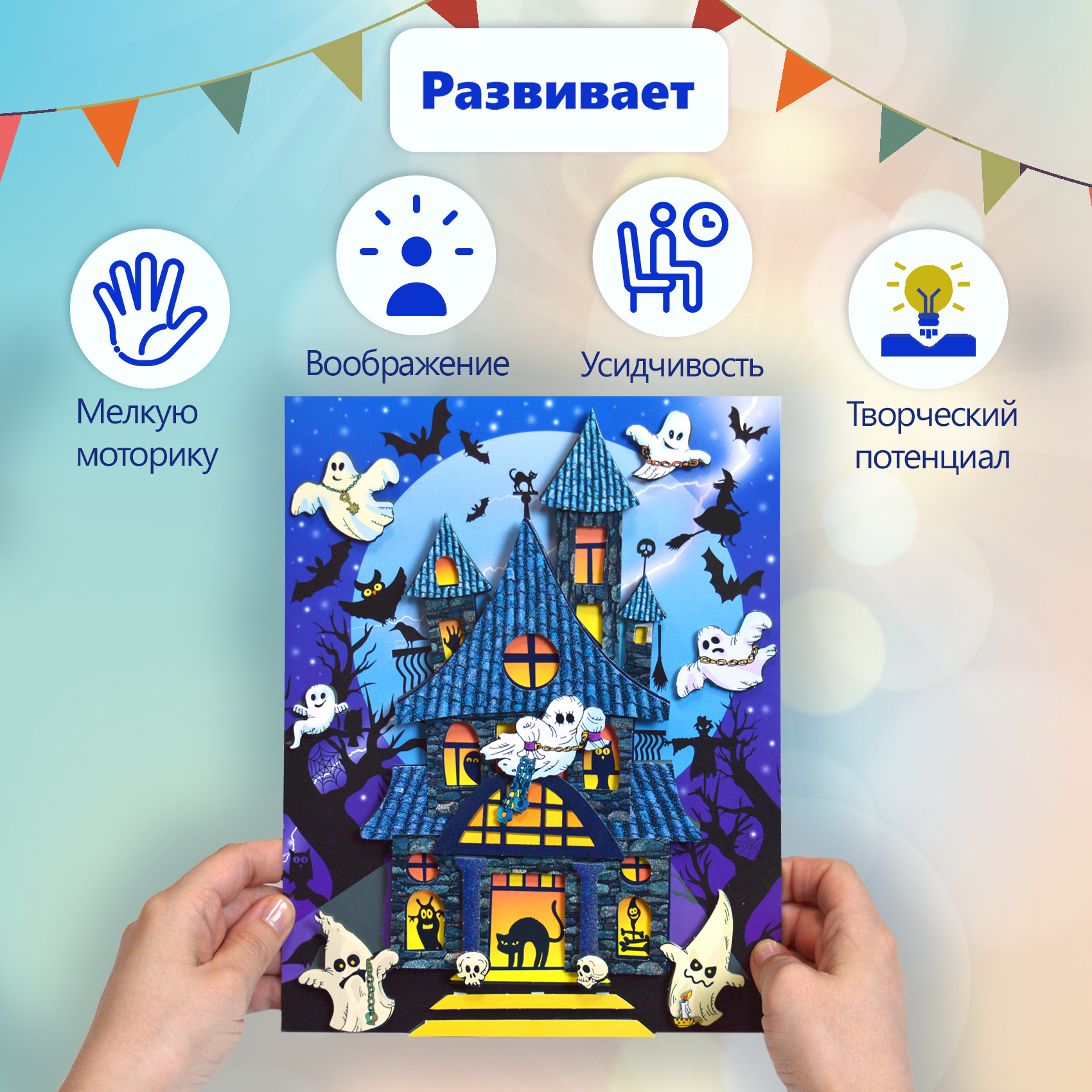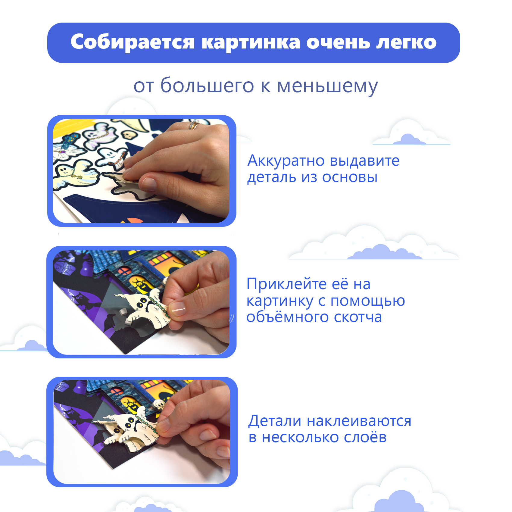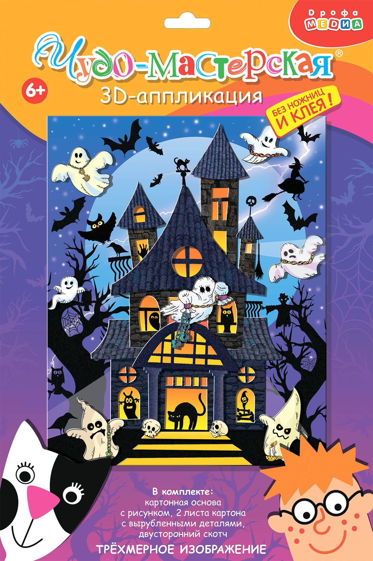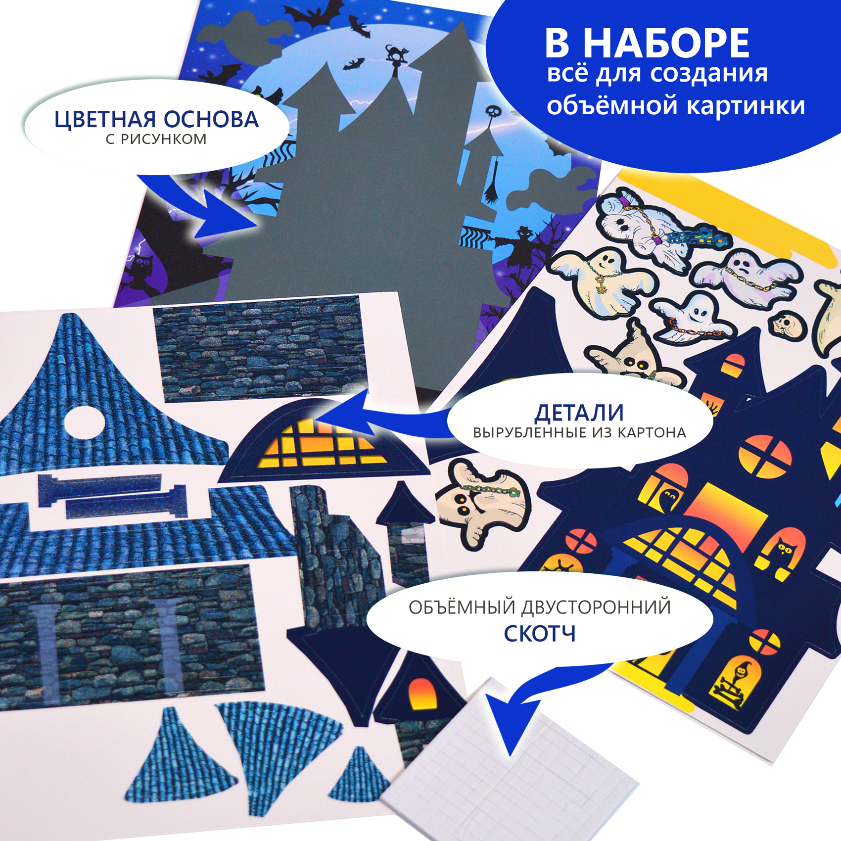 3D-аппликация – современный и очень увлекательный вид творчества. Данный набор позволит создать необыкновенно выразительную 3D-картину. Яркие и красочные детали изображения, выполненные из плотного картона, выступают над основой, создавая причудливый и сказочный мир. Этот удивительный 3D-эффект возникает благодаря использованию объёмного двустороннего скотча. Готовое изделие смотрится необыкновенно эффектно.