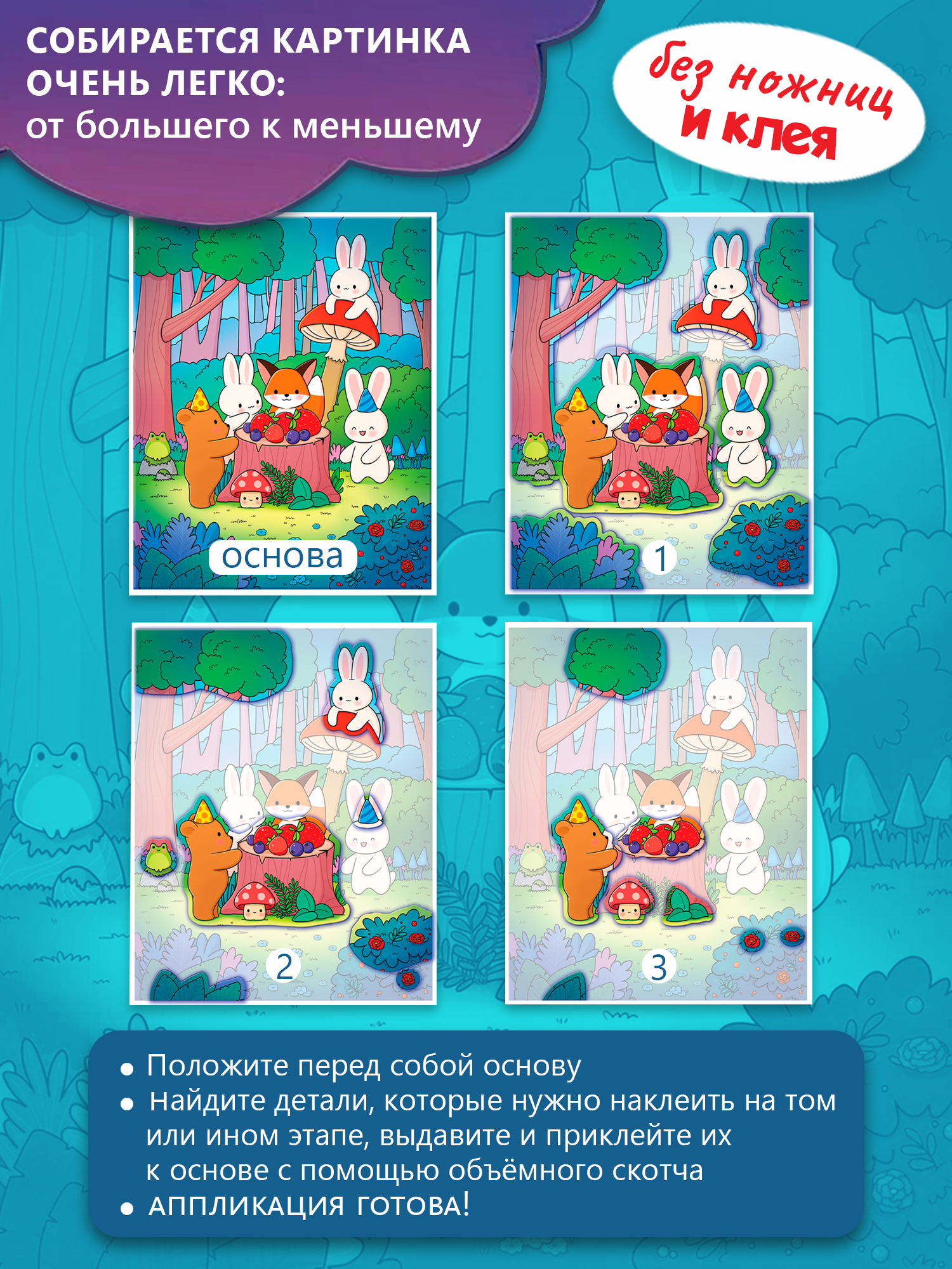 Каваий — японское слово, которое означает «милый», «хорошенький». Лесные зверушки, на новой 3D-аппликации от Дрофы-Медиа, очень милые и хорошенькие! Кавайная картинка понравится детям их родителям. Детали аппликации уже вырублены, нужно только аккуратно выдавить их из основы, и приклеить на картинку объёмным двусторонним скотчем.