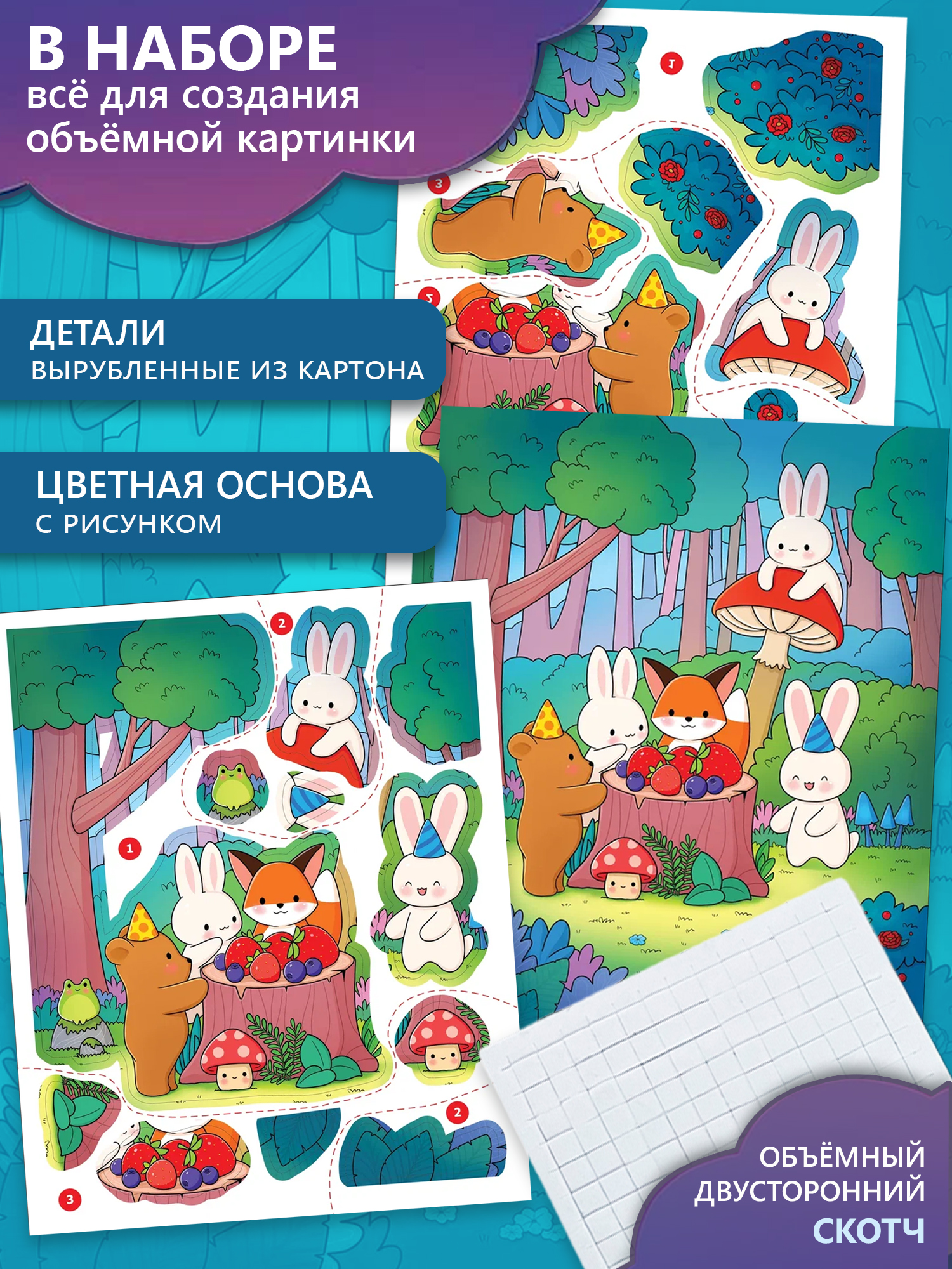 В наборе: картонная основы с рисунком, 2 листа картона с вырубленными деталями, двухсторонний скотч.