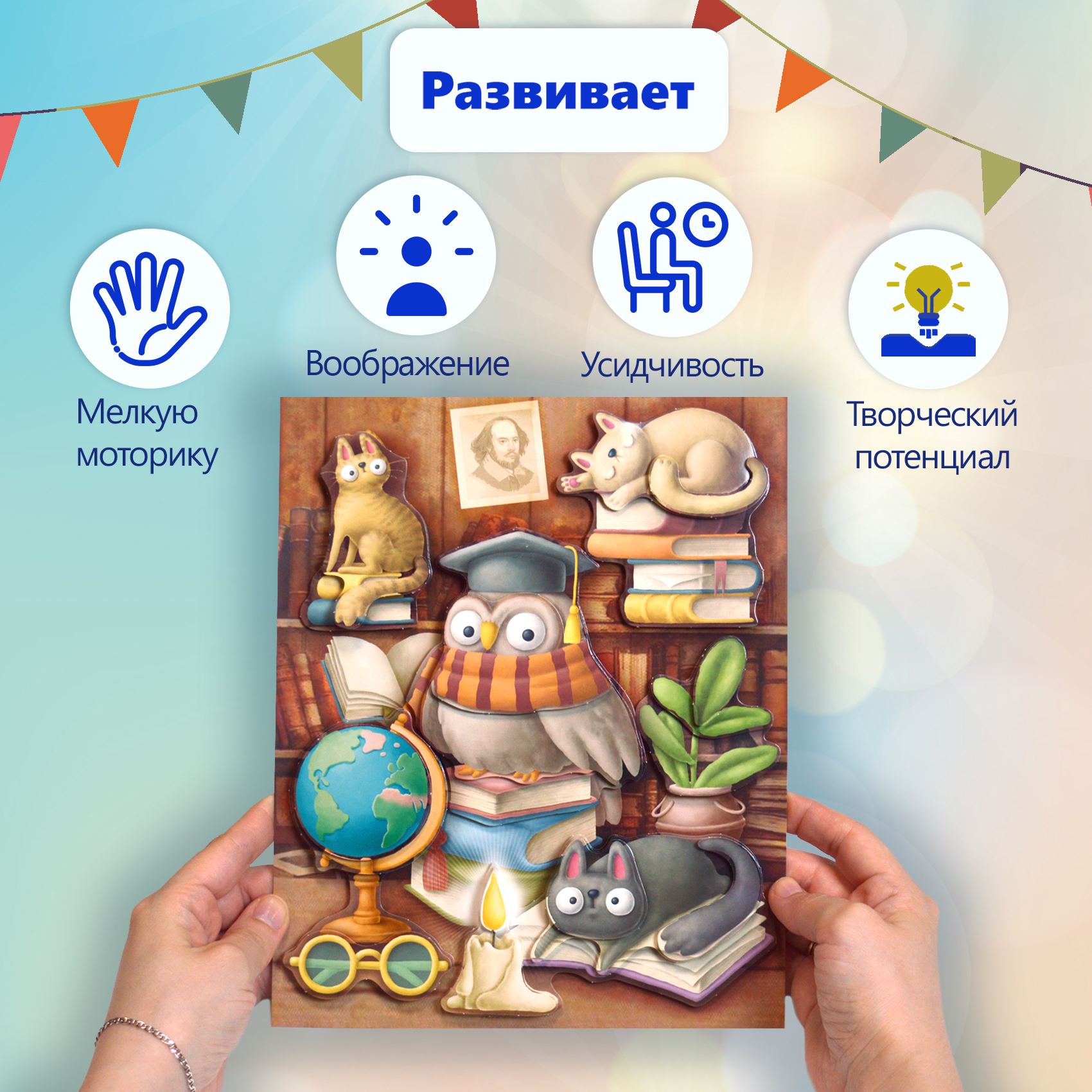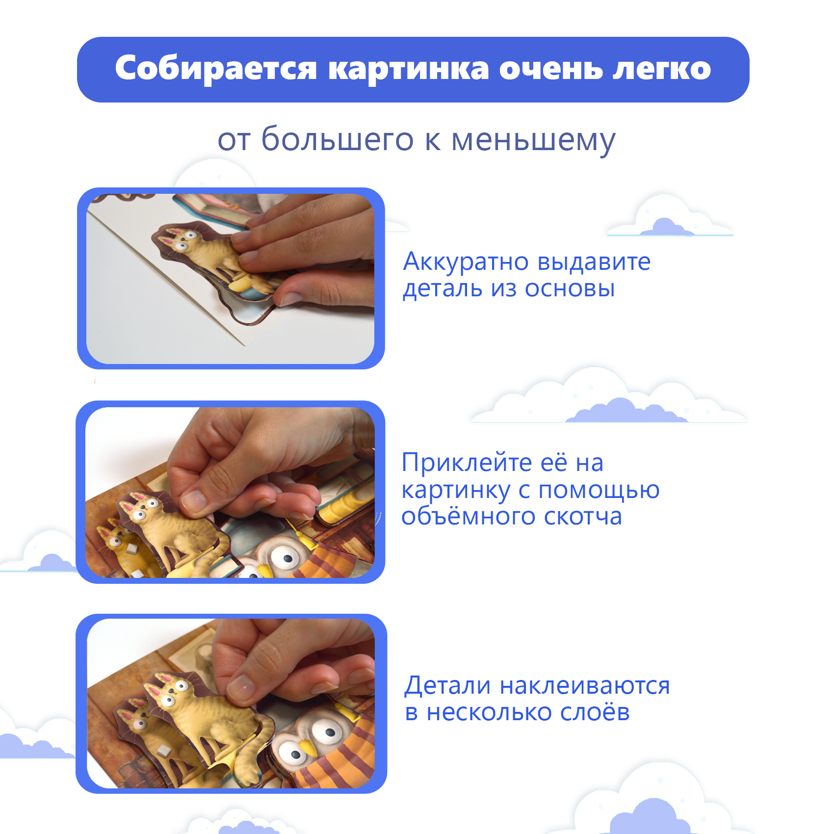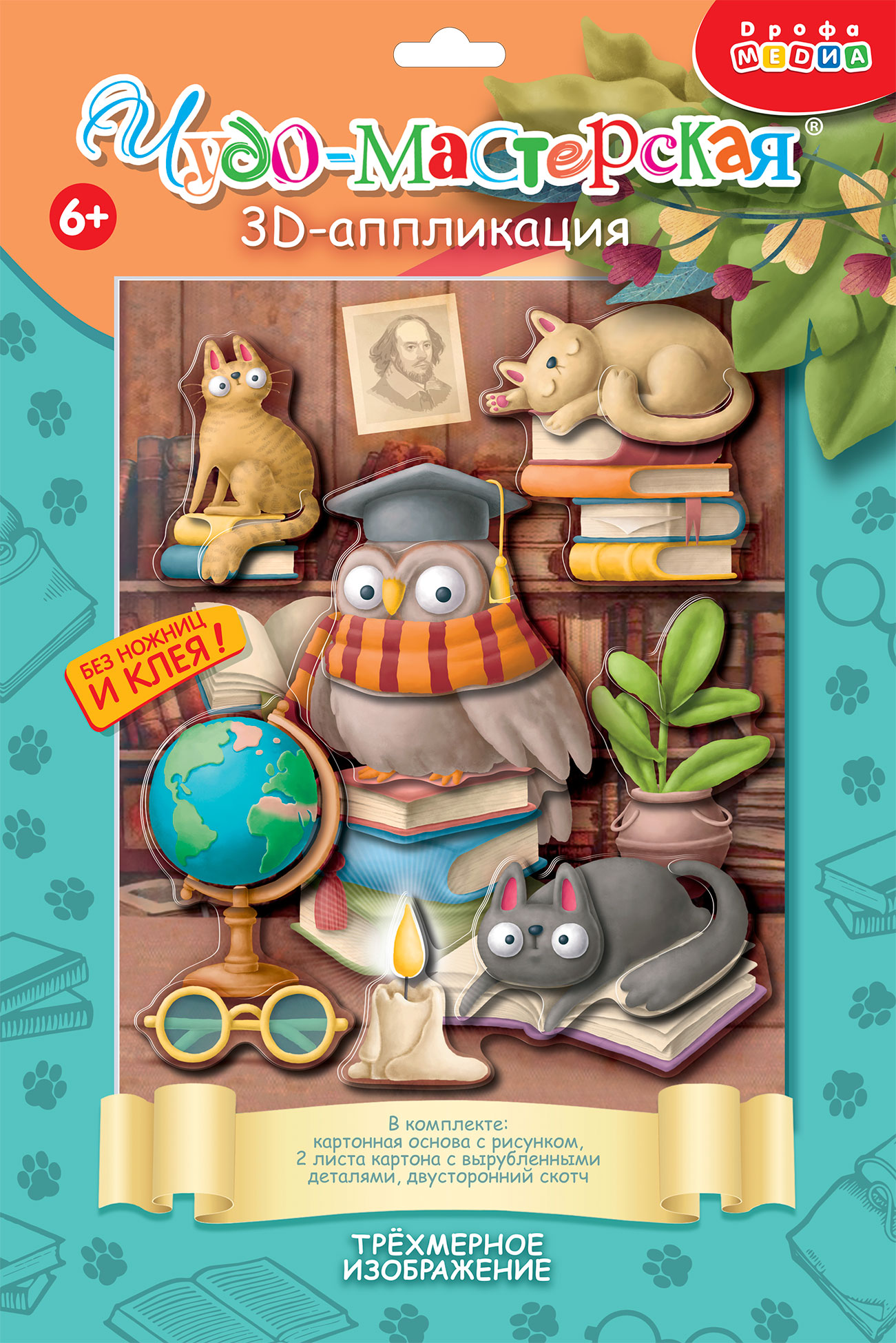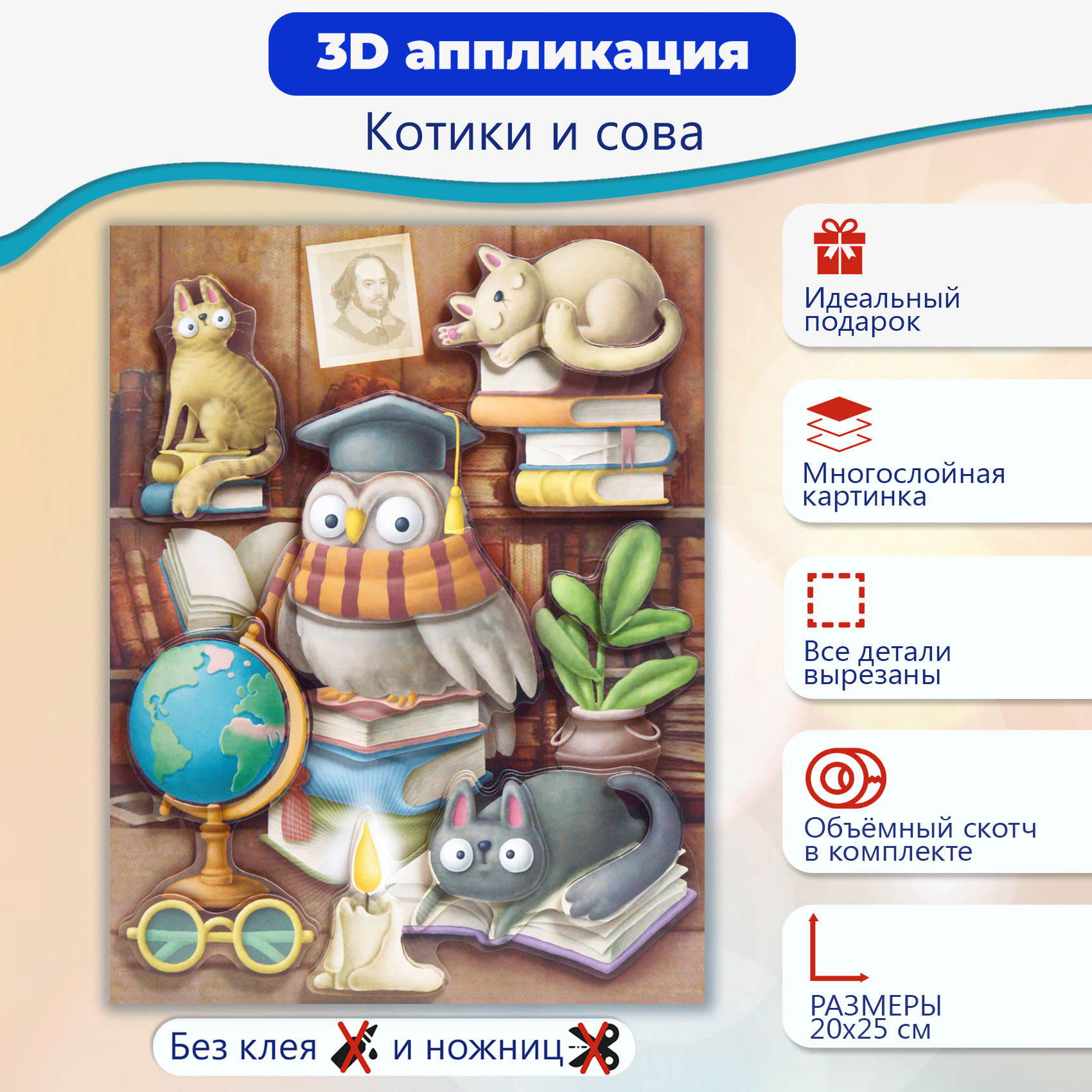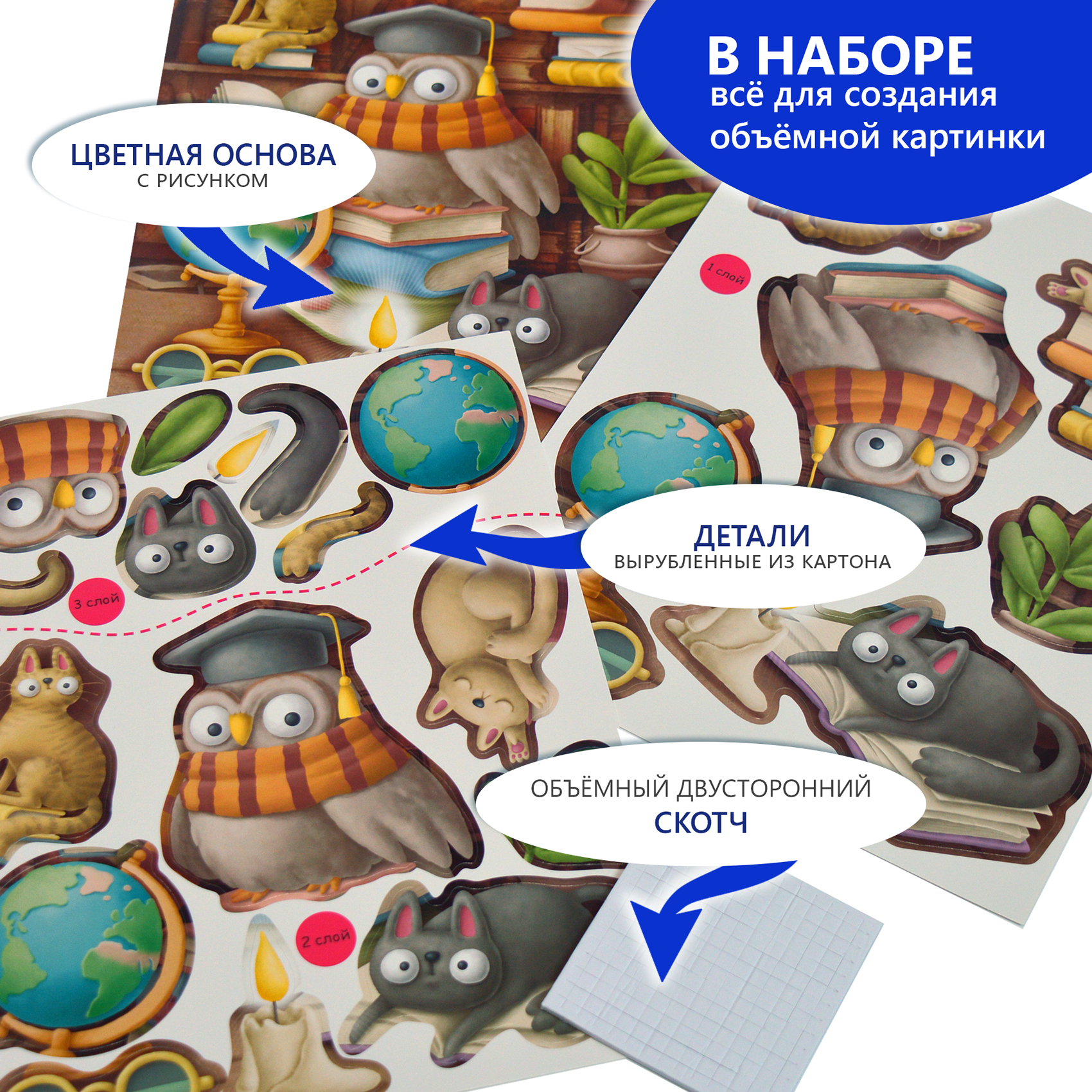 3D-аппликация – современный и очень увлекательный вид творчества. Данный набор позволит создать необыкновенно выразительную 3D-картину. Яркие и красочные детали изображения, выполненные из плотного картона, выступают над основой, создавая причудливый и сказочный мир. Этот удивительный 3D-эффект возникает благодаря использованию объёмного двустороннего скотча. Готовое изделие смотрится необыкновенно эффектно.
