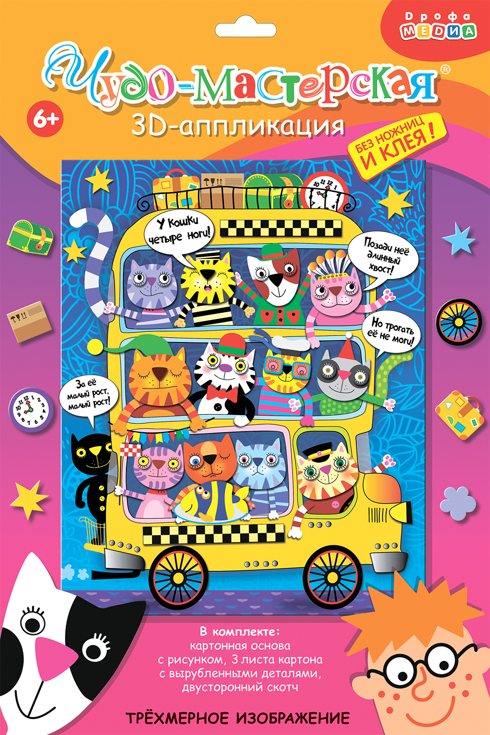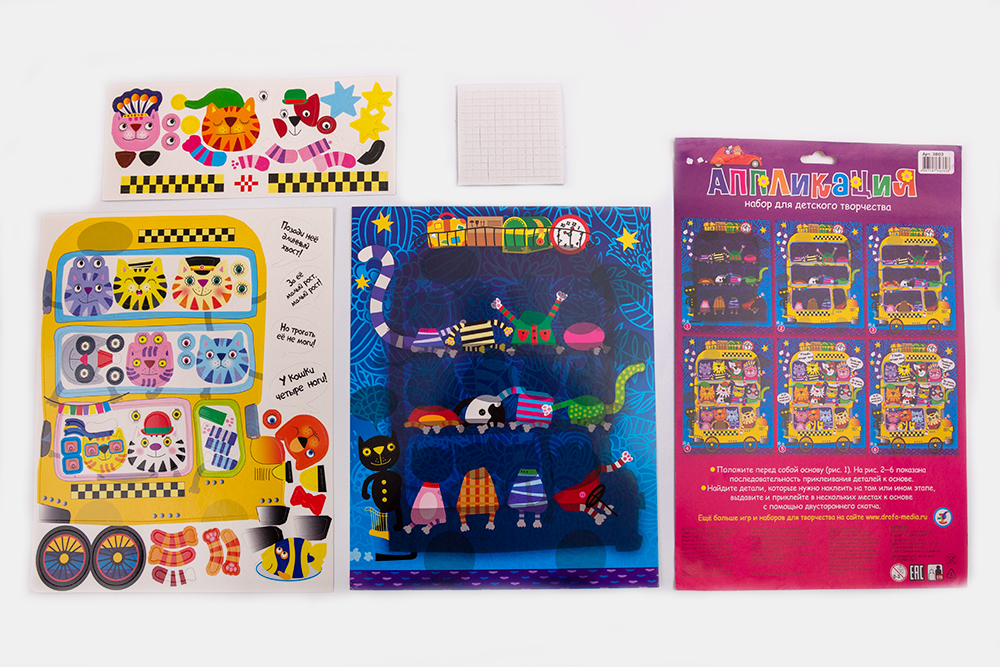 3D-аппликация — современный и очень увлекательный вид творчества. Данный набор позволит создать необыкновенно выразительную 3D-картину. Яркие и красочные детали изображения, выполненные из плотного картона, выступают над основой, создавая причудливый и сказочный мир. Этот удивительный 3D-эффект возникает благодаря использованию объёмного двустороннего скотча. Готовое изделие смотрится необыкновенно эффектно.