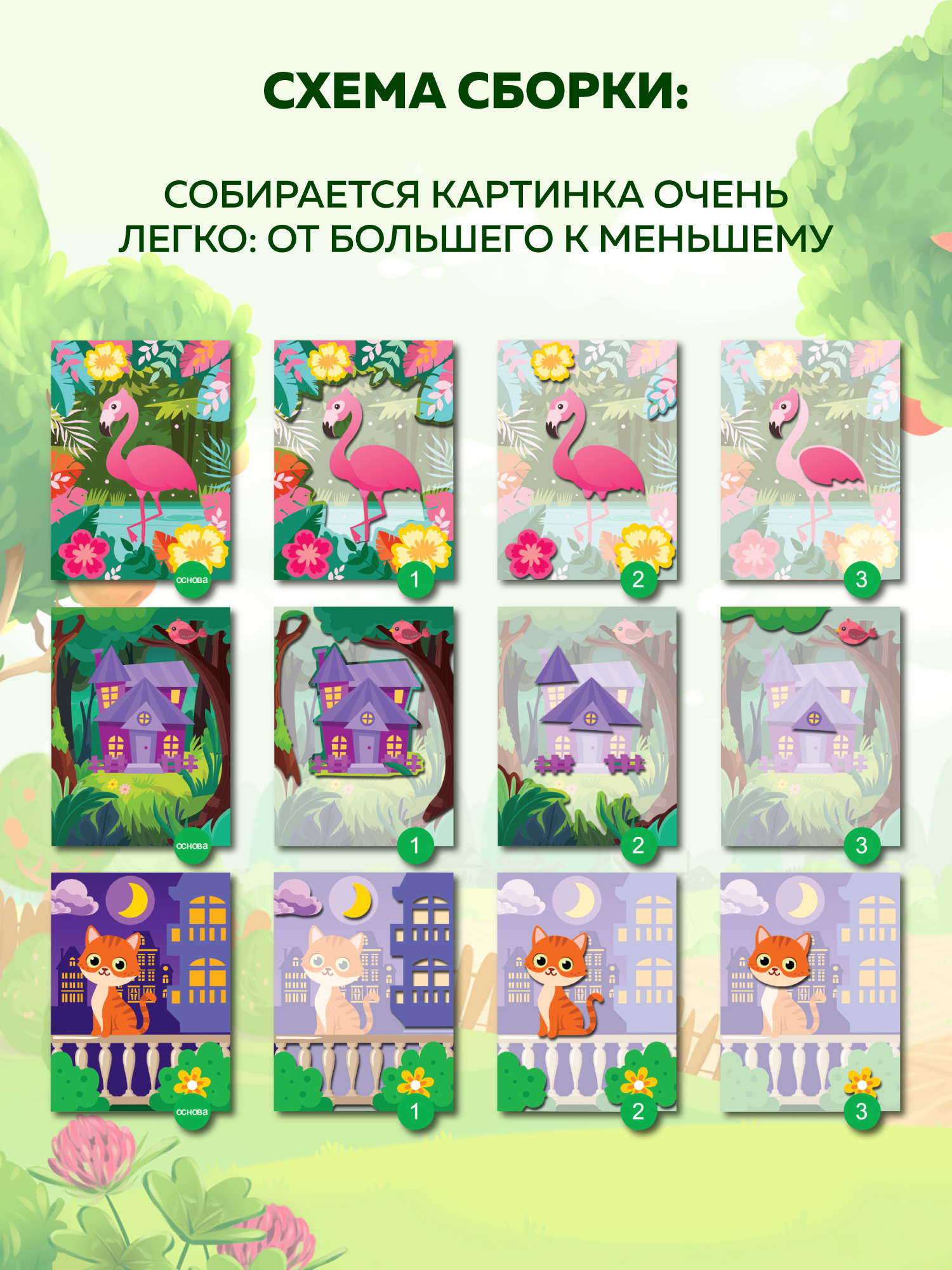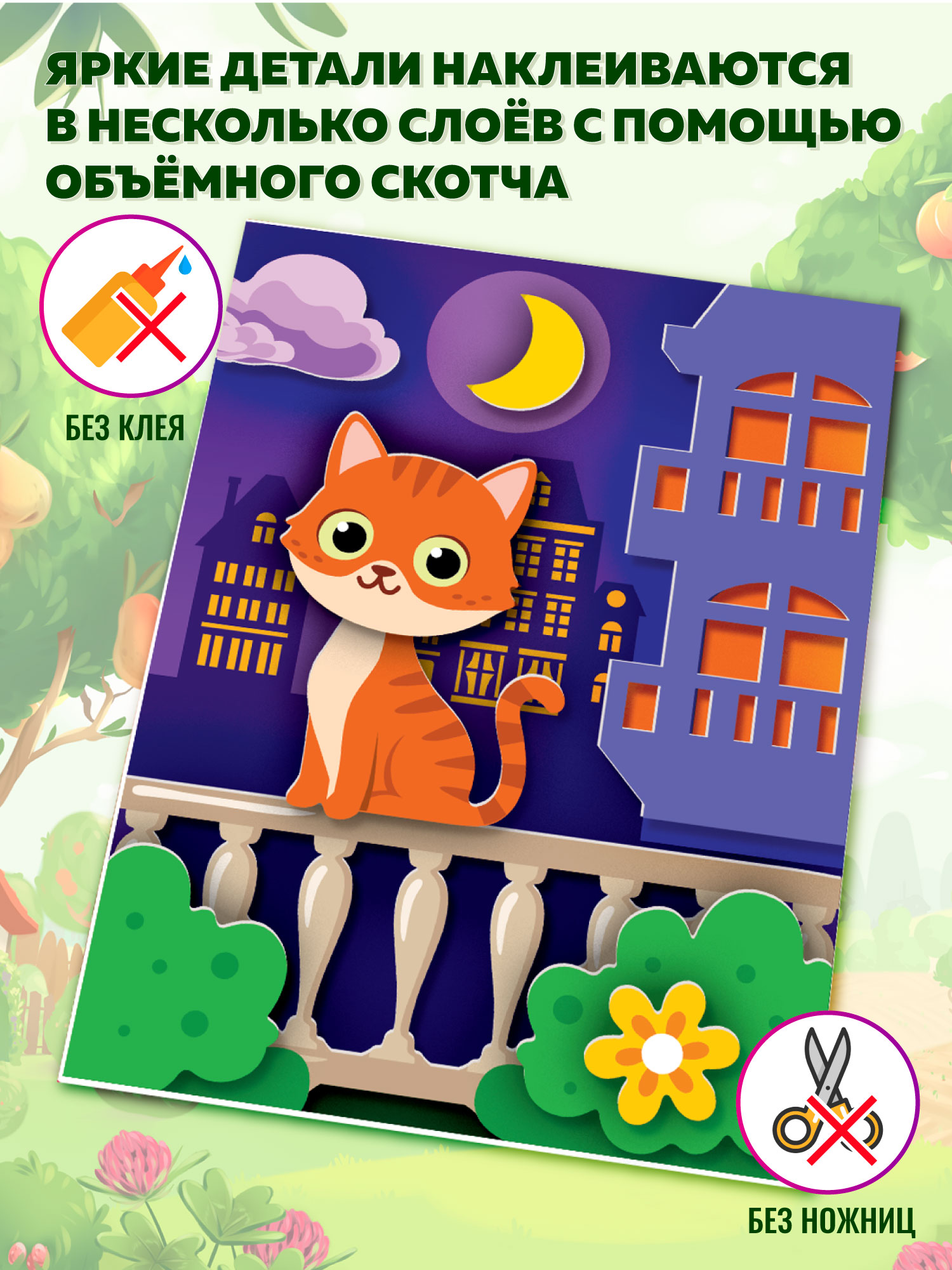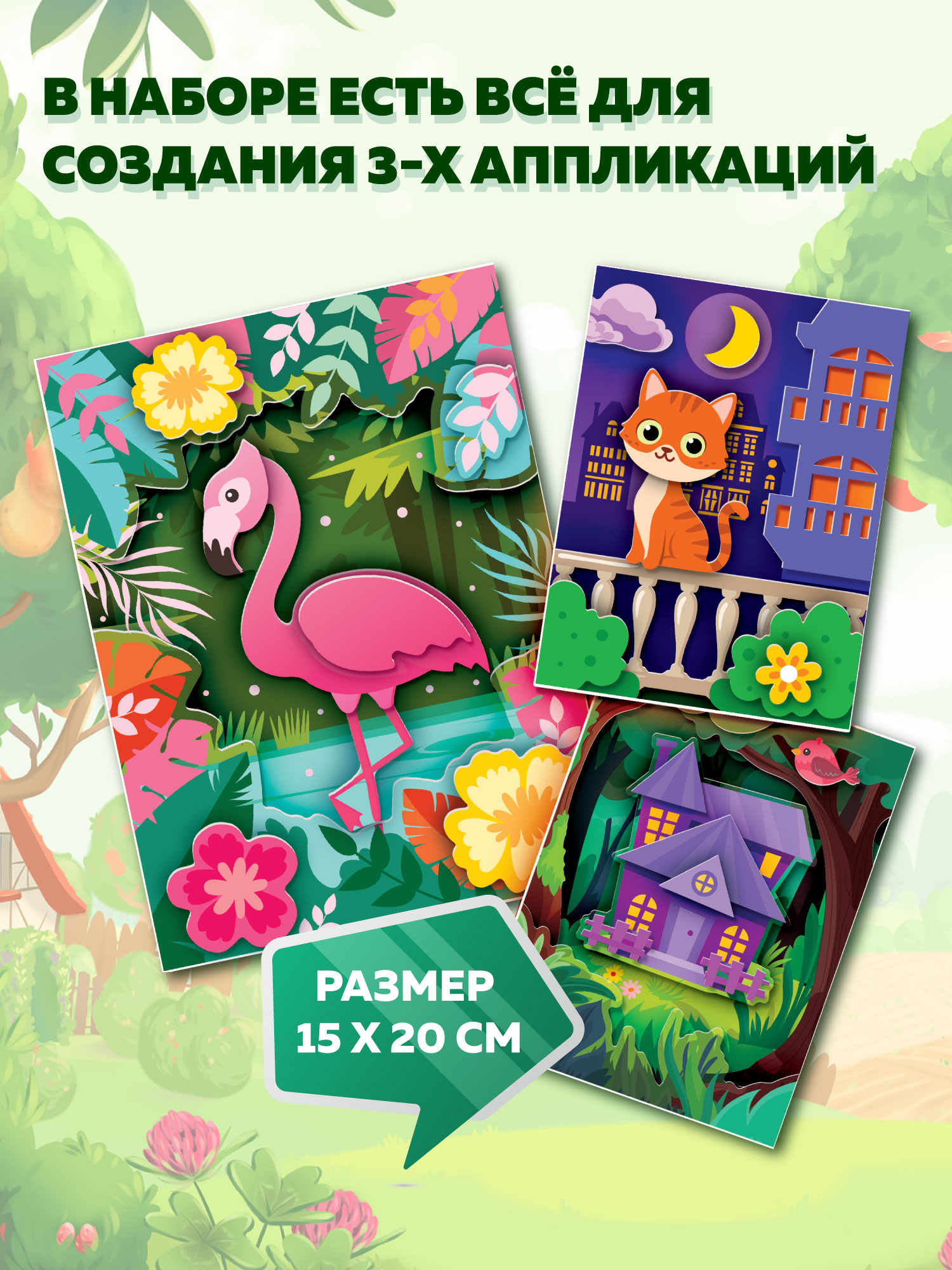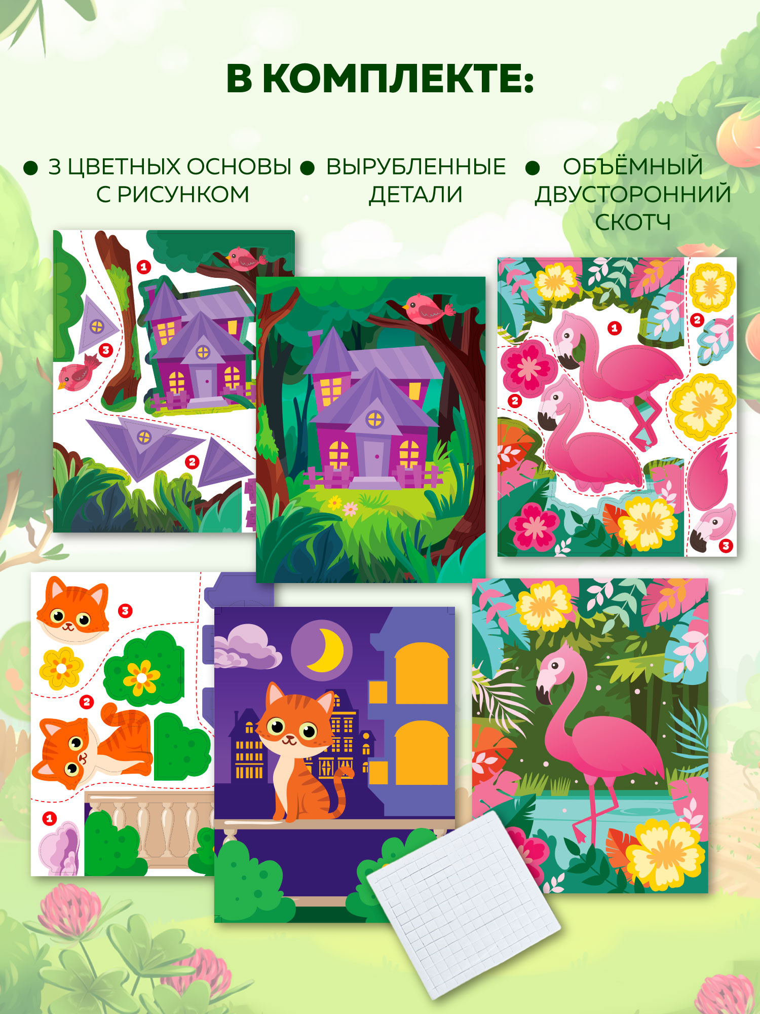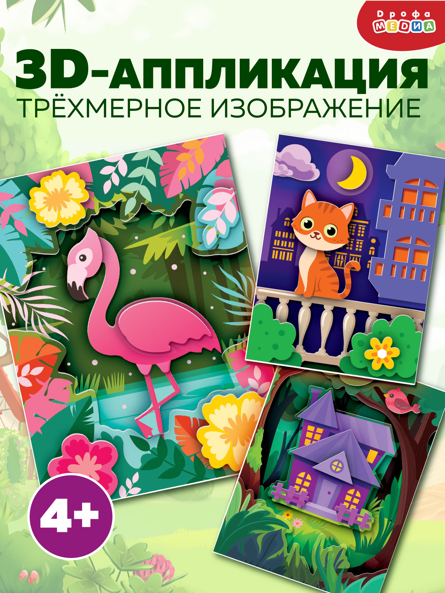 3D-аппликация – современный и очень увлекательный вид творчества. В наборе вы найдёте всё для создания трёх объёмных поделок. Готовые детали аппликации из плотного картона нужно наклеить на картинку с помощью объёмного двустороннего скотча. Клей и ножницы не нужны. Яркие красочные детали, наклеенные в несколько слоёв, придадут плоскому изображению 3D-эффект. Ребёнок справится с поделкой самостоятельно, ведь в комплект входит пошаговая инструкция.