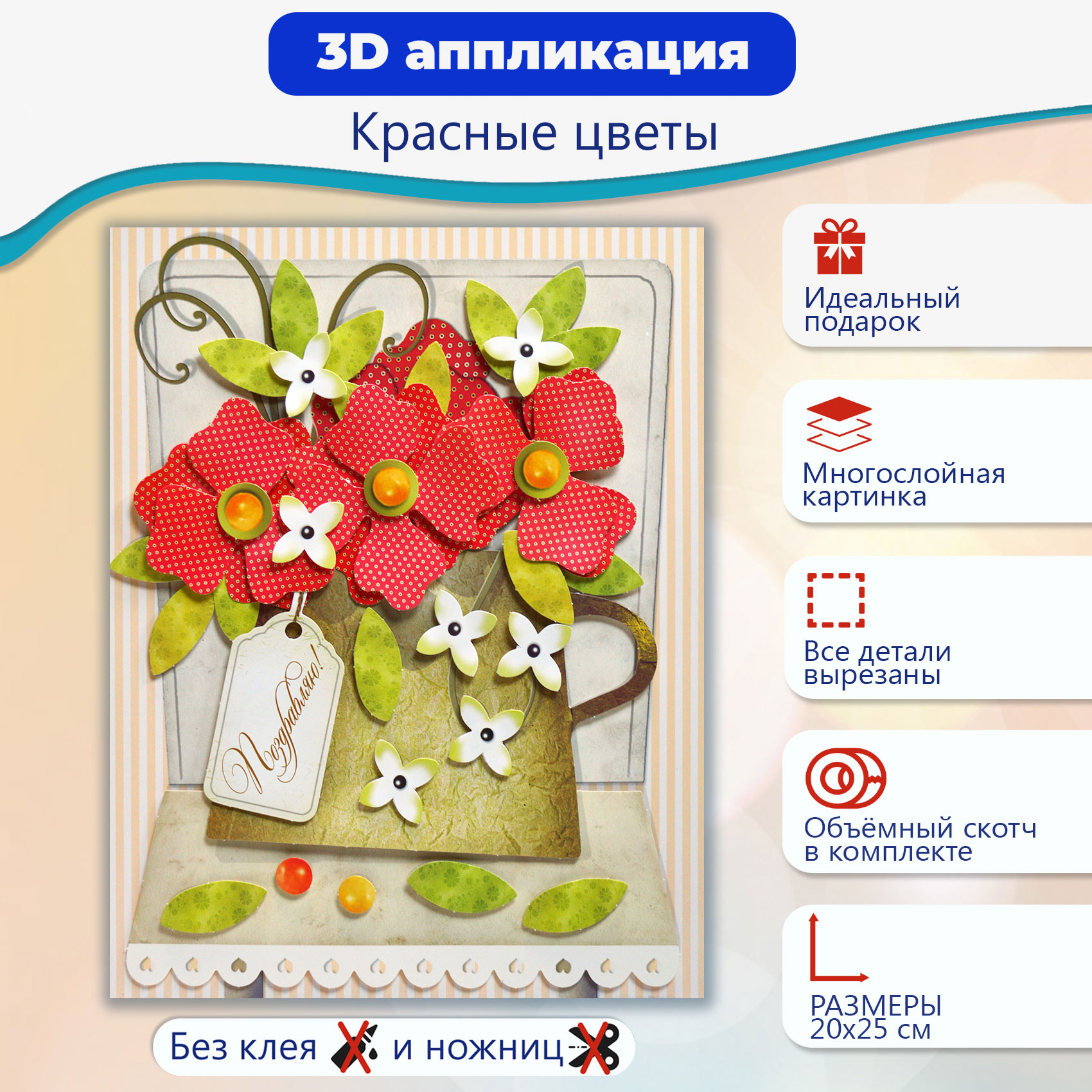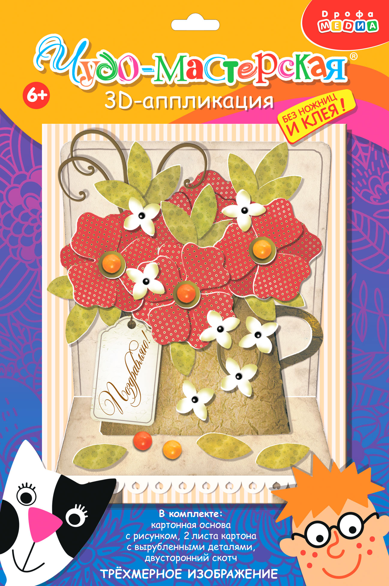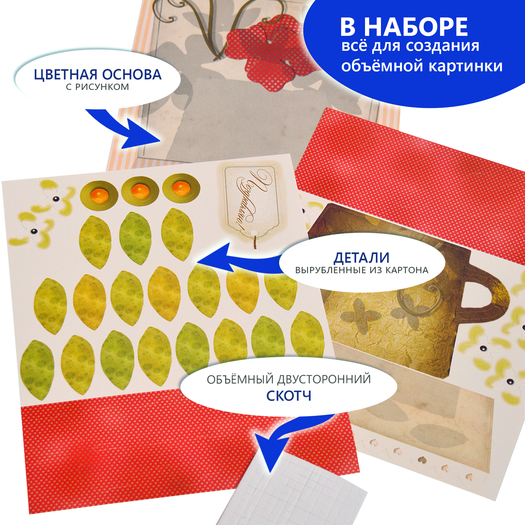 3D-аппликация – современный и очень увлекательный вид творчества. Данный набор позволит создать необыкновенно выразительную 3D-картину. Яркие и красочные детали изображения, выполненные из плотного картона, выступают над основой, создавая причудливый и сказочный мир. Этот удивительный 3D-эффект возникает благодаря использованию объёмного двустороннего скотча. Готовое изделие смотрится необыкновенно эффектно.