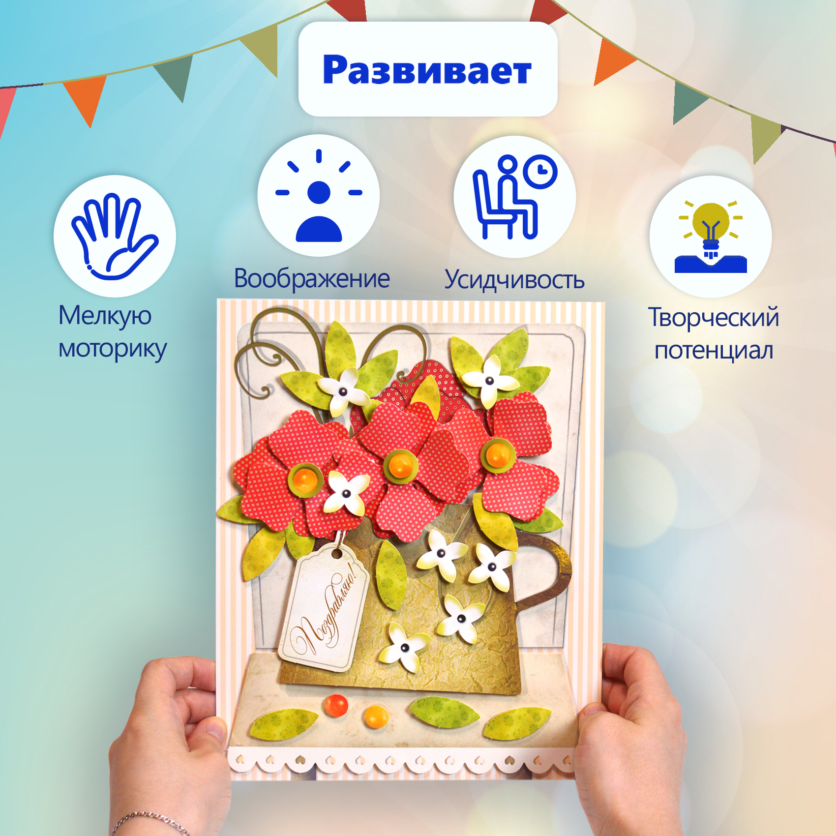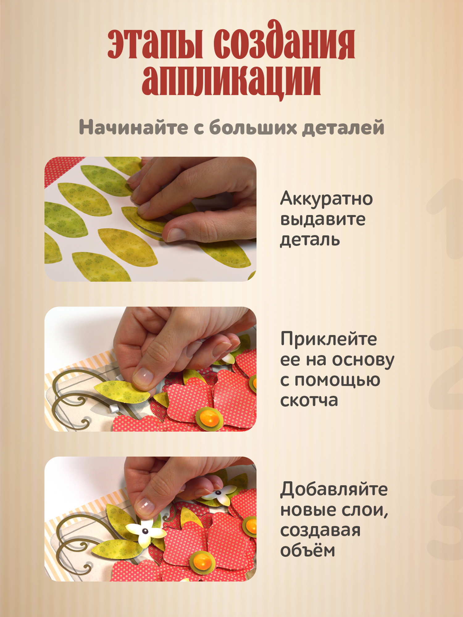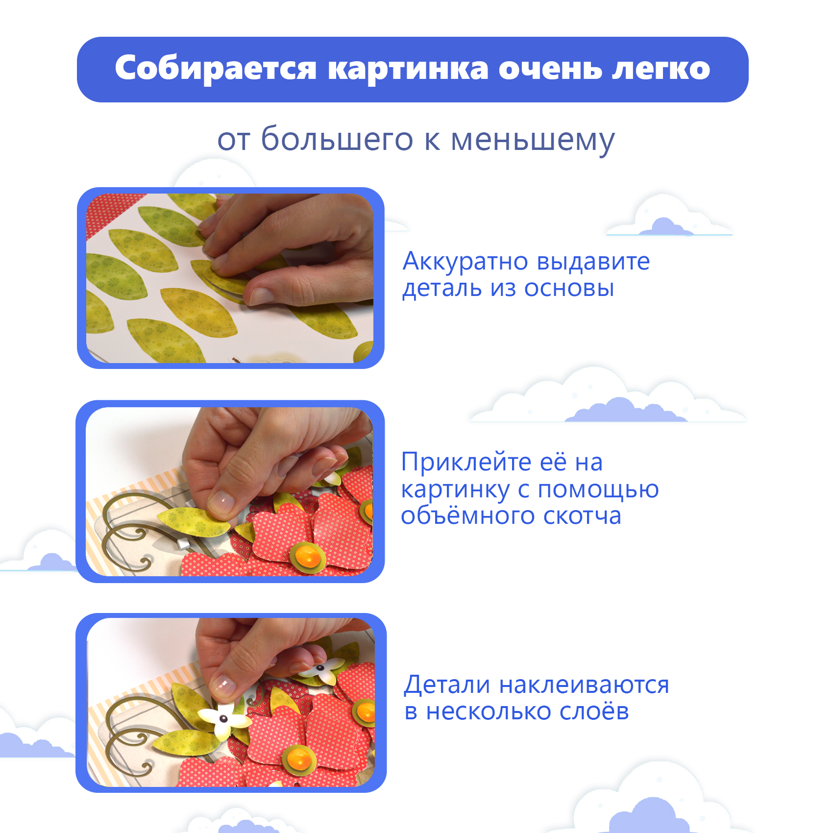 3D-аппликация – современный и очень увлекательный вид творчества. Данный набор позволит создать необыкновенно выразительную 3D-картину. Яркие и красочные детали изображения, выполненные из плотного картона, выступают над основой, создавая причудливый и сказочный мир. Этот удивительный 3D-эффект возникает благодаря использованию объёмного двустороннего скотча. Готовое изделие смотрится необыкновенно эффектно.