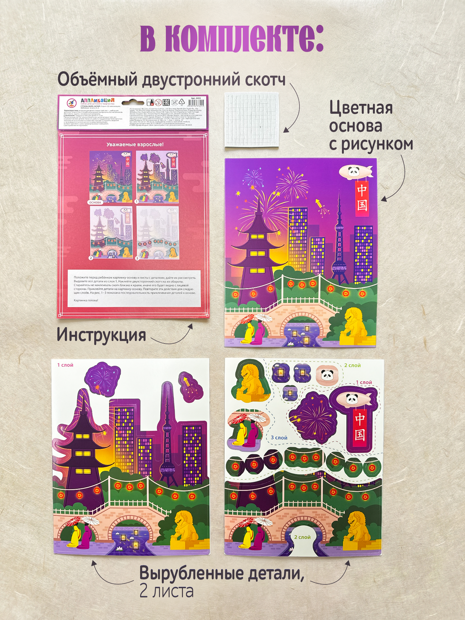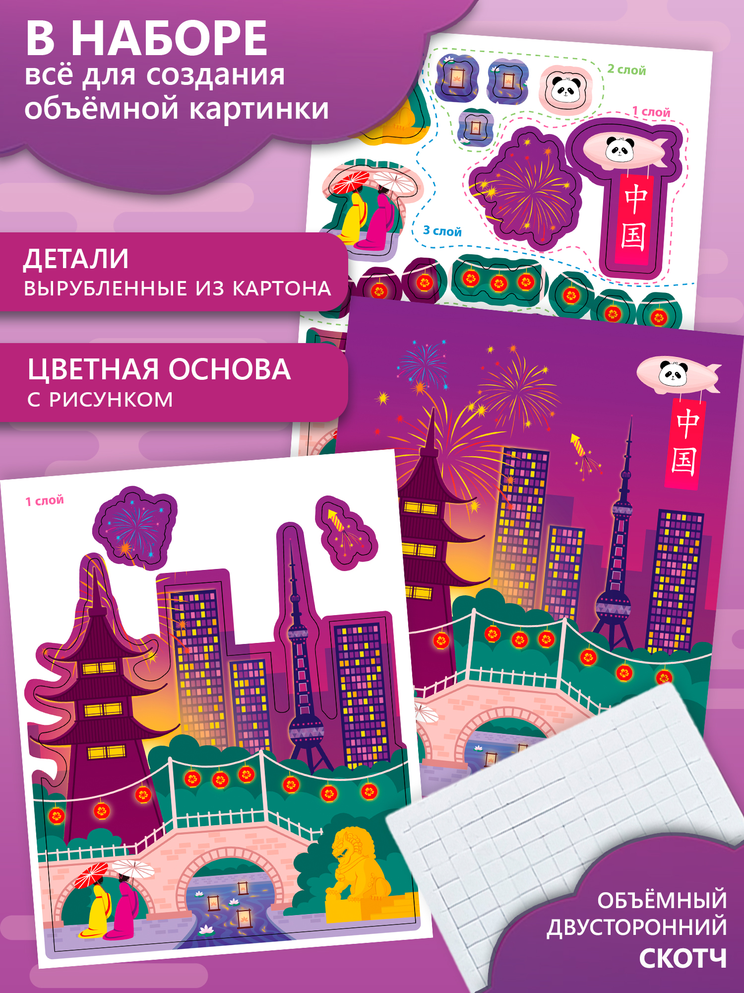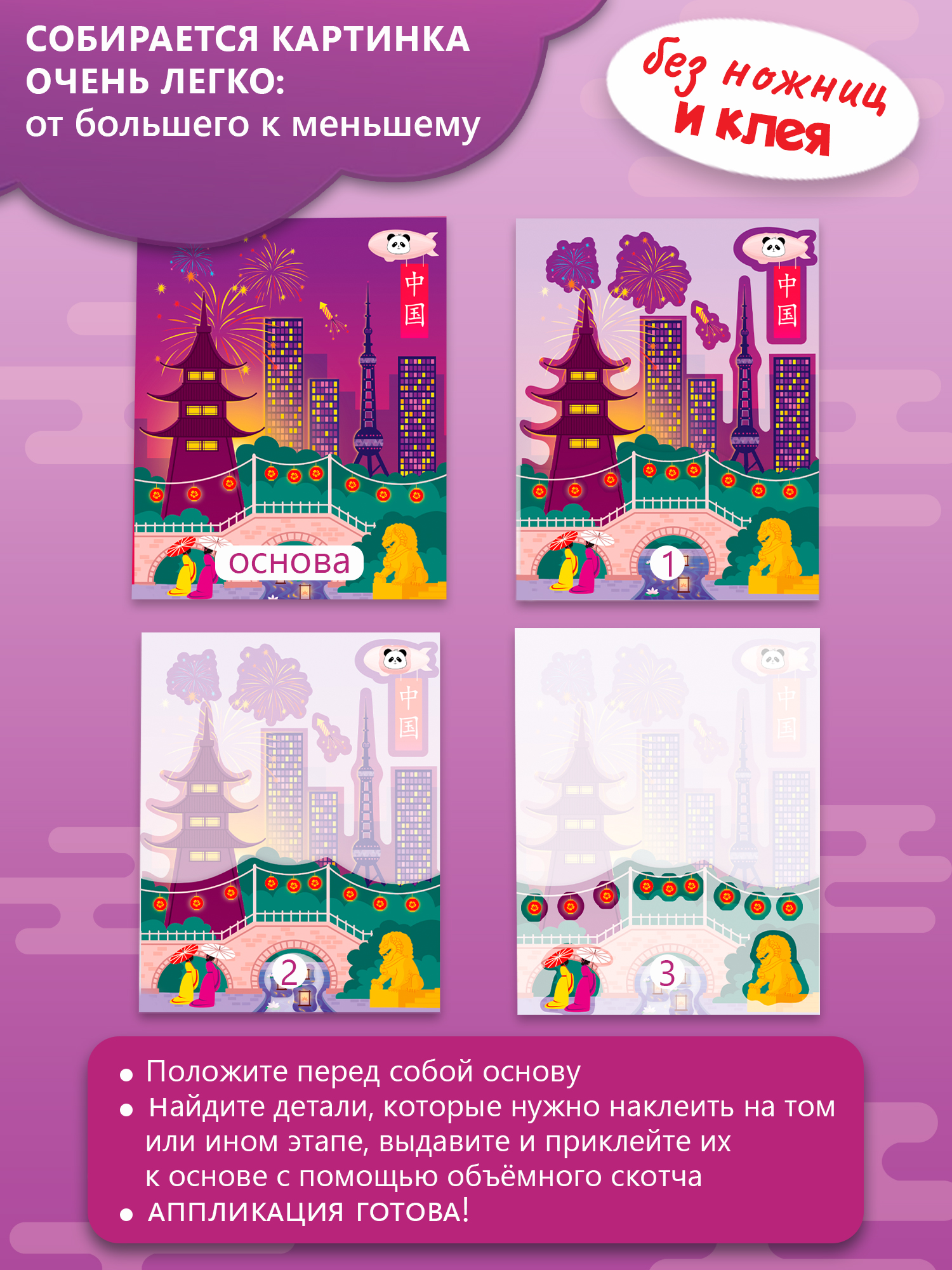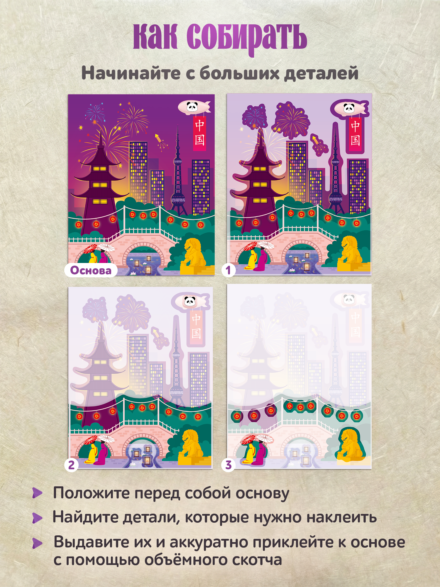 В наборе: картонная основа с рисунком, 2 листа картона с вырубленными деталями, двухсторонний скотч.