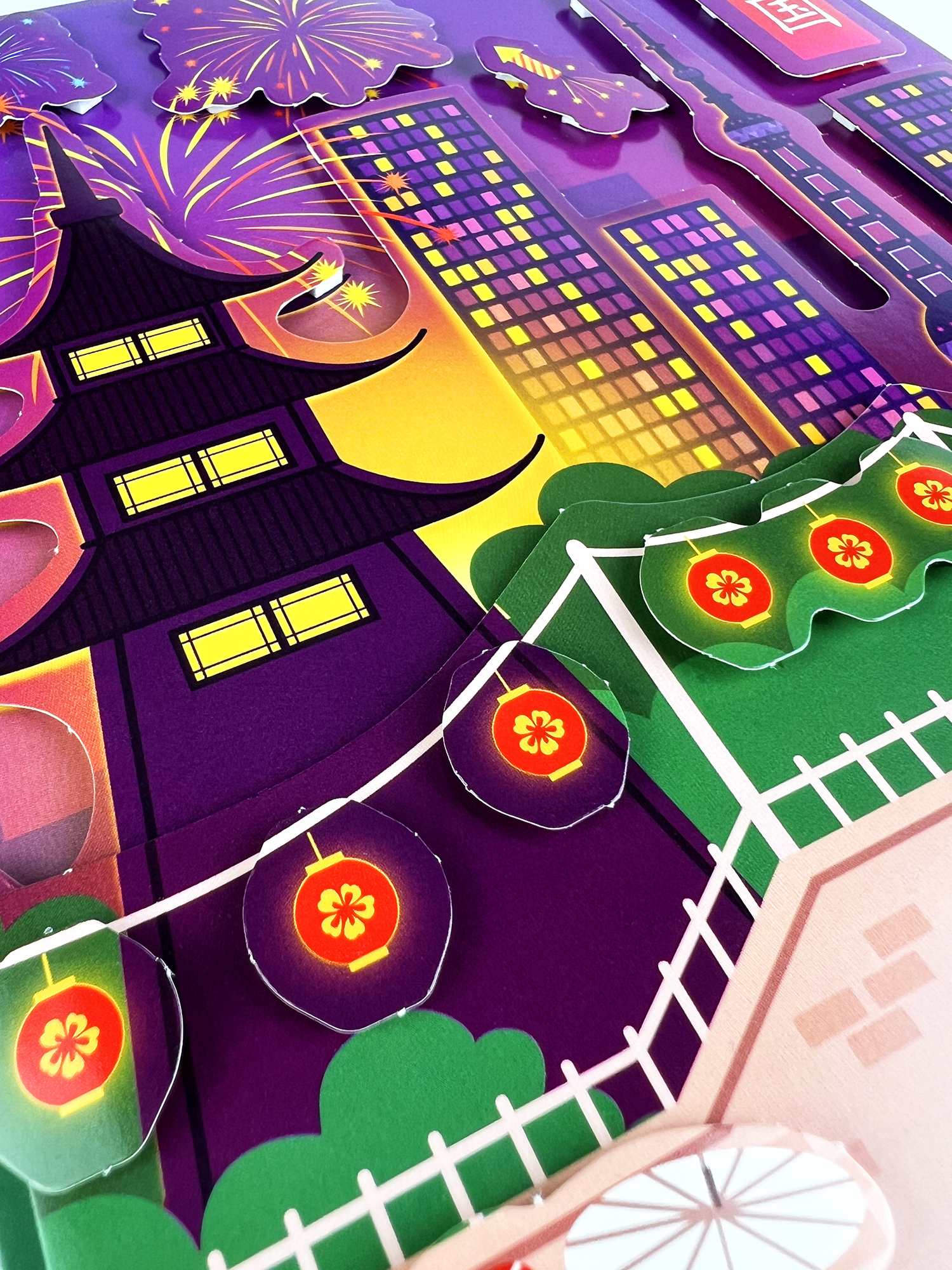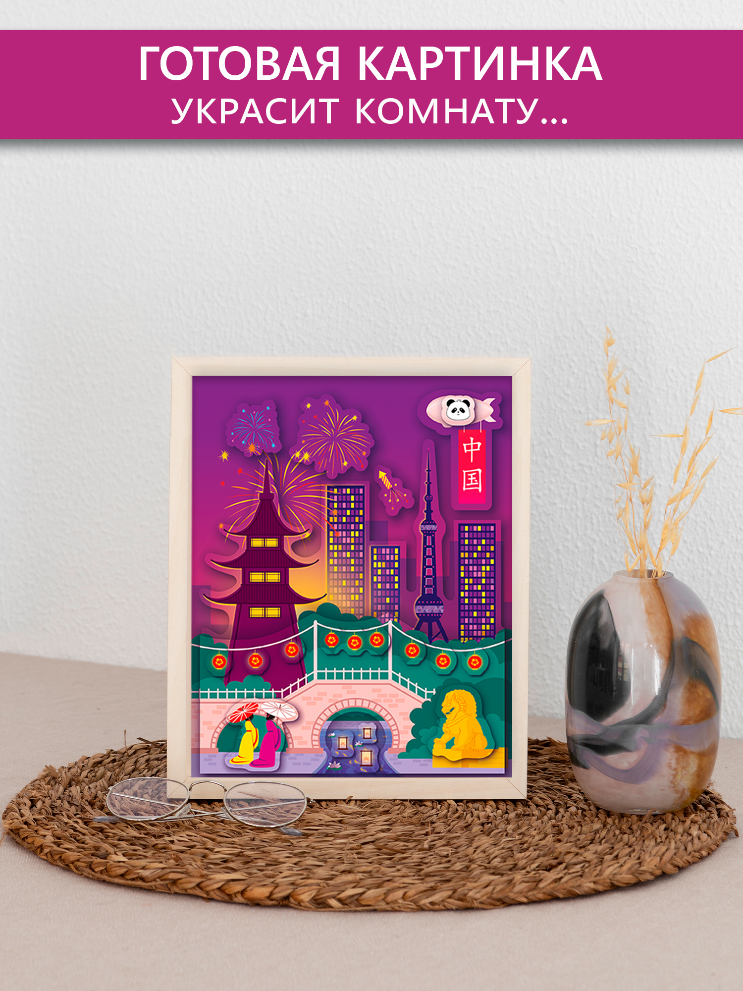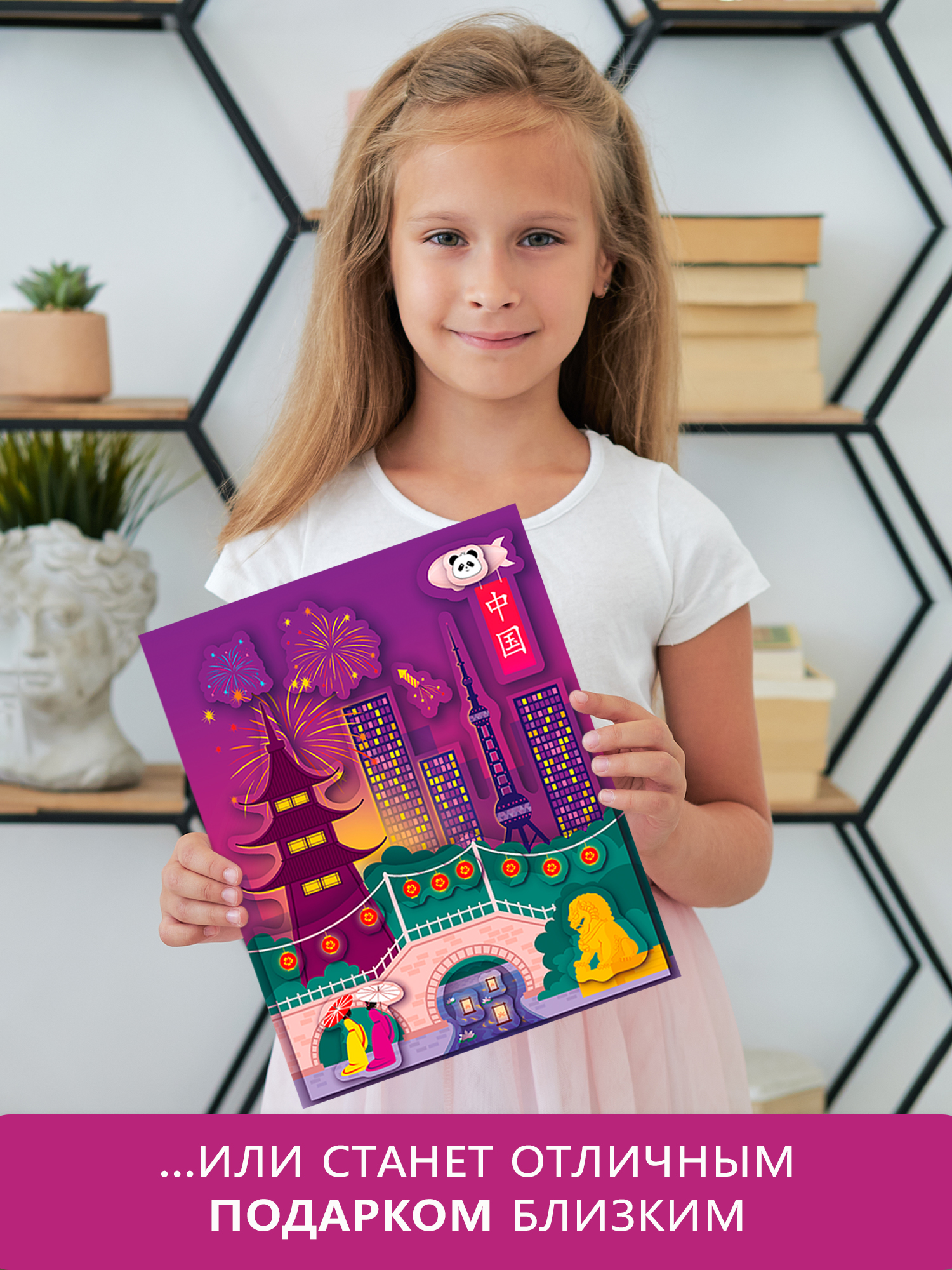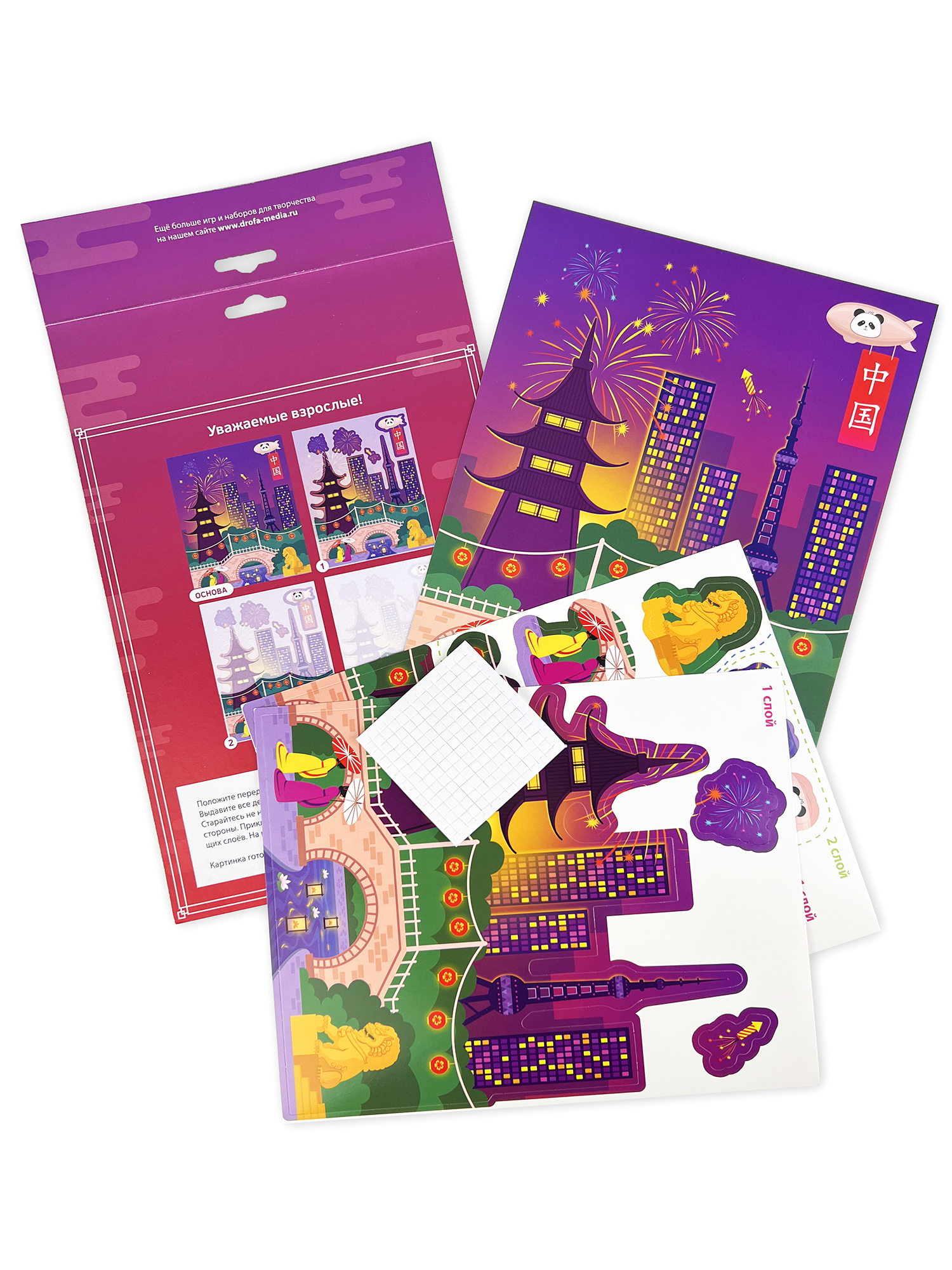 В наборе: картонная основа с рисунком, 2 листа картона с вырубленными деталями, двухсторонний скотч.