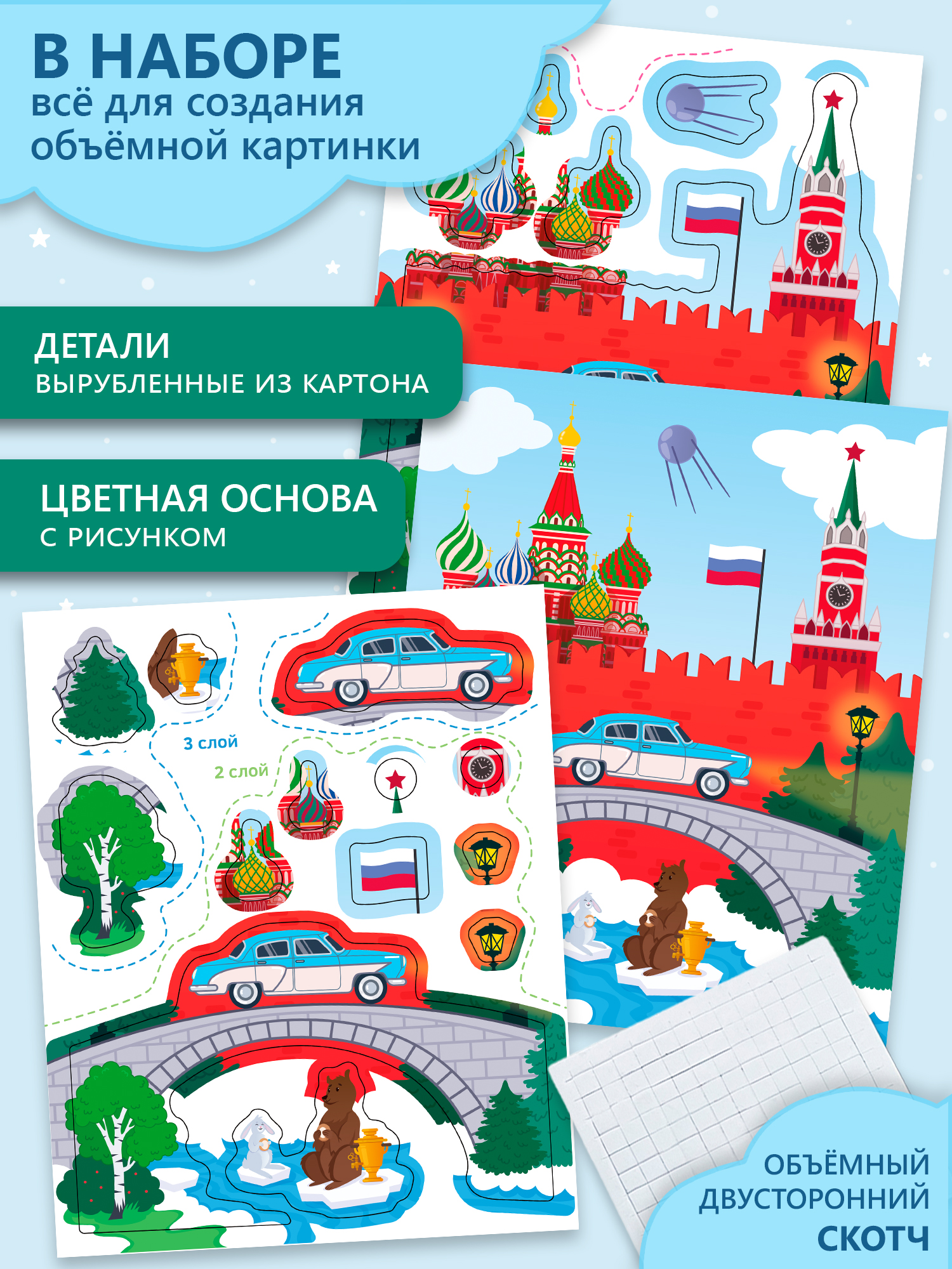 Такая картина понравится как детям, так и взрослым, каждый увидит в ней что-то своё. Детали аппликации уже вырублены, нужно только аккуратно выдавить их из основы и приклеить на картинку объёмным двусторонним скотчем. Ребёнок легко сделает объёмную 3D-картинку самостоятельно, ведь клей и ножницы ему не понадобятся. Детали аппликации нужно наклеить в несколько слоёв, чтобы плоское изображение приобрело эффект объёма.