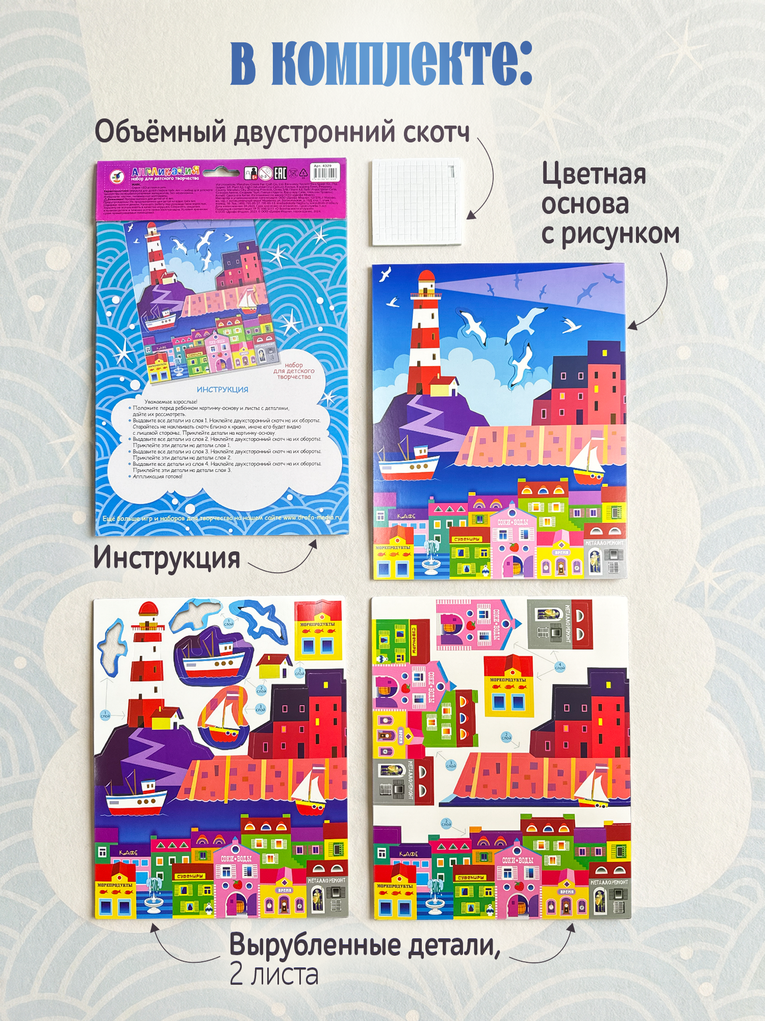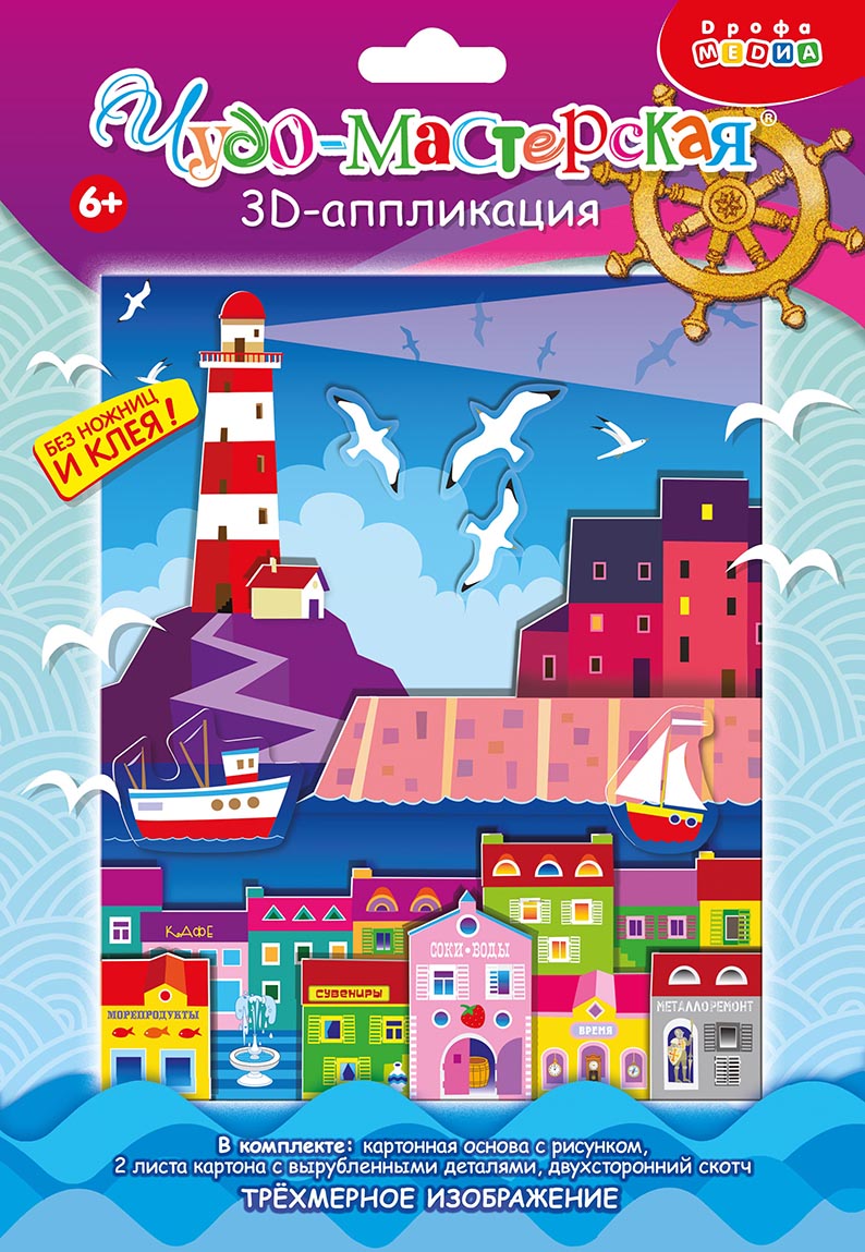 3D-аппликация — современный и очень увлекательный вид творчества. Данный набор позволит создать необыкновенно выразительную 3D-картину. Яркие и красочные детали изображения, выполненные из плотного картона, выступают над основой, создавая причудливый и сказочный мир. Этот удивительный 3D-эффект возникает благодаря использованию объёмного двустороннего скотча. Готовое изделие смотрится необыкновенно эффектно.