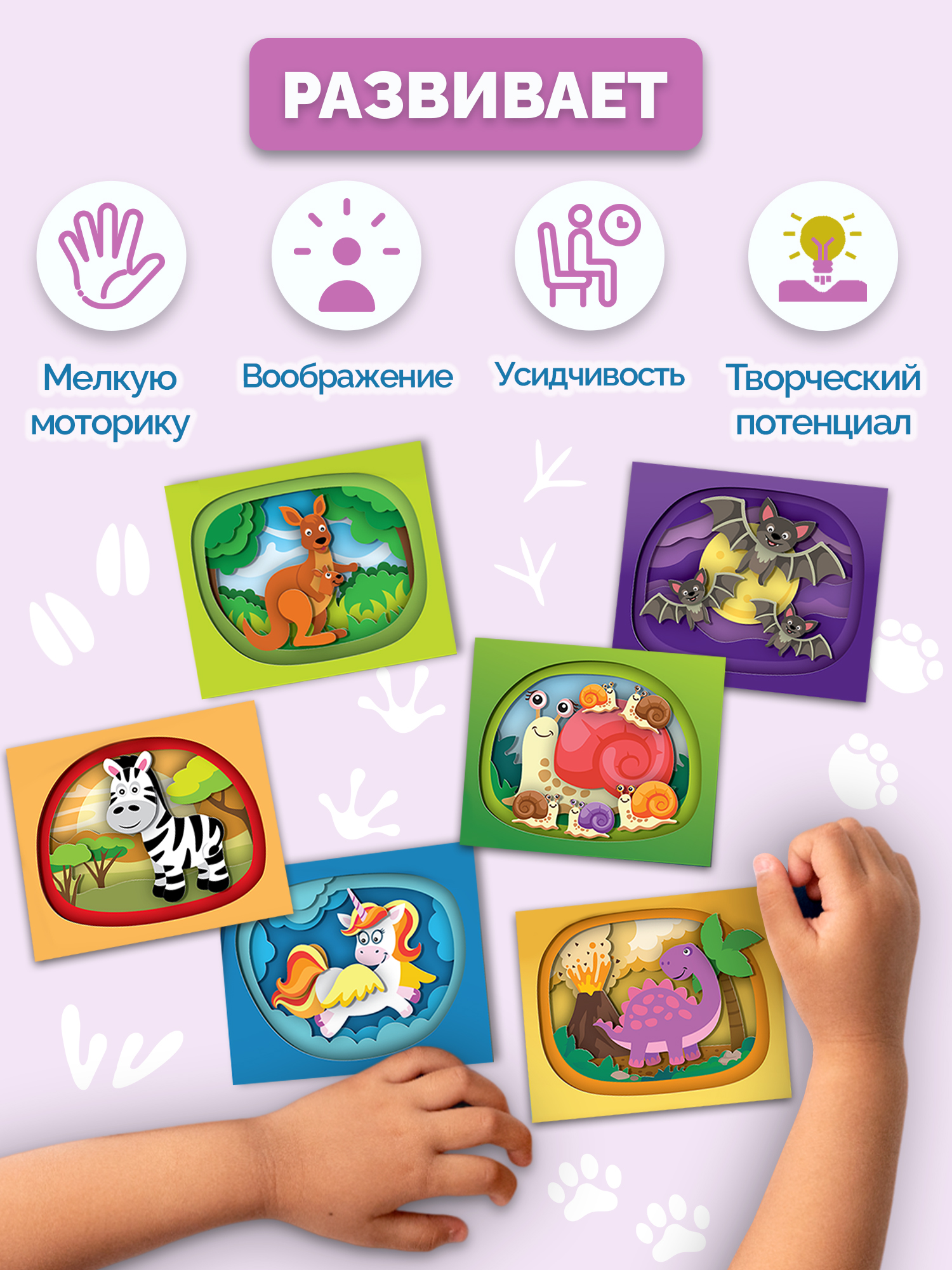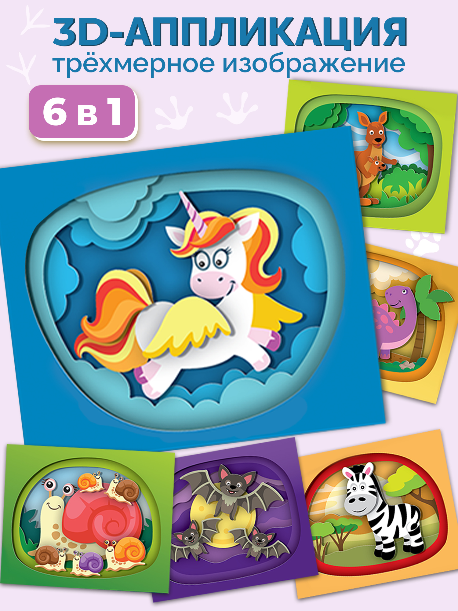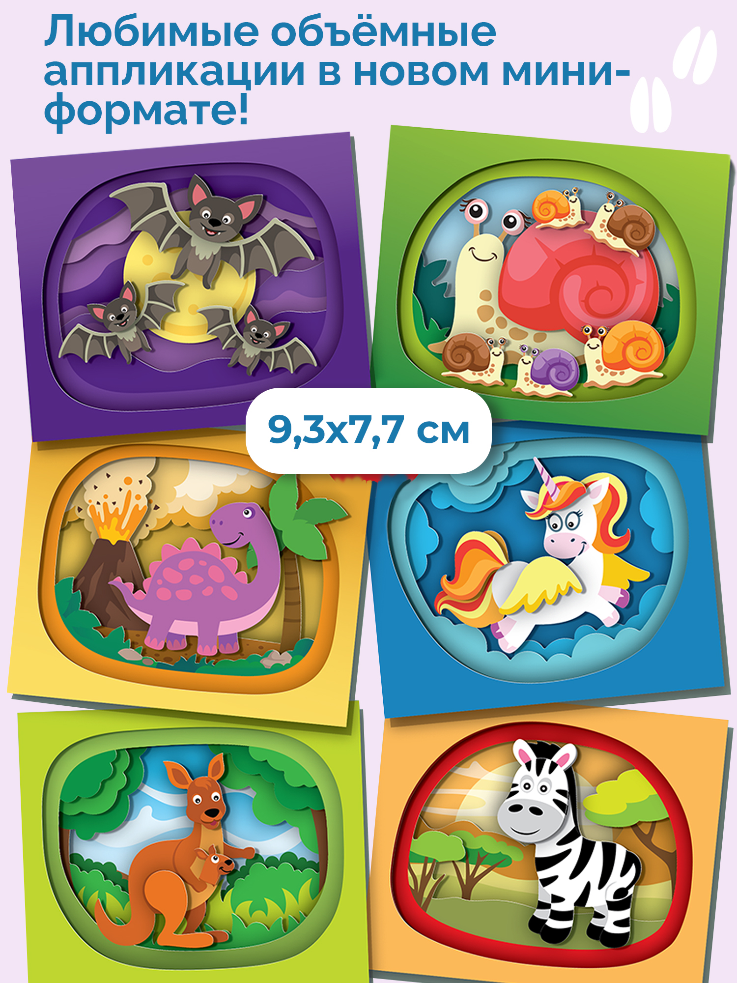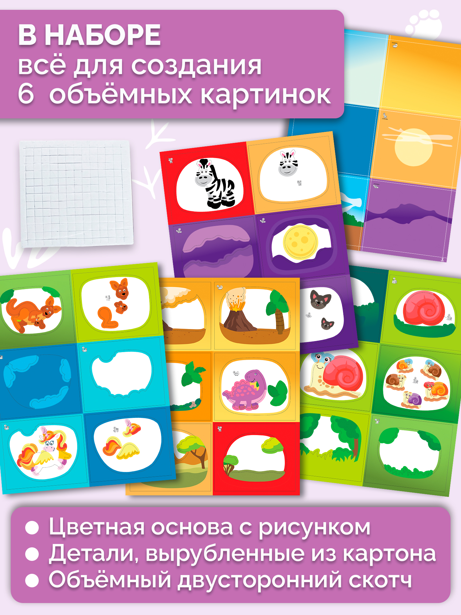 Ребёнок самостоятельно сможет создать красочную 3D-аппликацию, последовательно наклеив детали в несколько слоёв. Каждая аппликация уникальна. И каждая состоит из плоских картинок, которые чудесным образом собираются в глубокое, объёмное изображение.