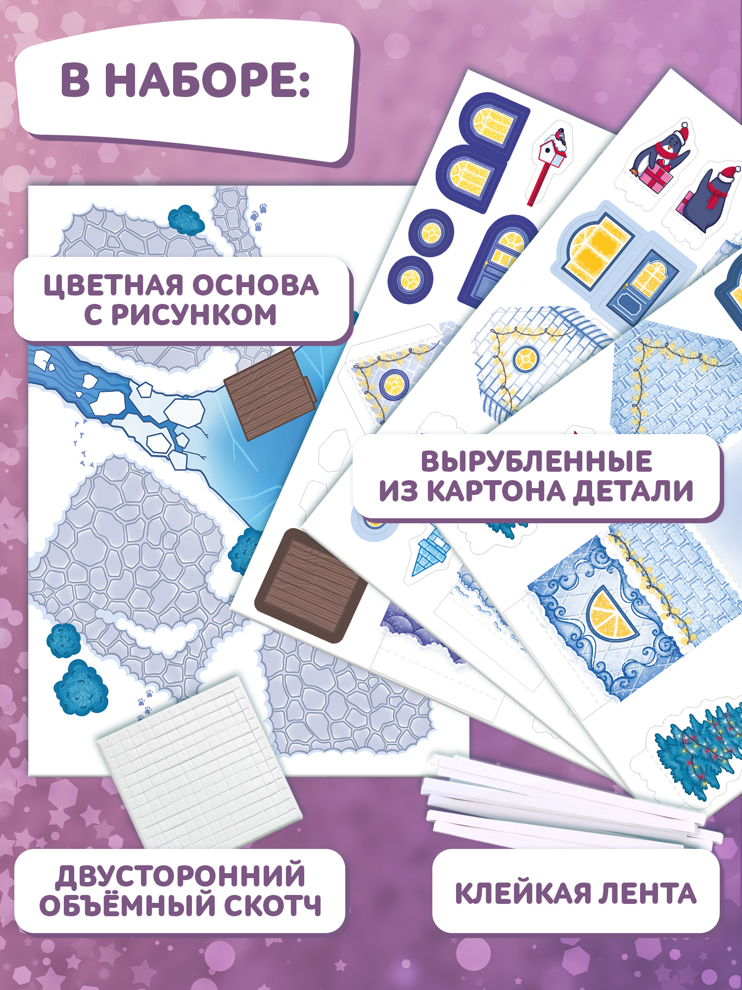 В наборе: цветная основа с рисунком, 3 листа с выкройкой домиков и детали, двусторонний скотч, клейкая лента.