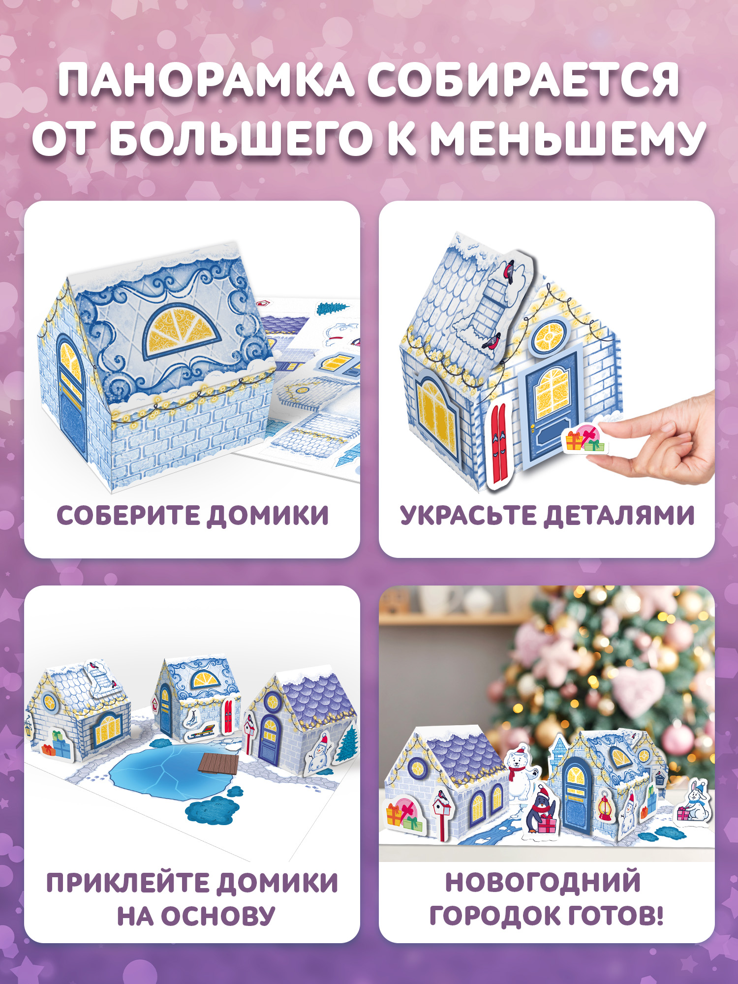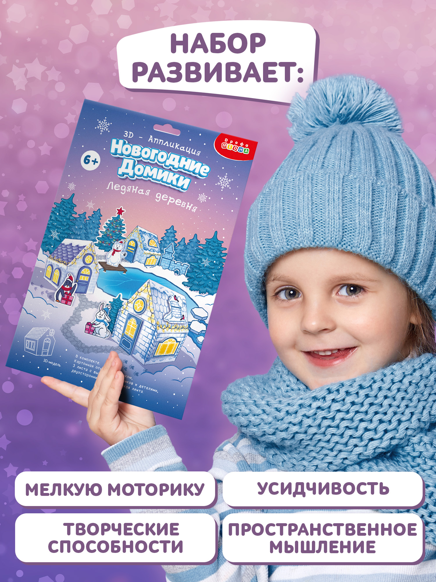 3D-аппликация – современный и очень увлекательный вид творчества. Наши 3D-аппликации абсолютно безопасны для детей, ребёнок самостоятельно сможет построить свою новогоднюю деревню, клей и ножницы ему не нужны.