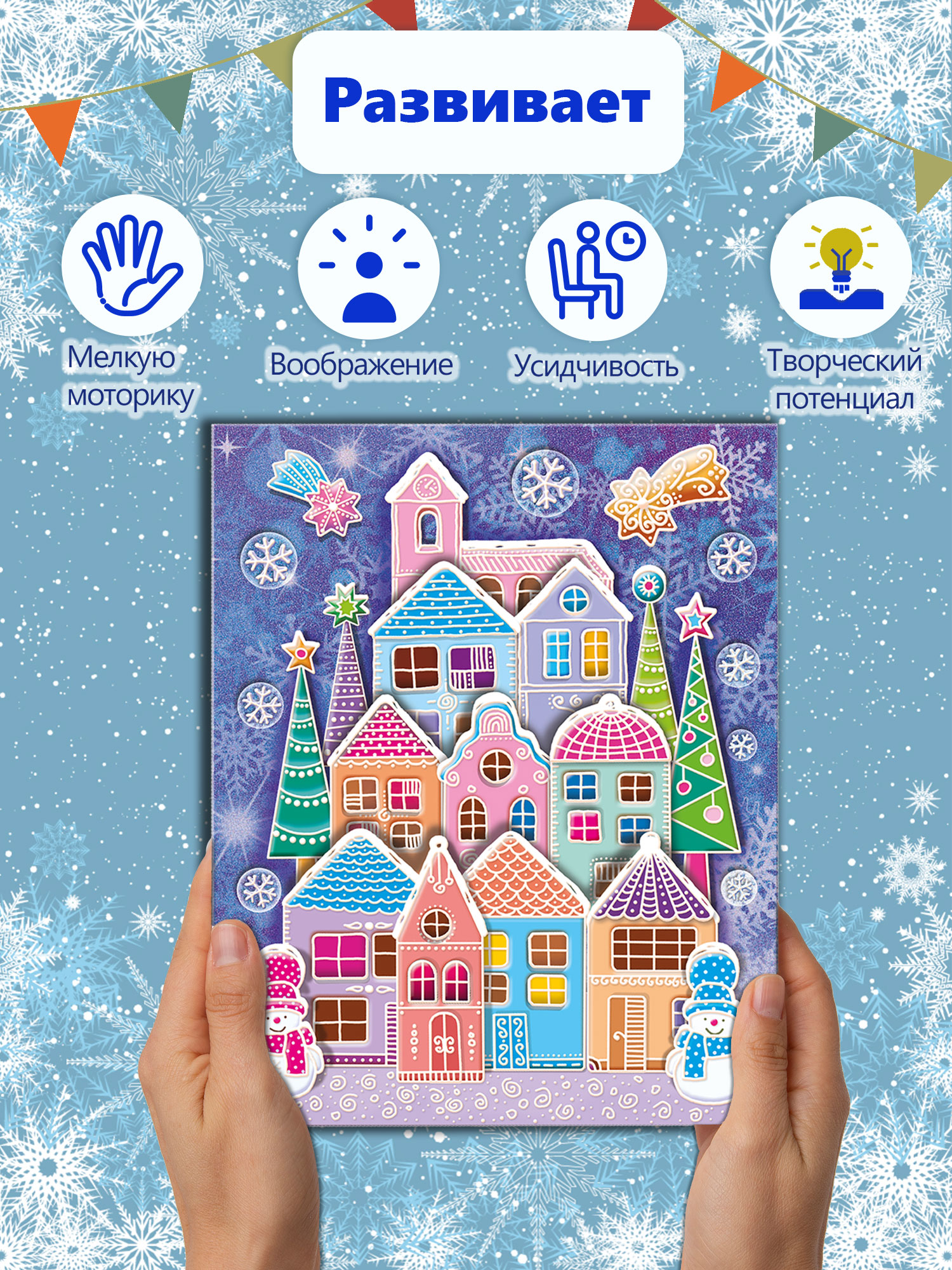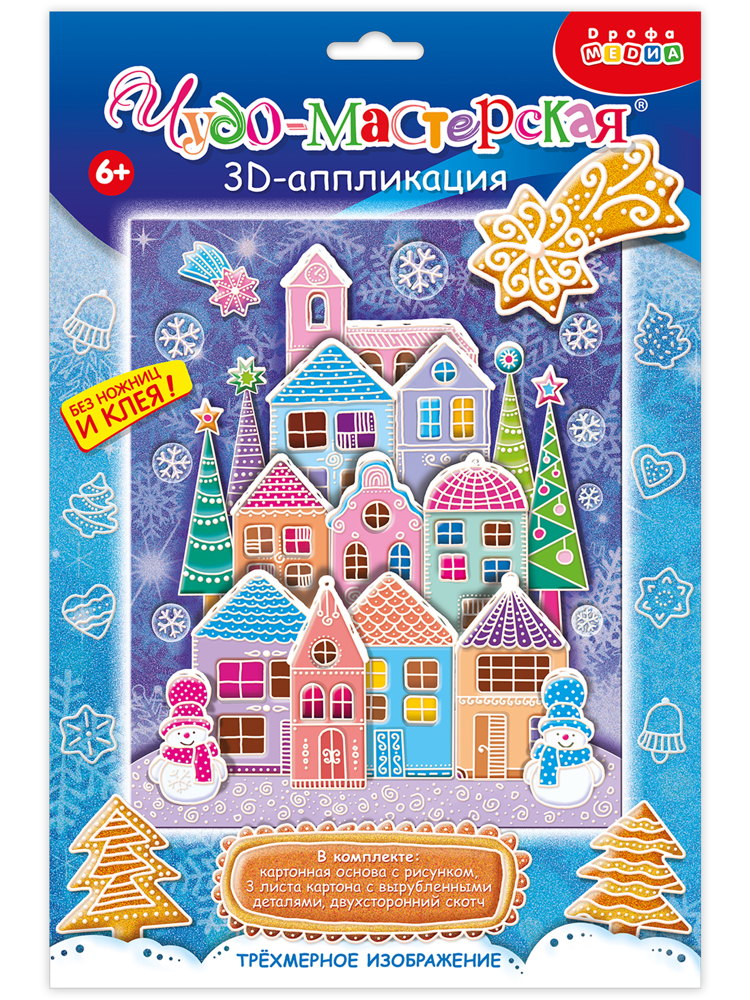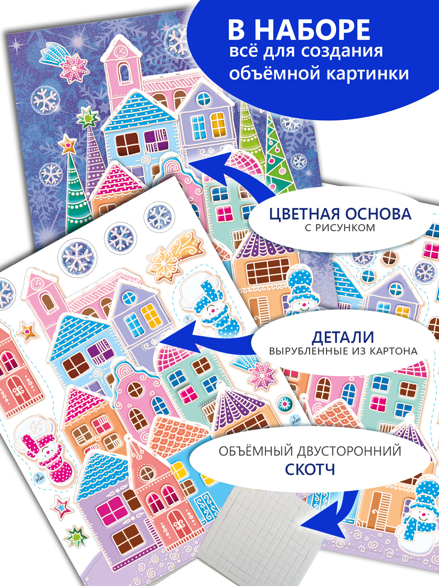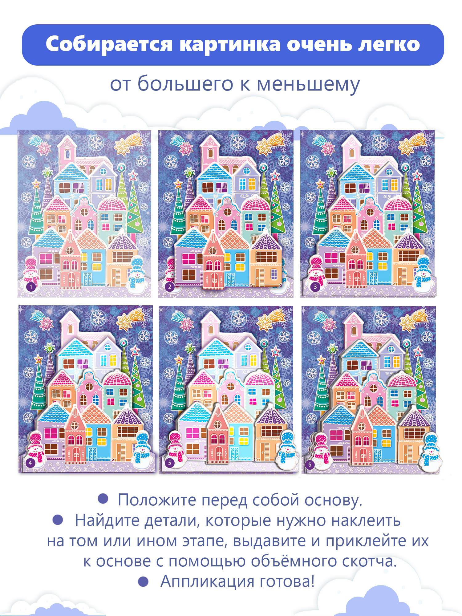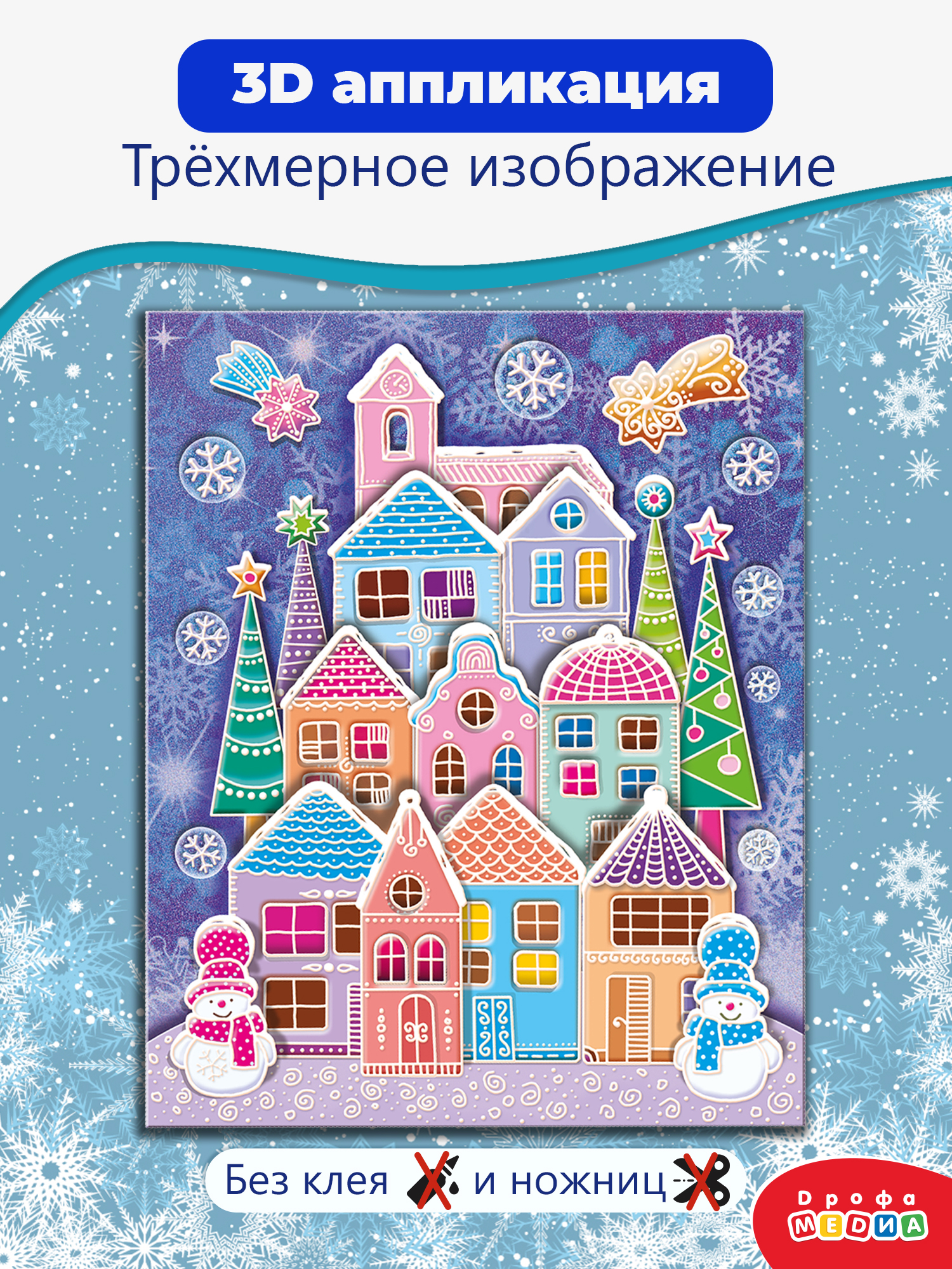 3D-аппликация — современный и очень увлекательный вид творчества. Ребёнок легко сделает объёмную 3D-картинку самостоятельно, ведь клей и ножницы ему не понадобятся. Детали аппликации уже вырублены, нужно только аккуратно выдавить их из основы и приклеить на картинку объёмным двусторонним скотчем. Домики, снежинки и снеговички наклеиваются в несколько слоёв, что придаёт плоскому изображению эффект объёма.