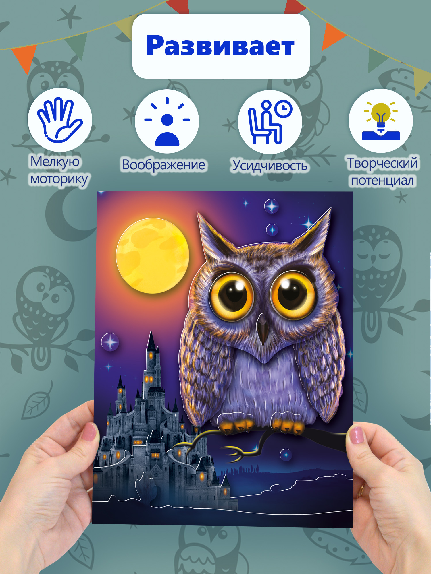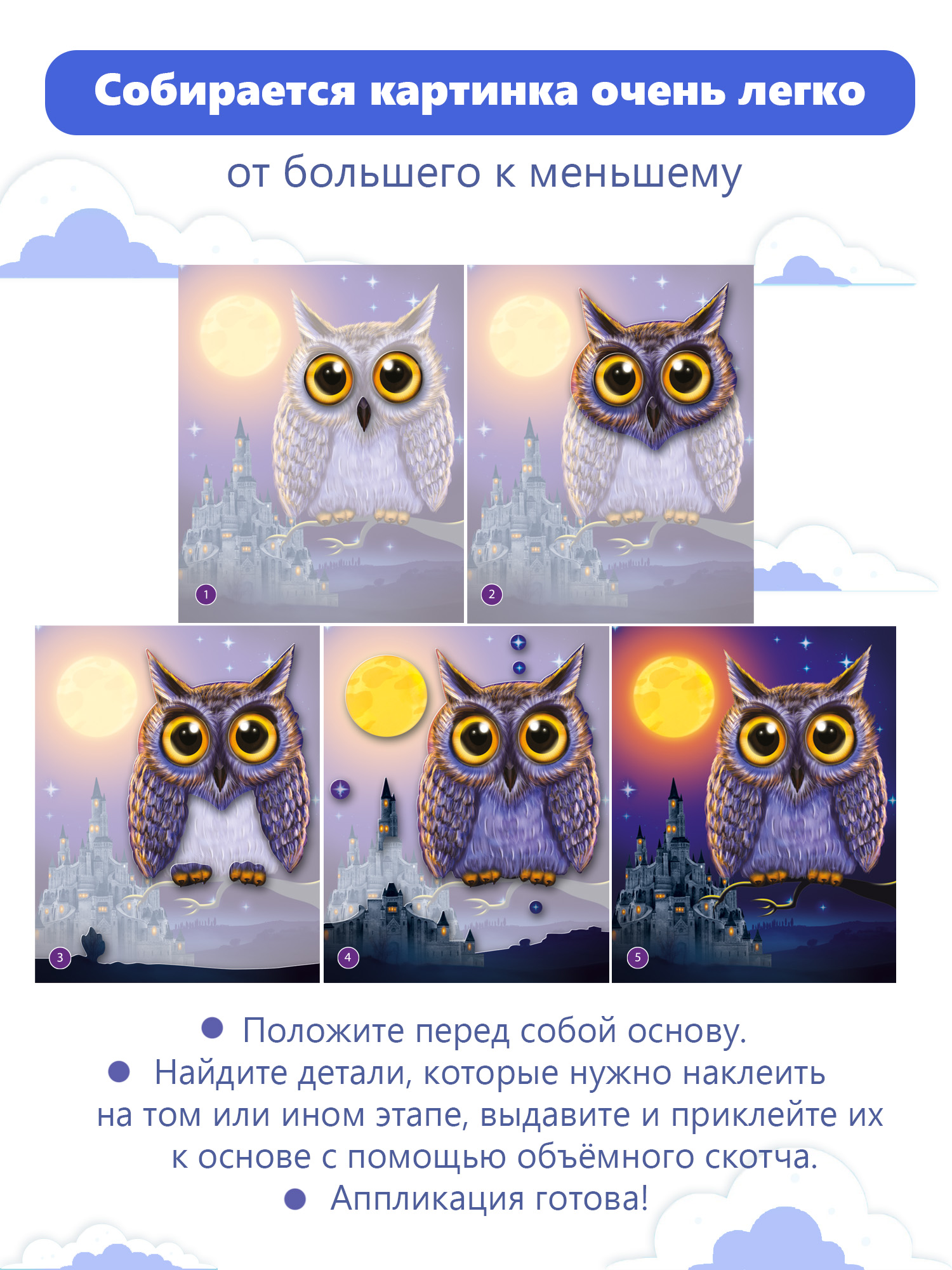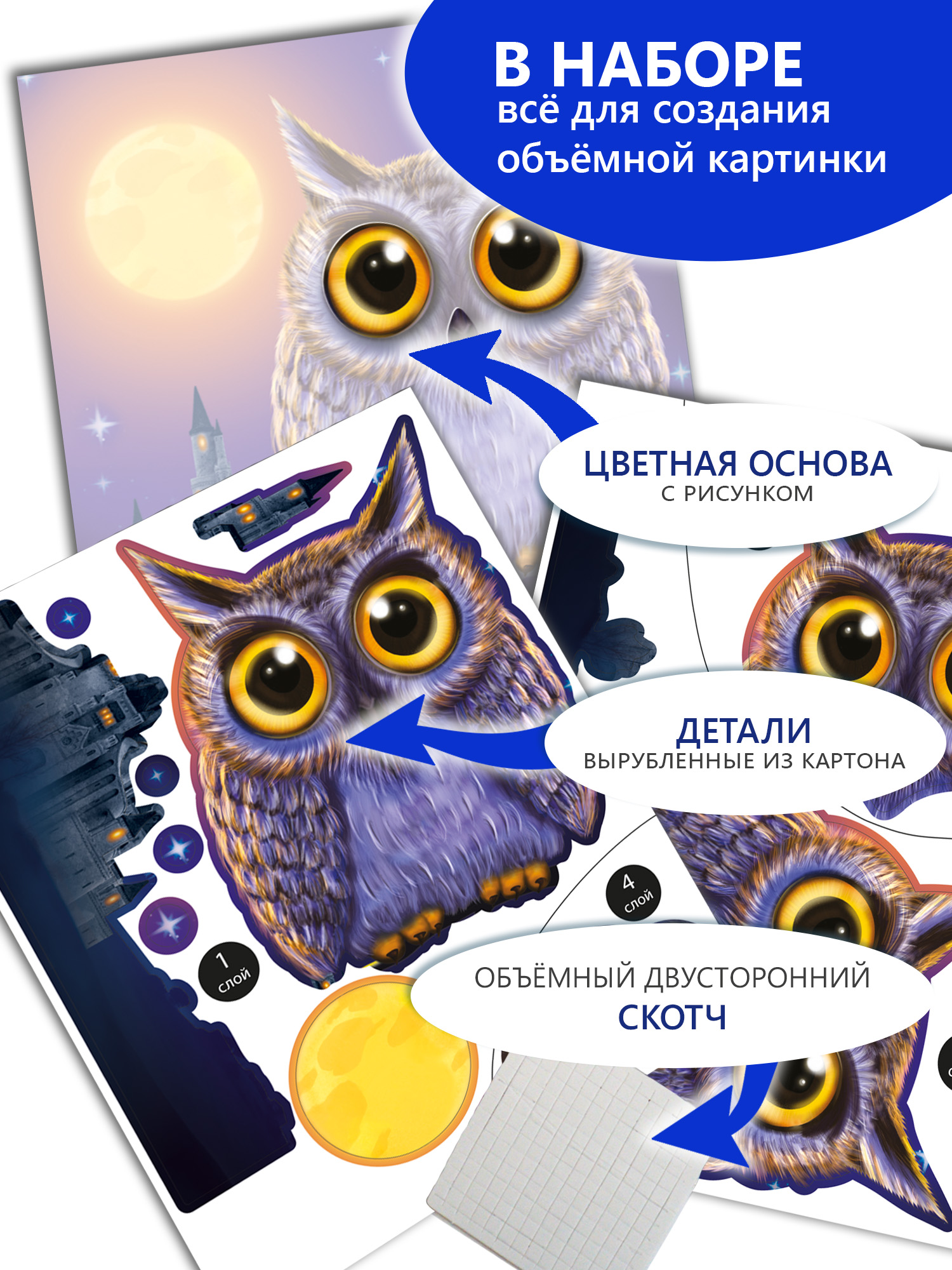 3D-аппликация — современный и очень увлекательный вид творчества. Данный набор позволит создать необыкновенно выразительную 3D-картину. Яркие и красочные детали изображения, выполненные из плотного картона, выступают над основой, создавая причудливый и сказочный мир. Этот удивительный 3D-эффект возникает благодаря использованию объёмного двустороннего скотча. Готовое изделие смотрится необыкновенно эффектно.