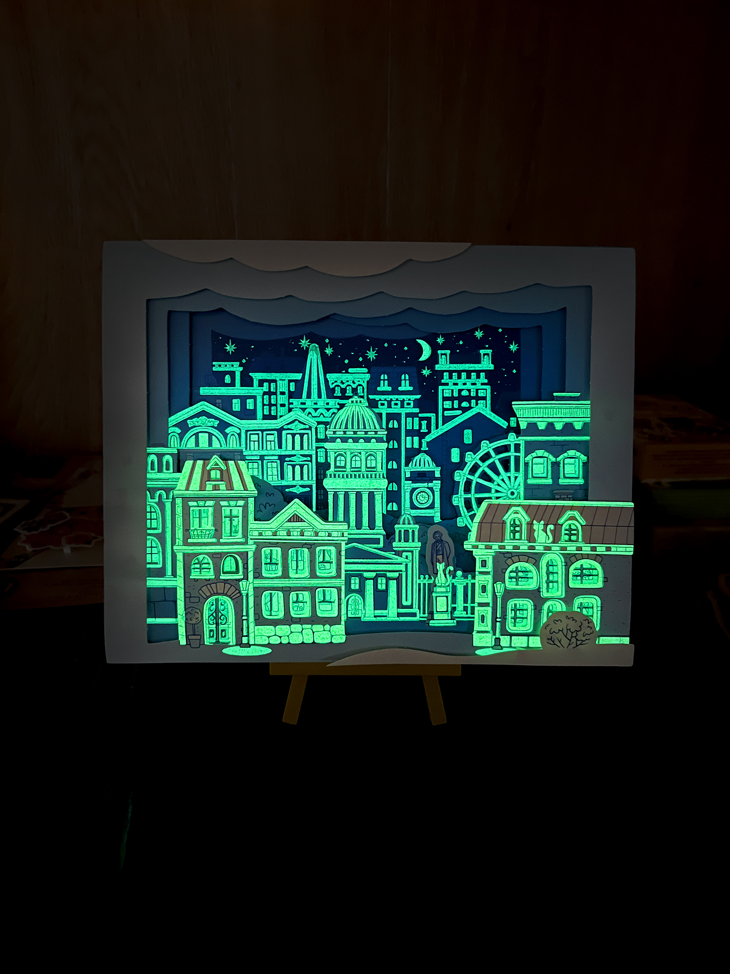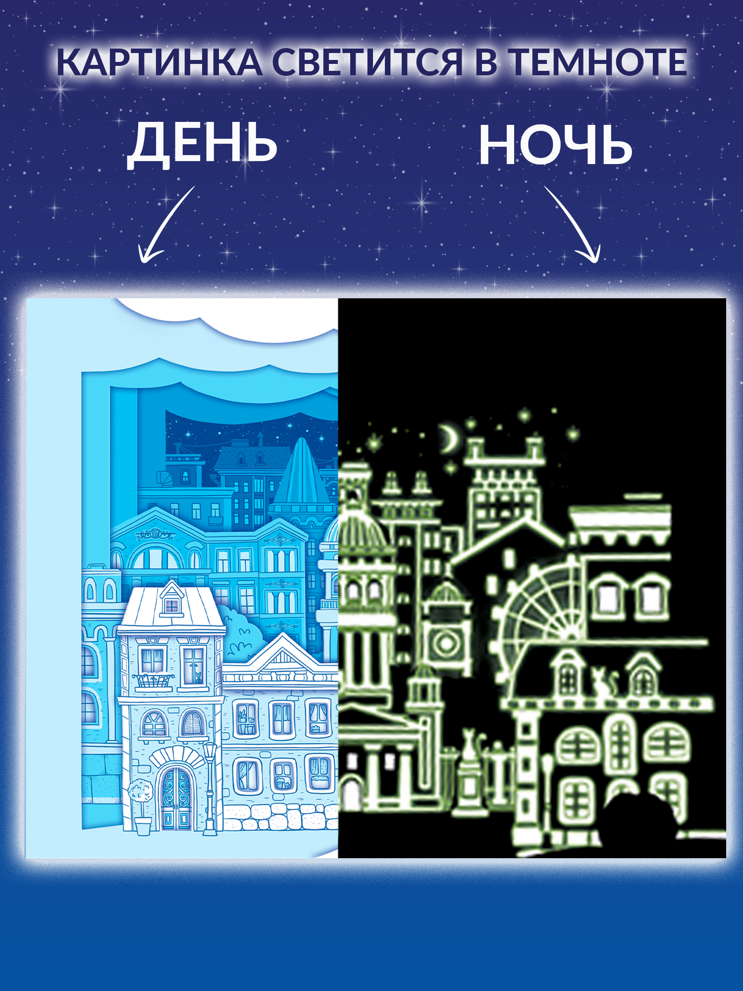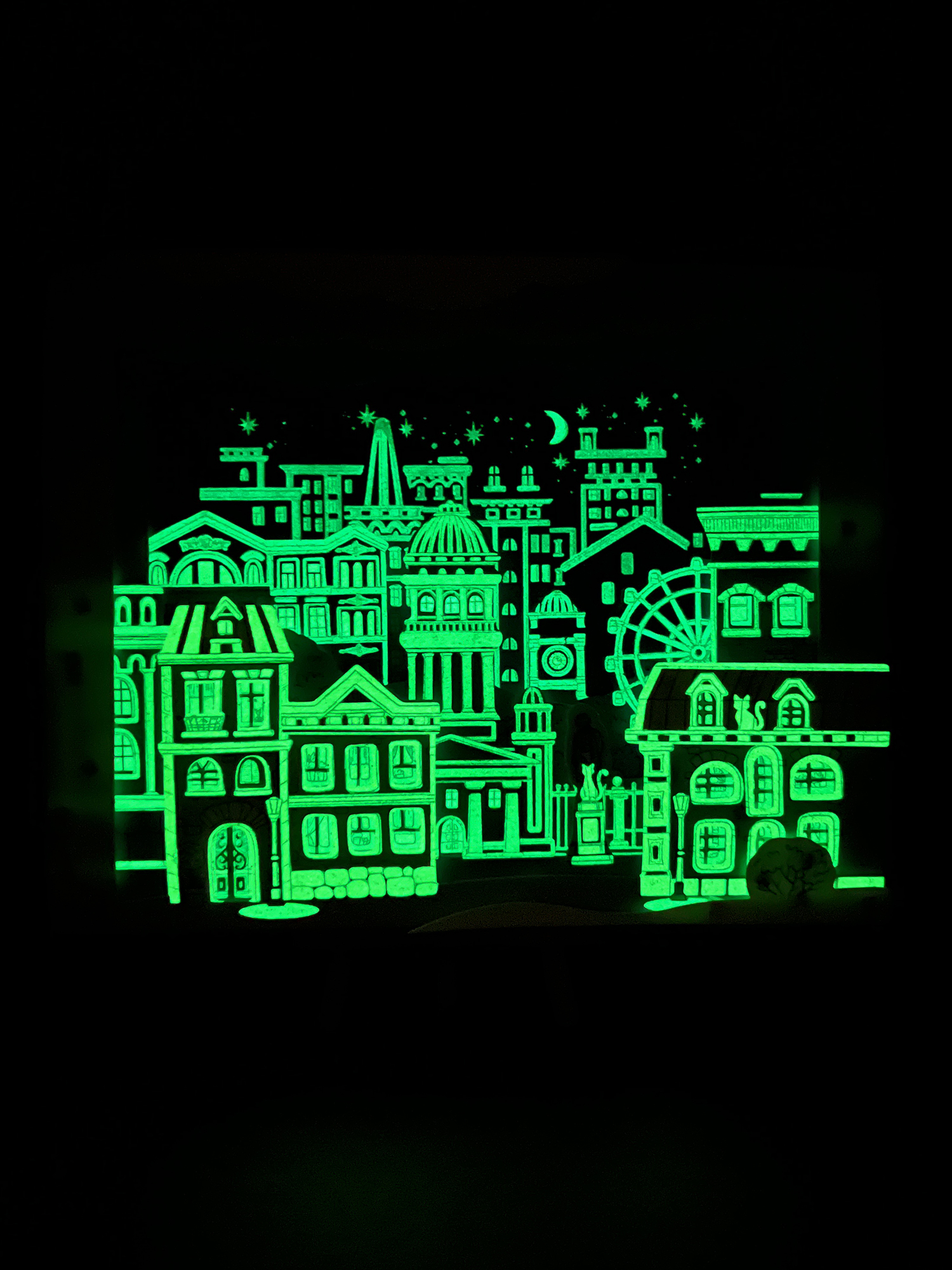Чтобы картинка лучше светилась, предварительно подержите ее перед ярким источником света 1 минуту или посветите на нее фонариком.