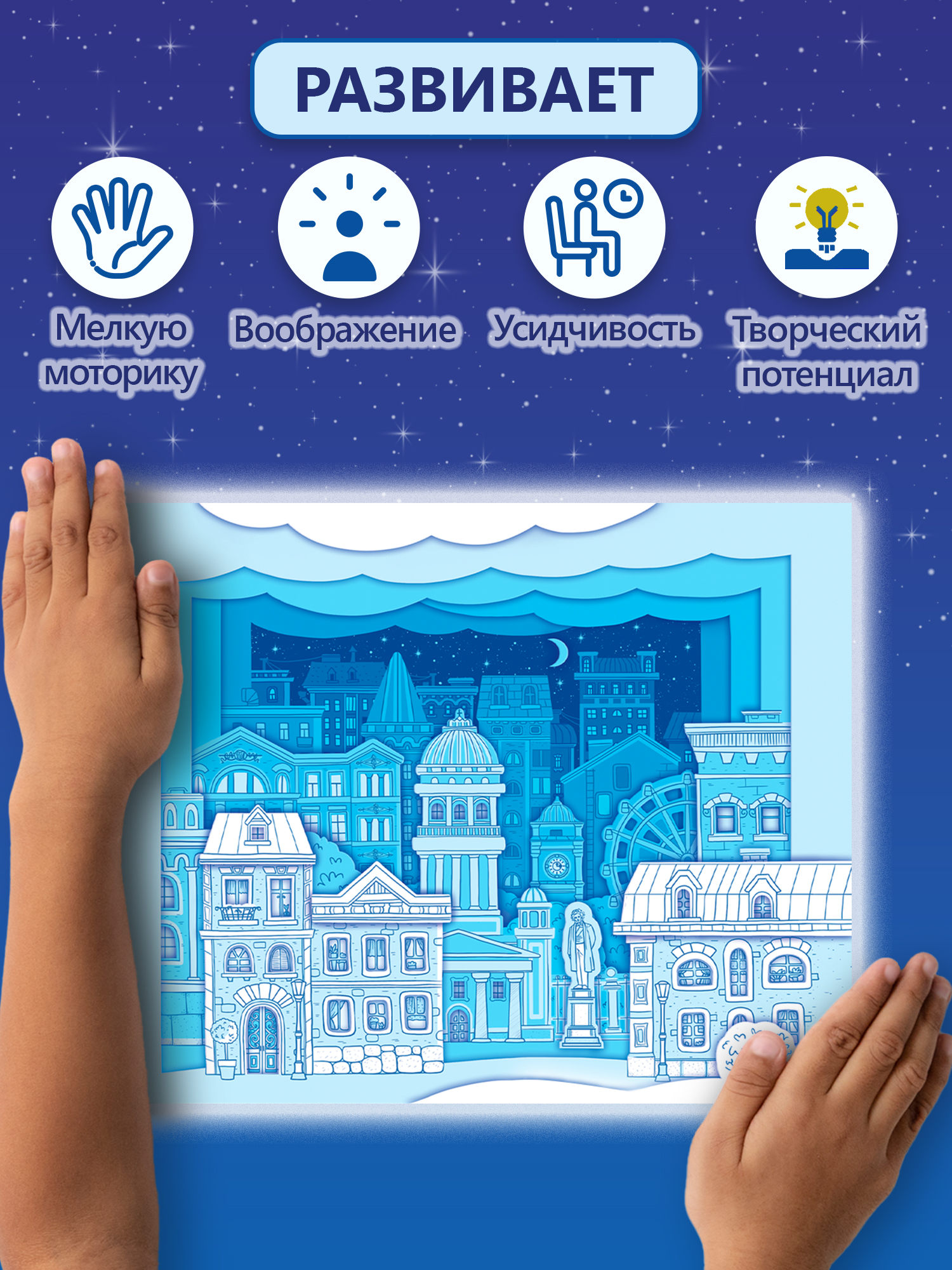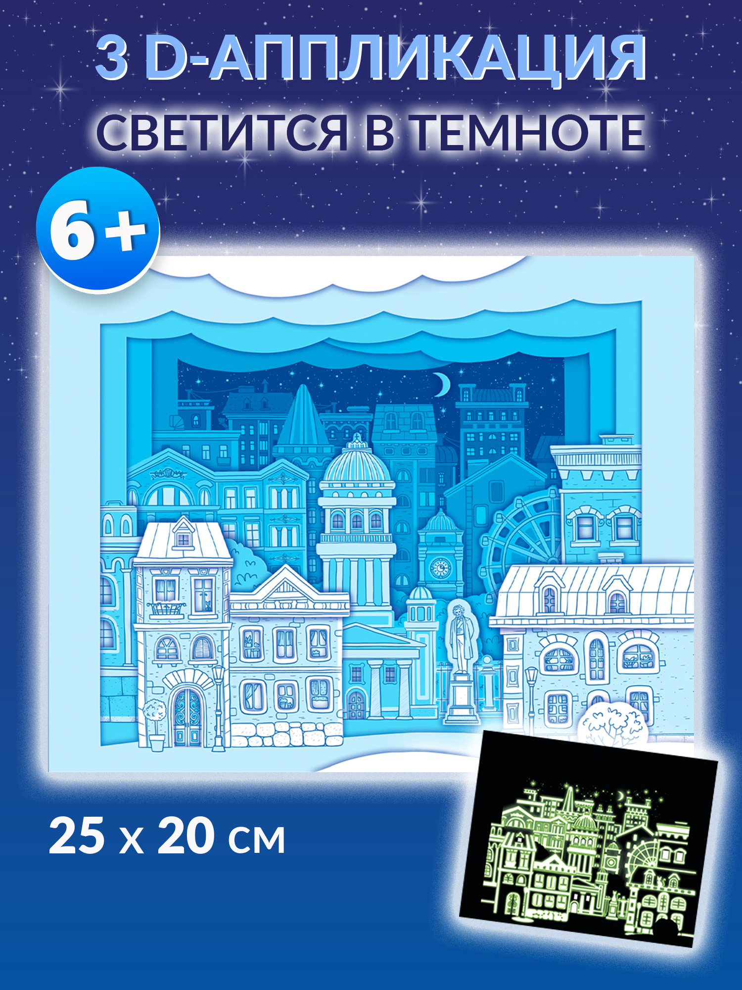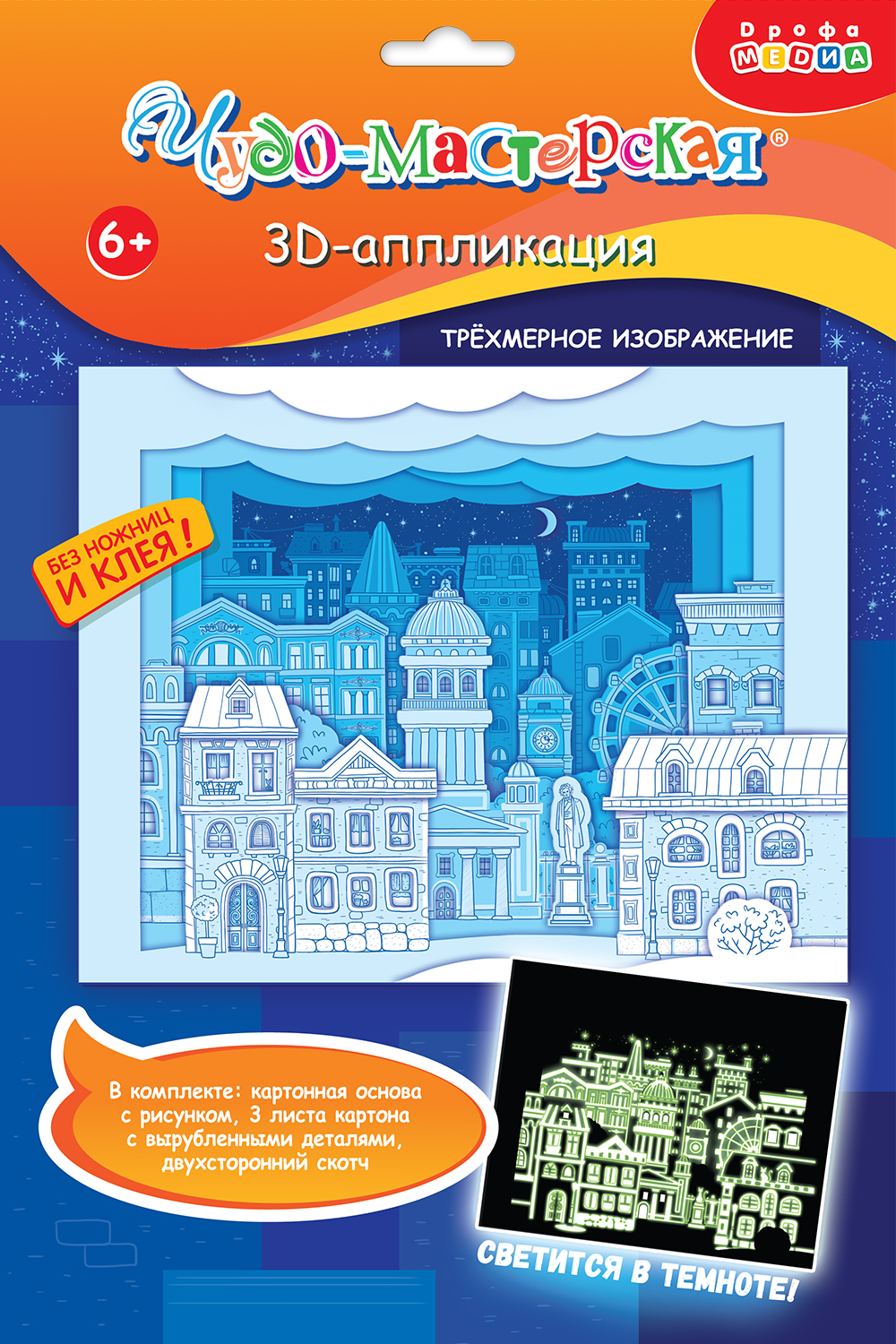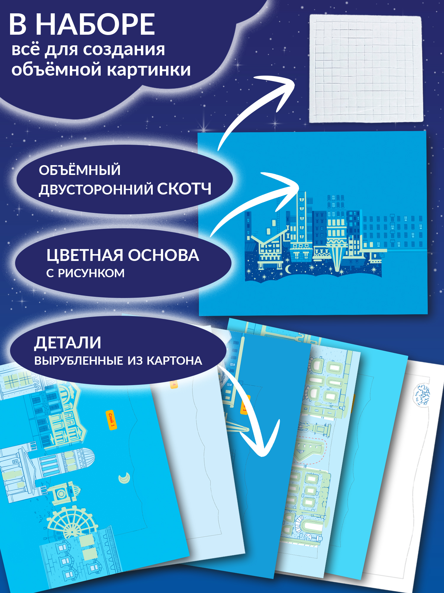 3D-аппликация – современный и очень увлекательный вид творчества. Уникальность нашей аппликации в том, что она светится в темноте. В творческом наборе вы найдёте готовые детали для аппликации из плотного картона, которые нужно приклеить на картинку с помощью объёмного двустороннего скотча.