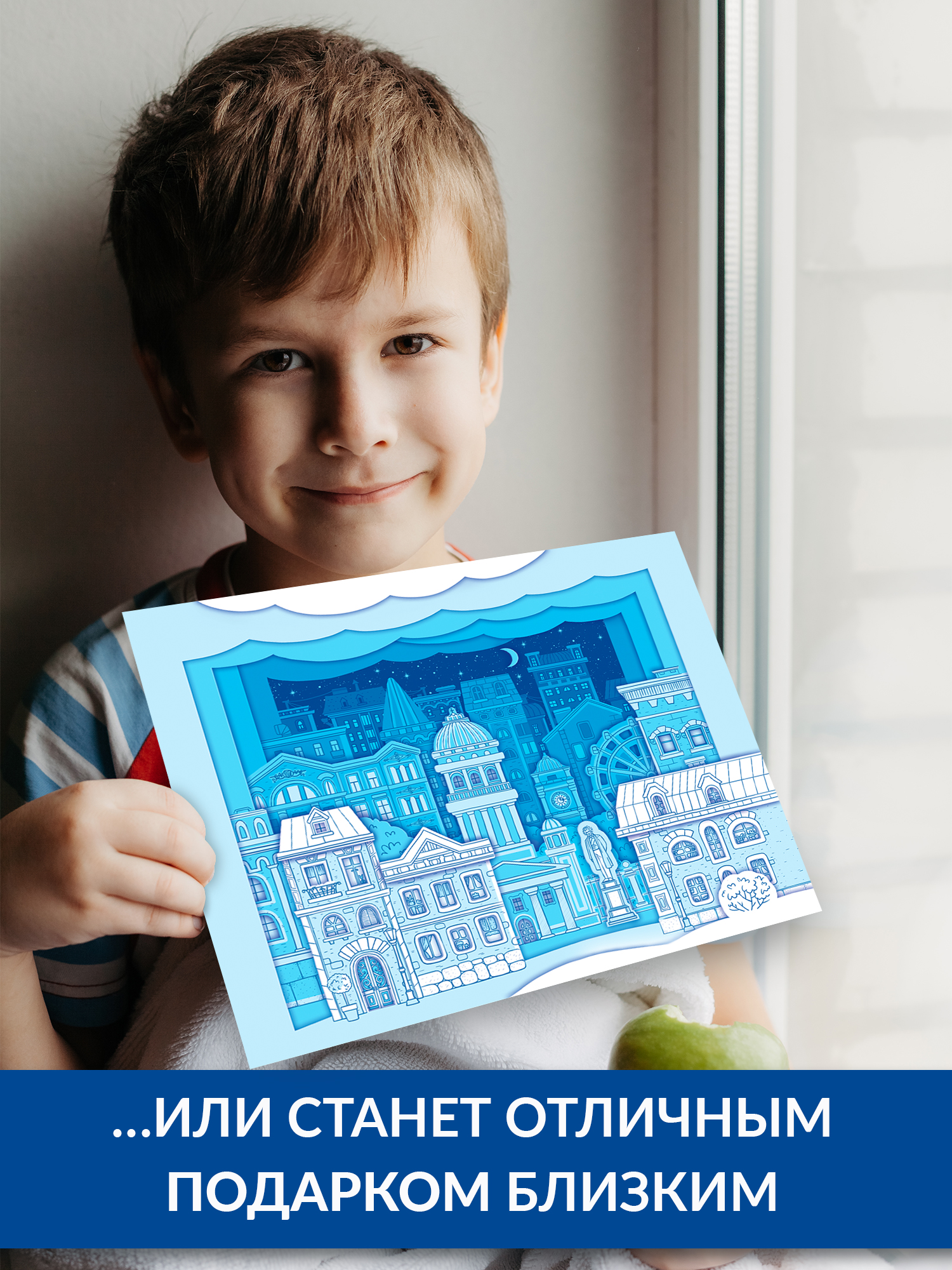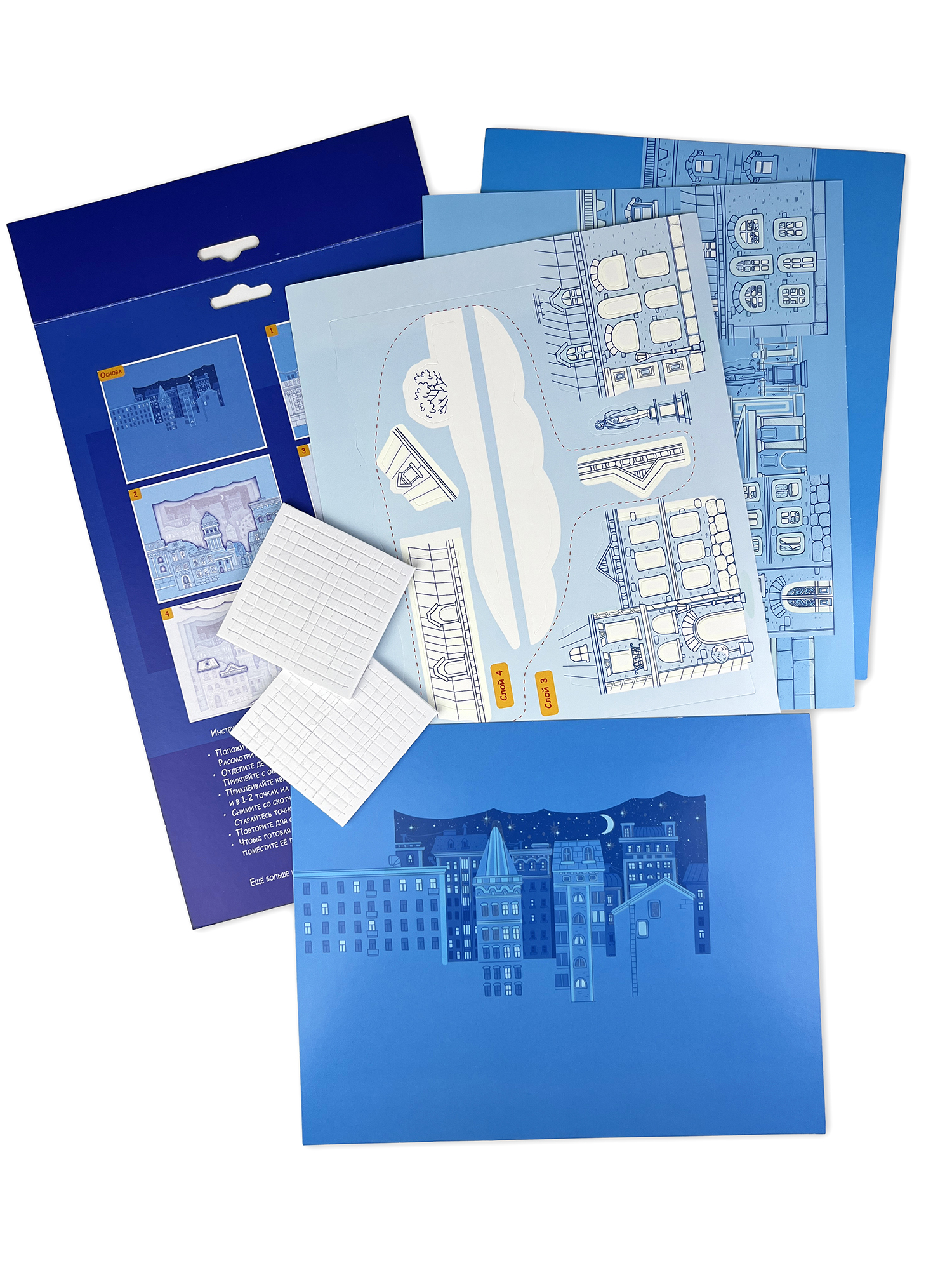 Ребёнок легко справится с набором для творчества самостоятельно, ведь ему не нужны клей и ножницы, а простая и понятная инструкция входит в комплект. Все детали для поделки из бумаги уже вырезаны и готовы к работе. Нужно лишь приклеить их в подходящее место на двусторонние клейкие квадратики, предварительно сняв их с защитного слоя. Последовательность приклеивания показана в инструкции. Найти нужную деталь можно по номеру слоя.