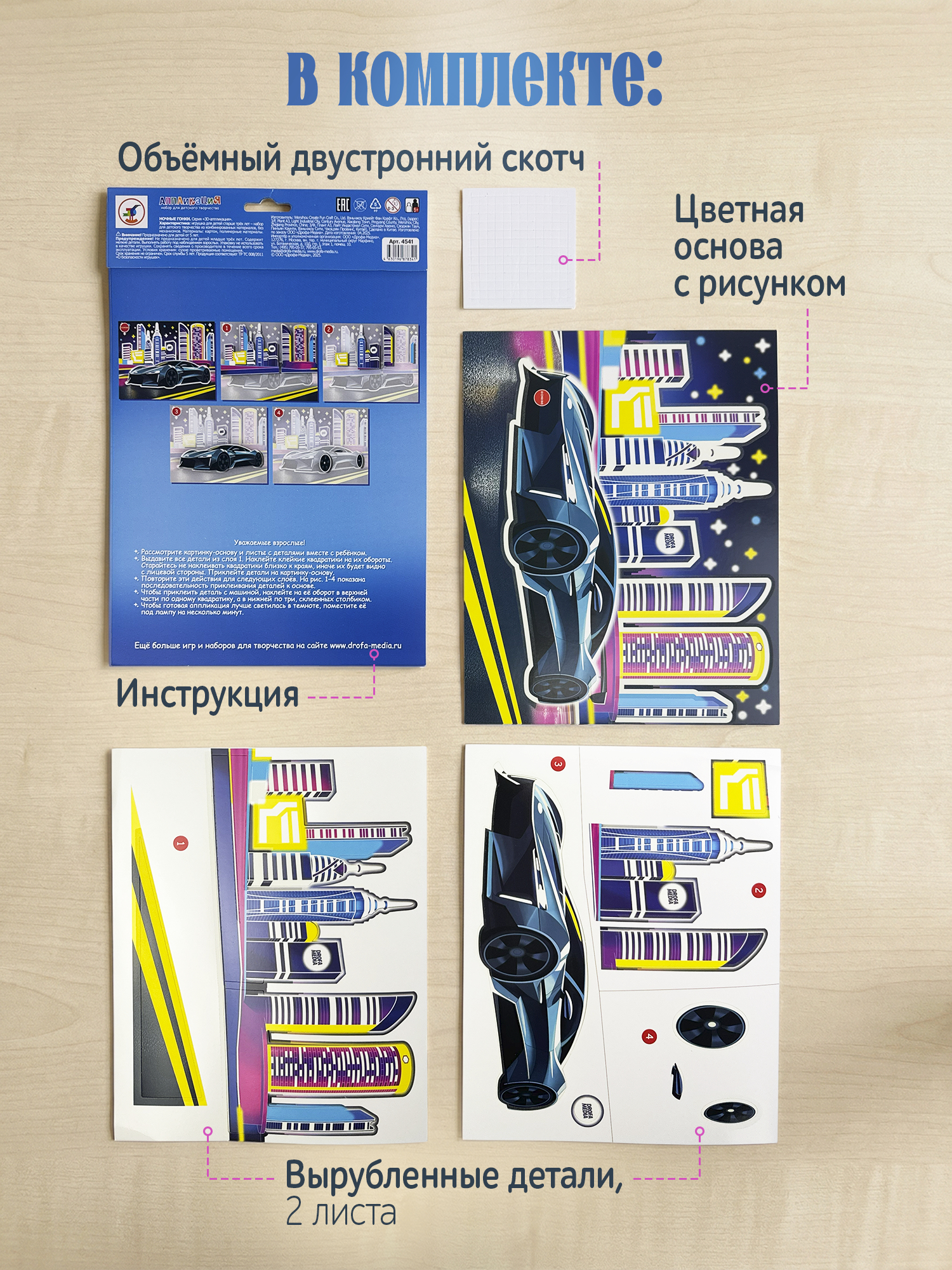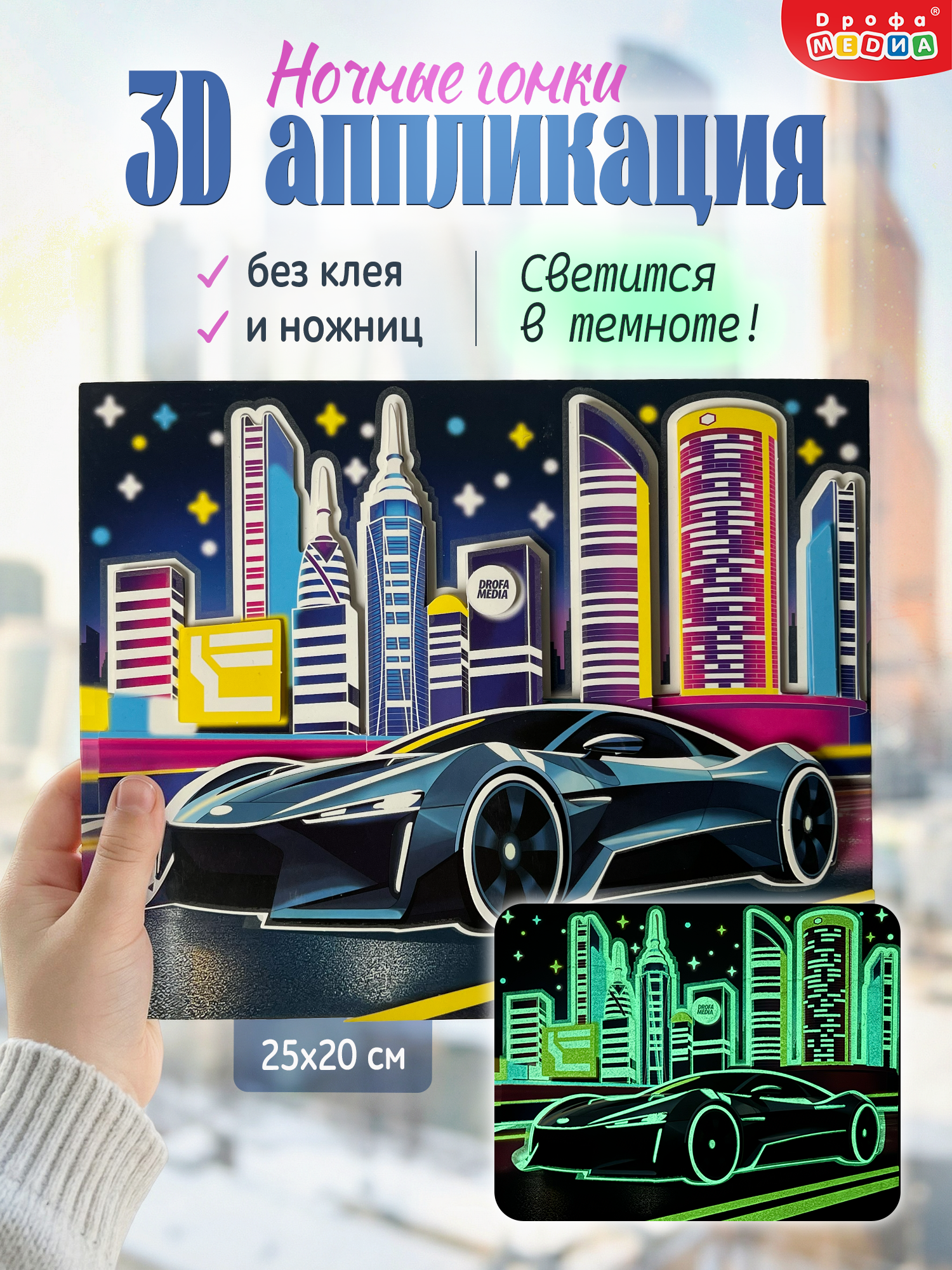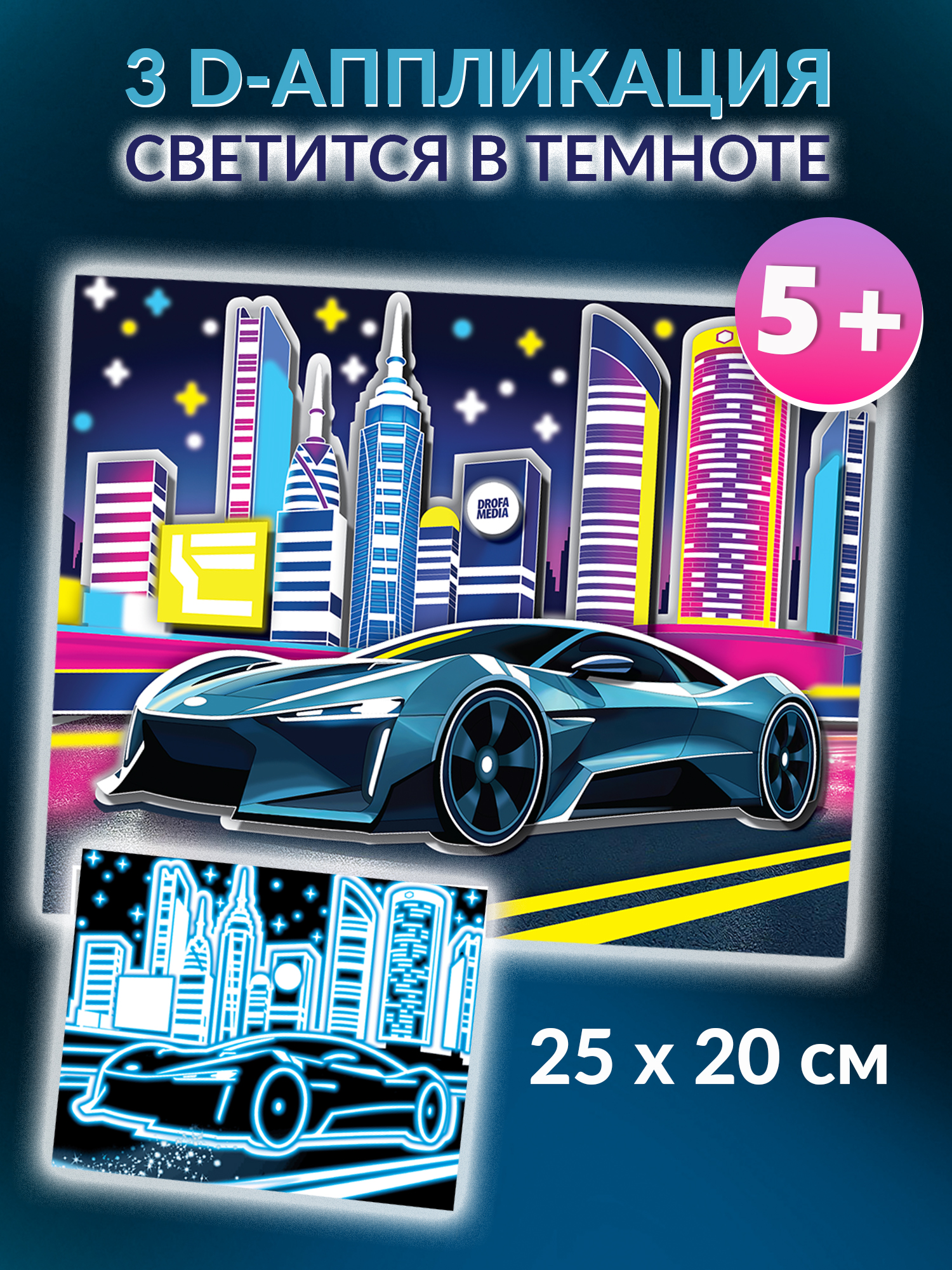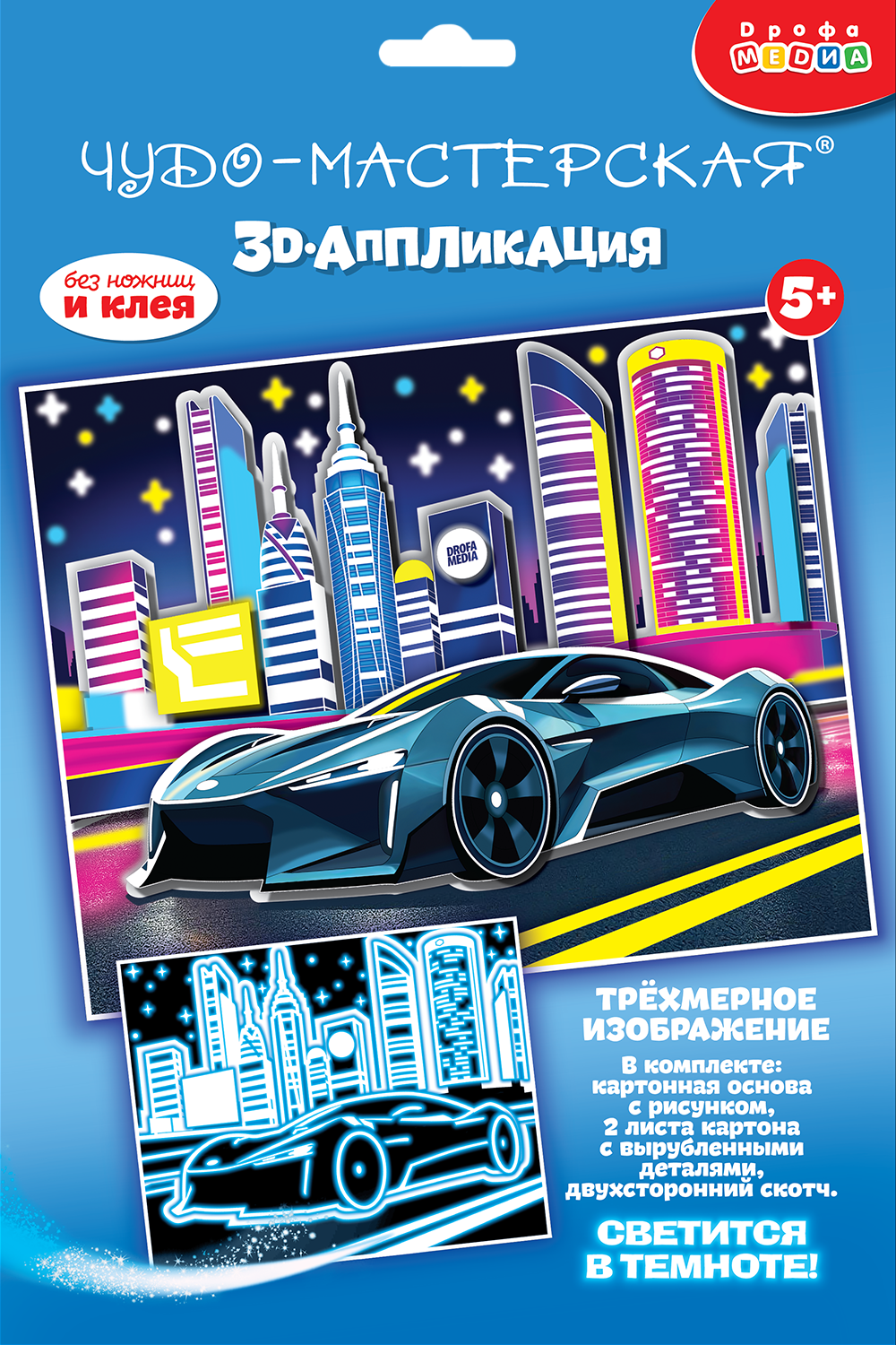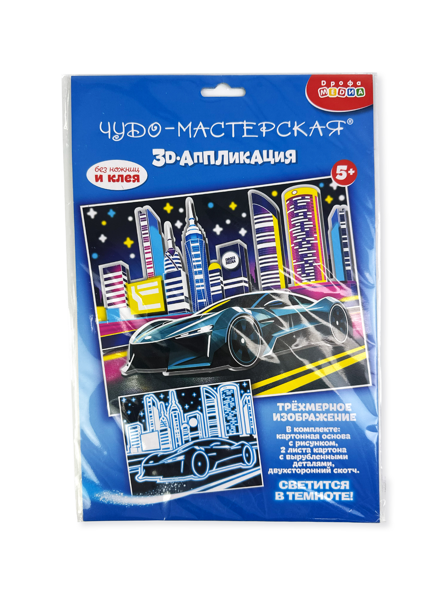 3D-аппликация – современный и очень увлекательный вид творчества. Уникальность нашей аппликации в том, что она не только создает эффект 3D-картины, но и светится в темноте. В творческом наборе вы найдёте готовые детали для аппликации из плотного картона, которые нужно приклеить на картинку с помощью двустороннего скотча.