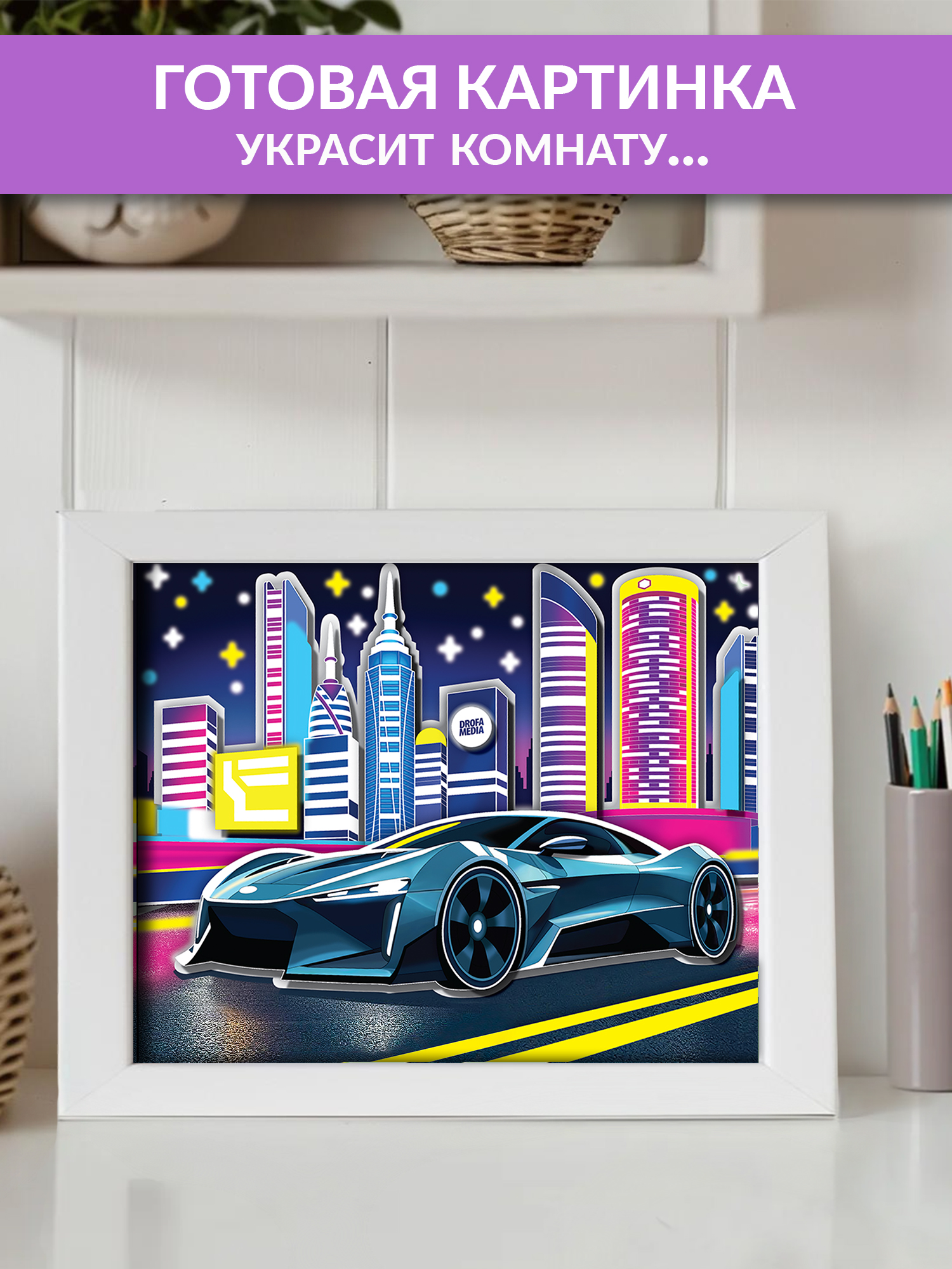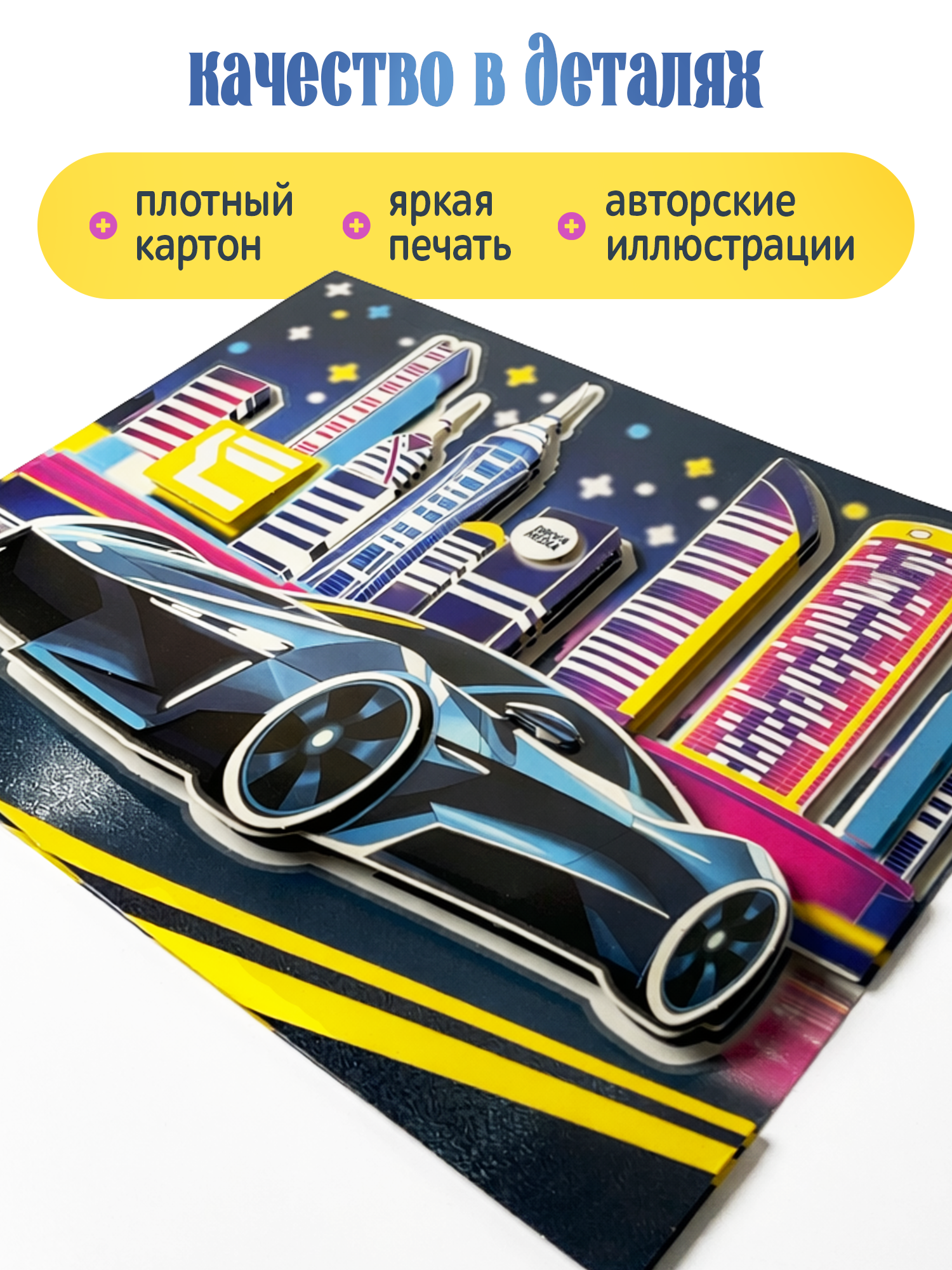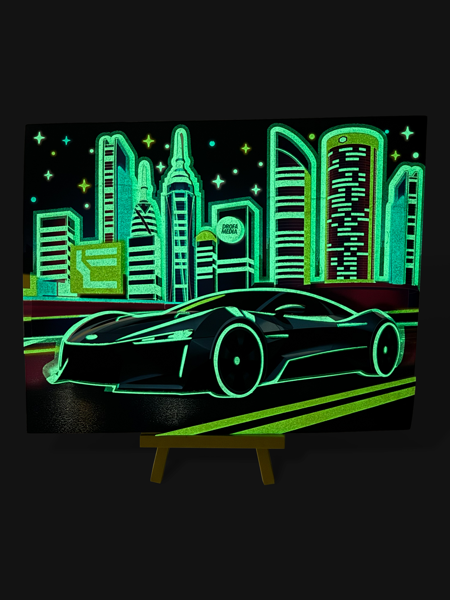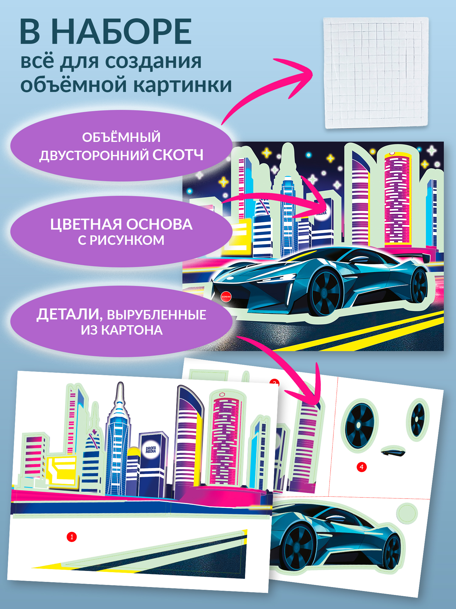 Яркие и красочные детали, наклеенные в несколько слоёв, придадут плоскому изображению удивительный 3D-эффект, создавая необычную 3D-картину. Особой выразительности картине придаст светящийся эффект, будто гоночная машина едет по ночному городу.