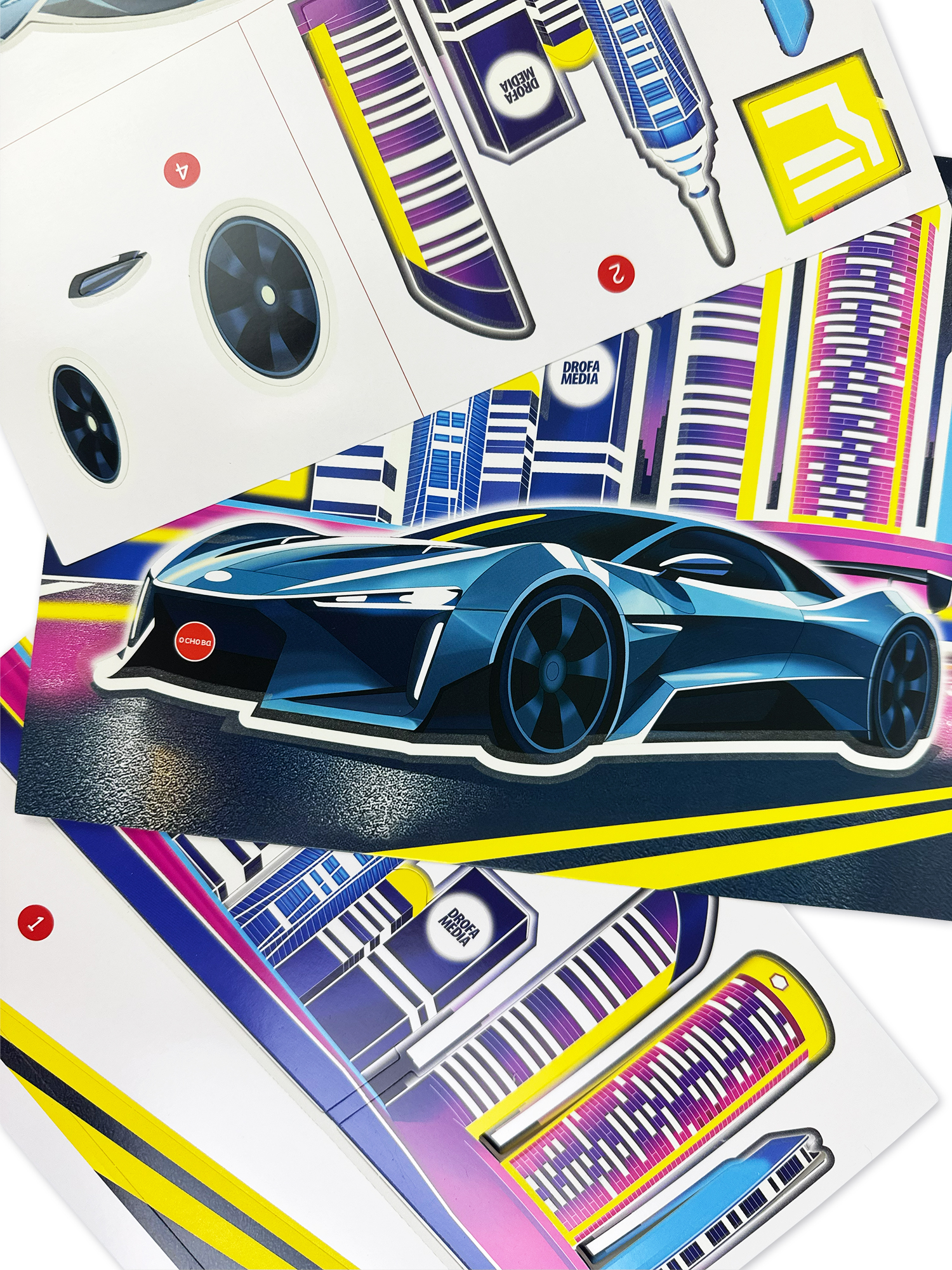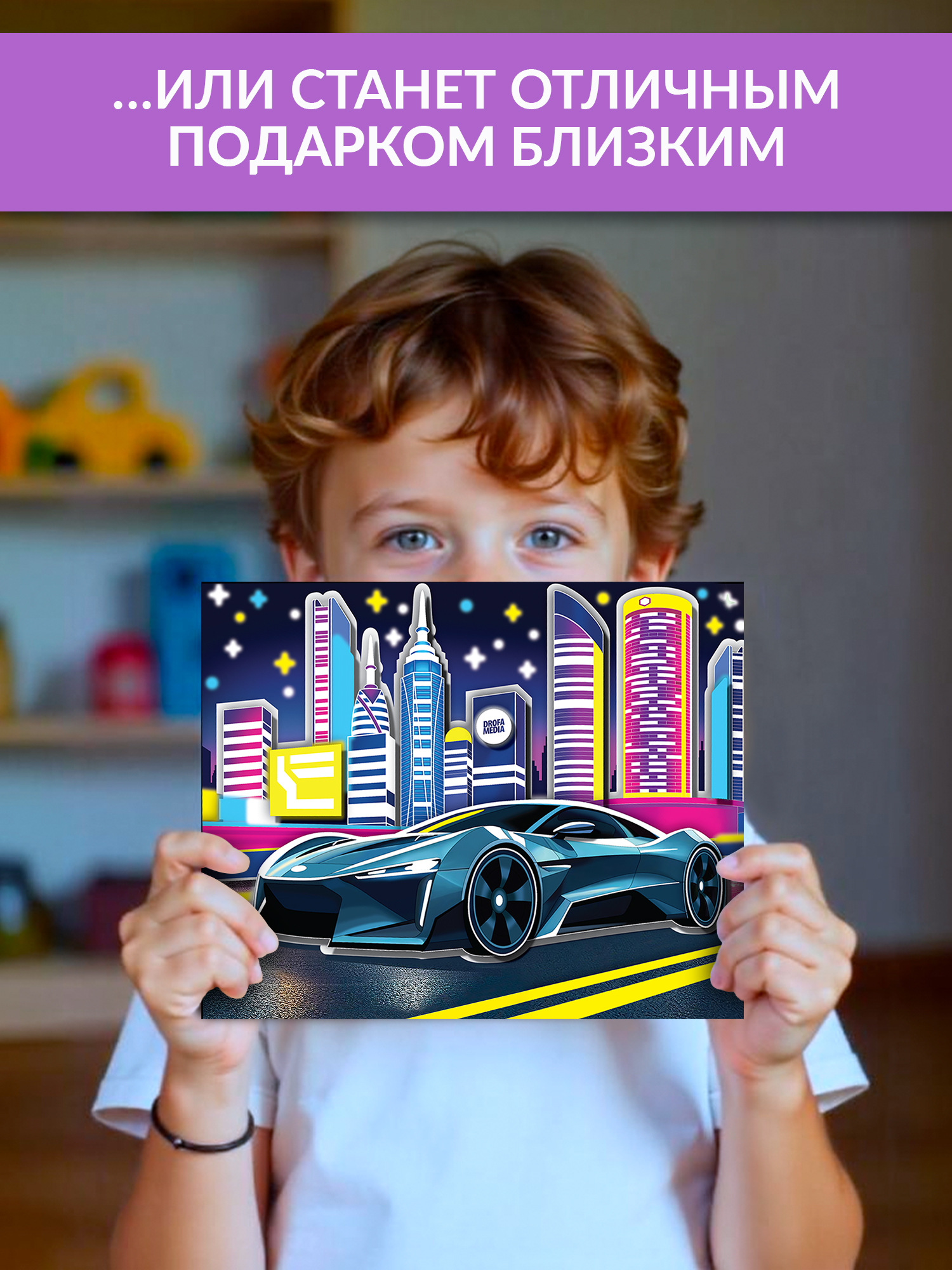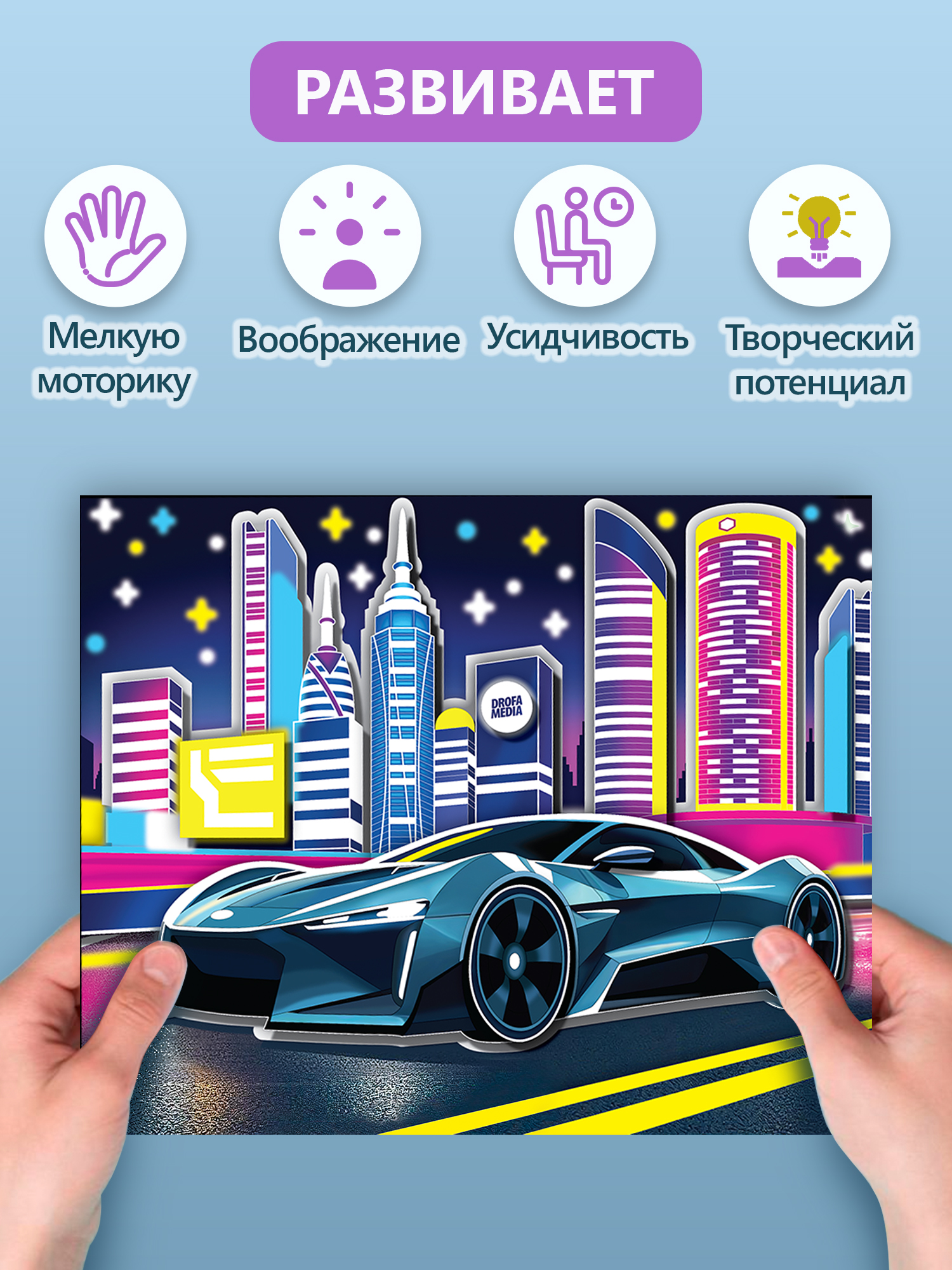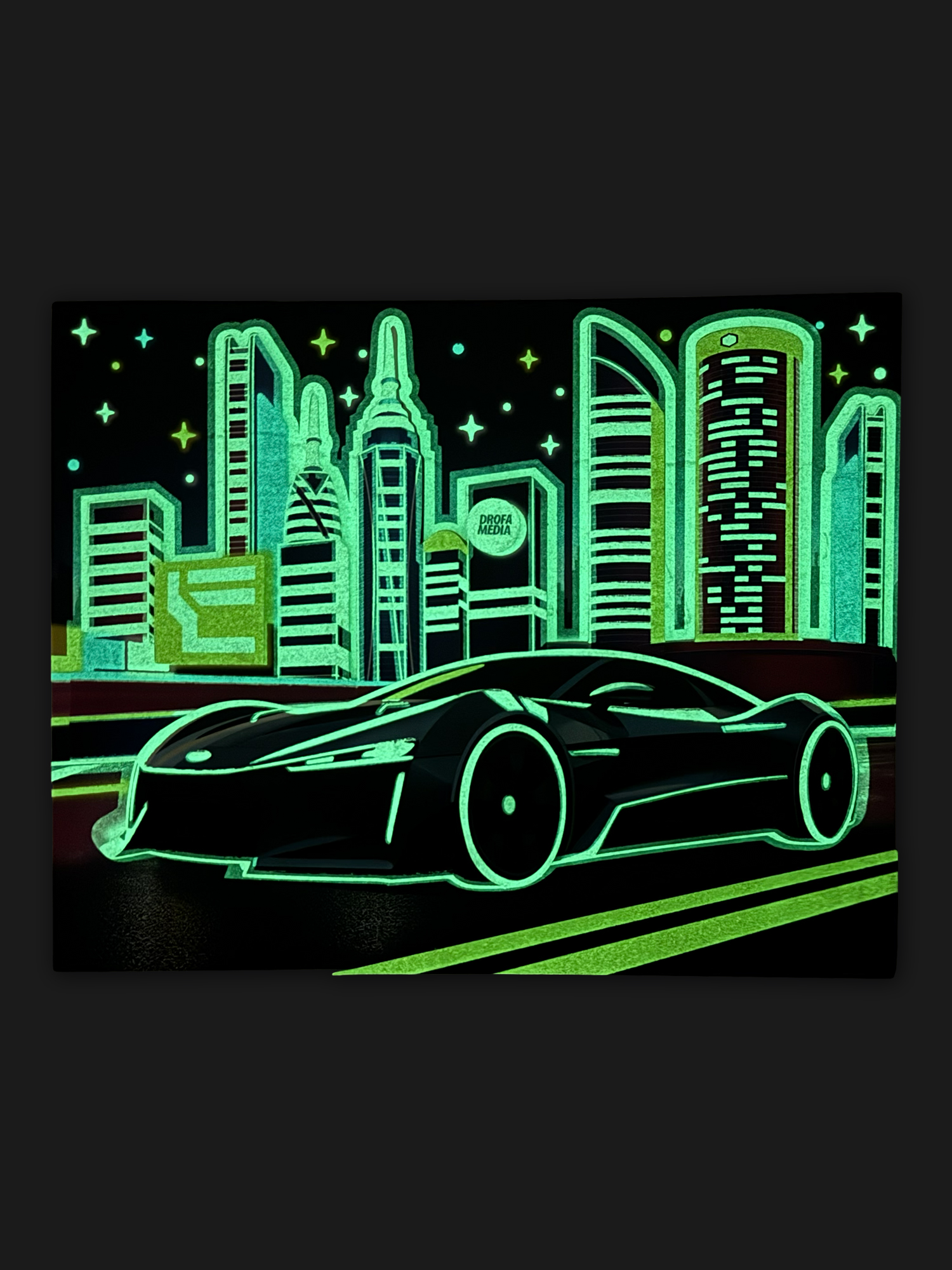 Яркие и красочные детали, наклеенные в несколько слоёв, придадут плоскому изображению удивительный 3D-эффект, создавая необычную 3D-картину. Особой выразительности картине придаст светящийся эффект, будто гоночная машина едет по ночному городу.
