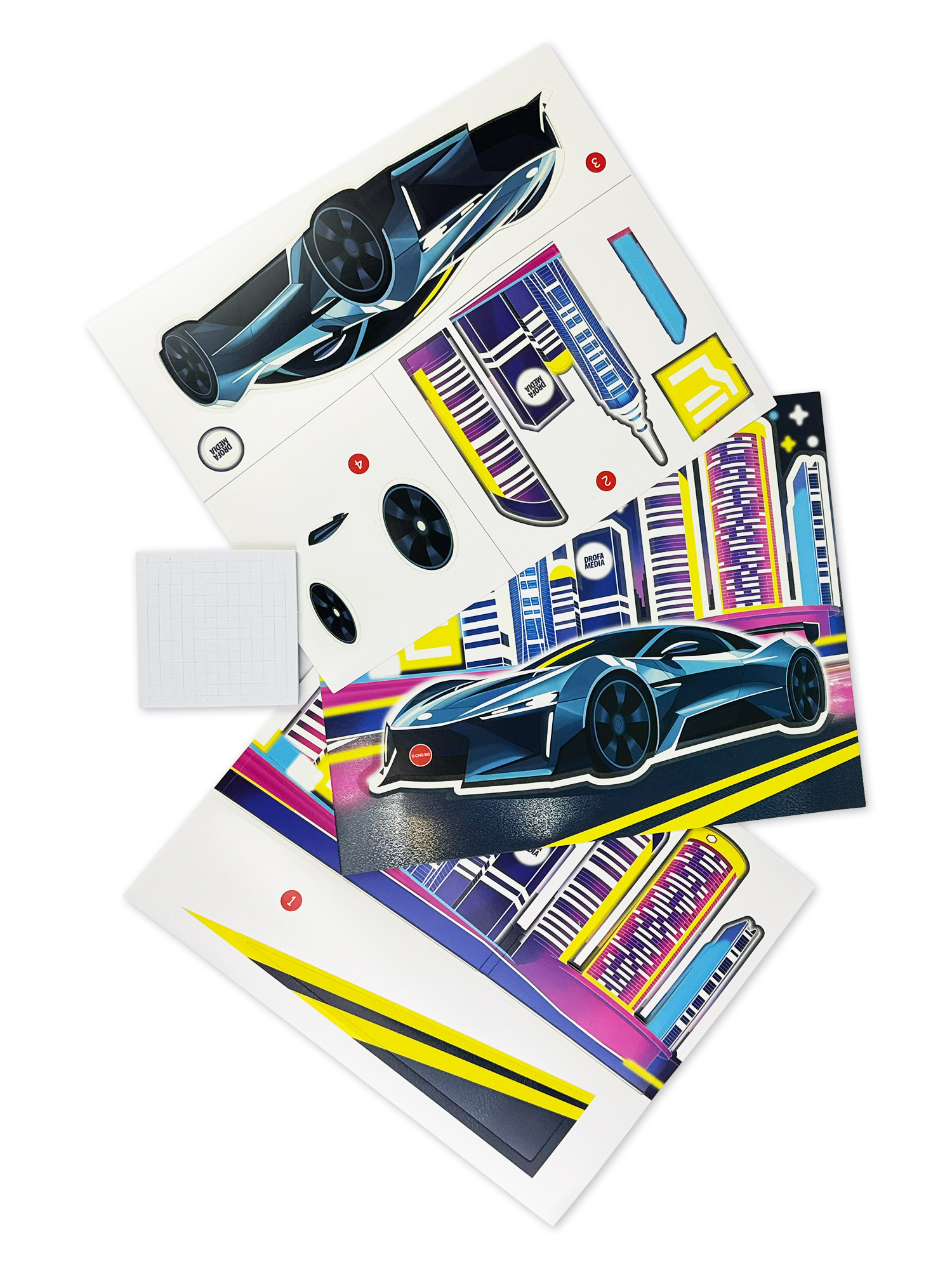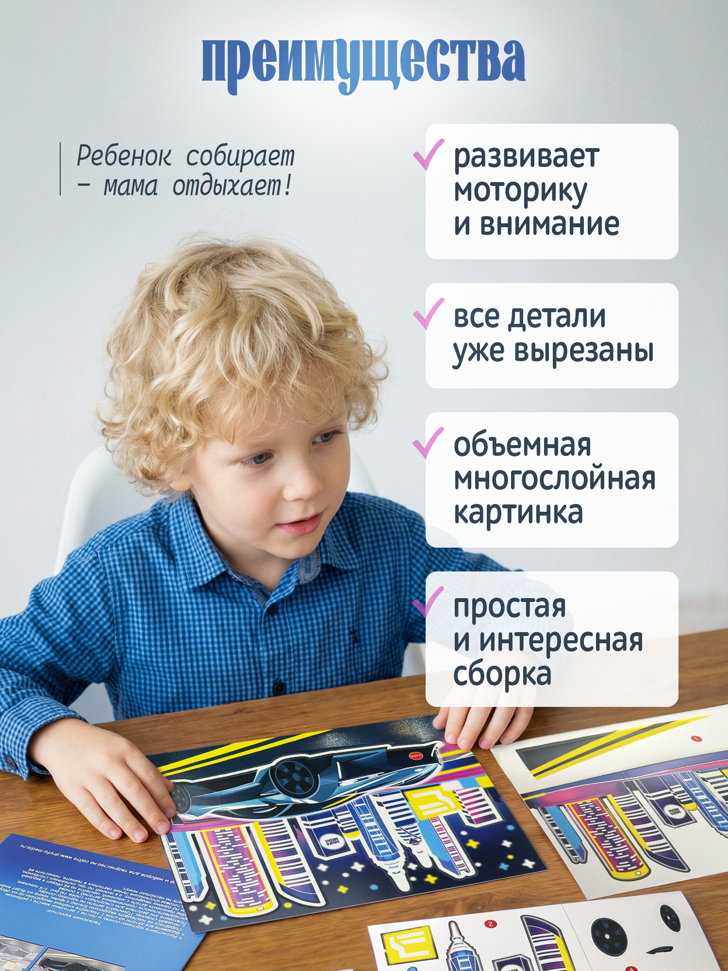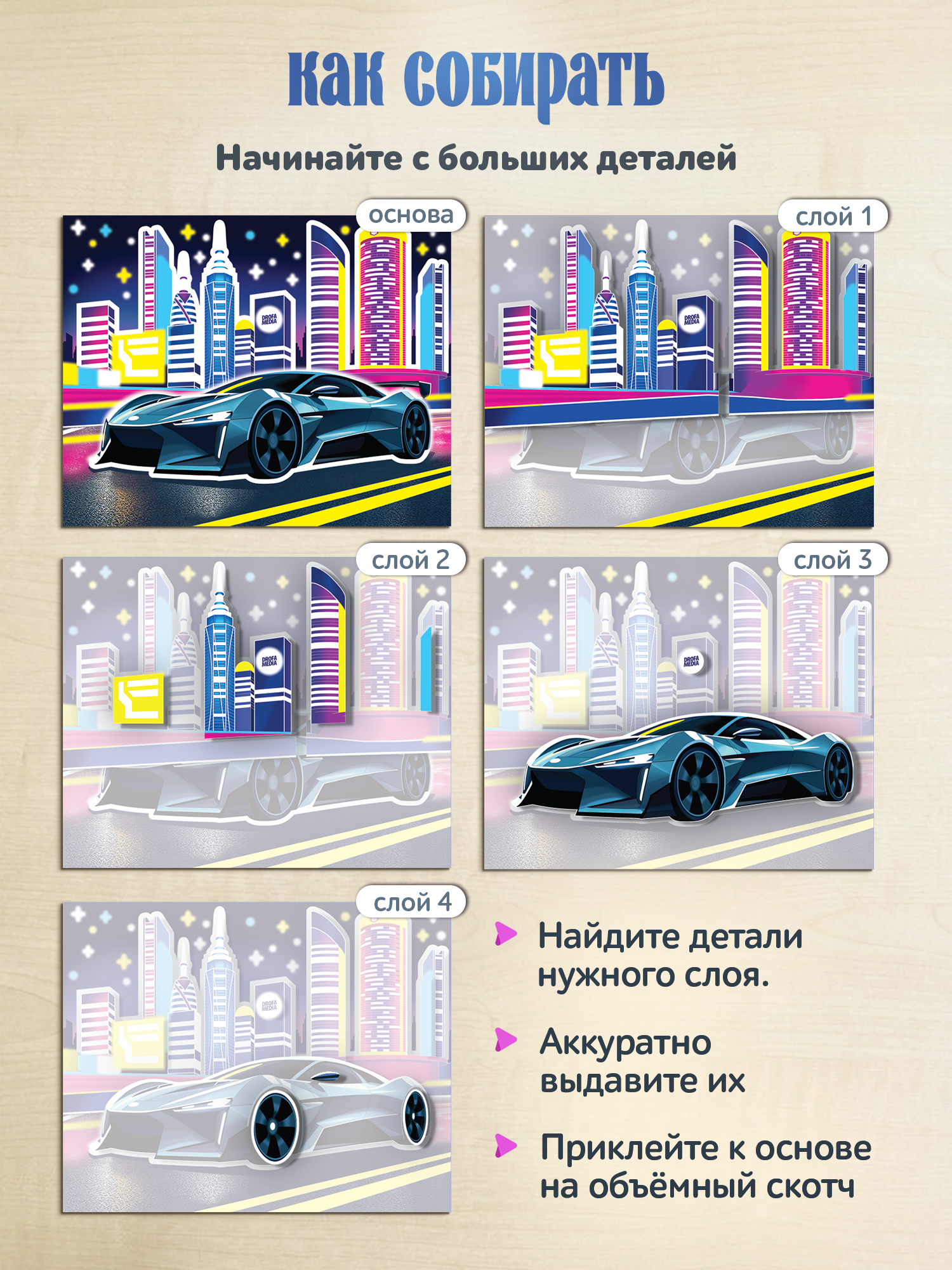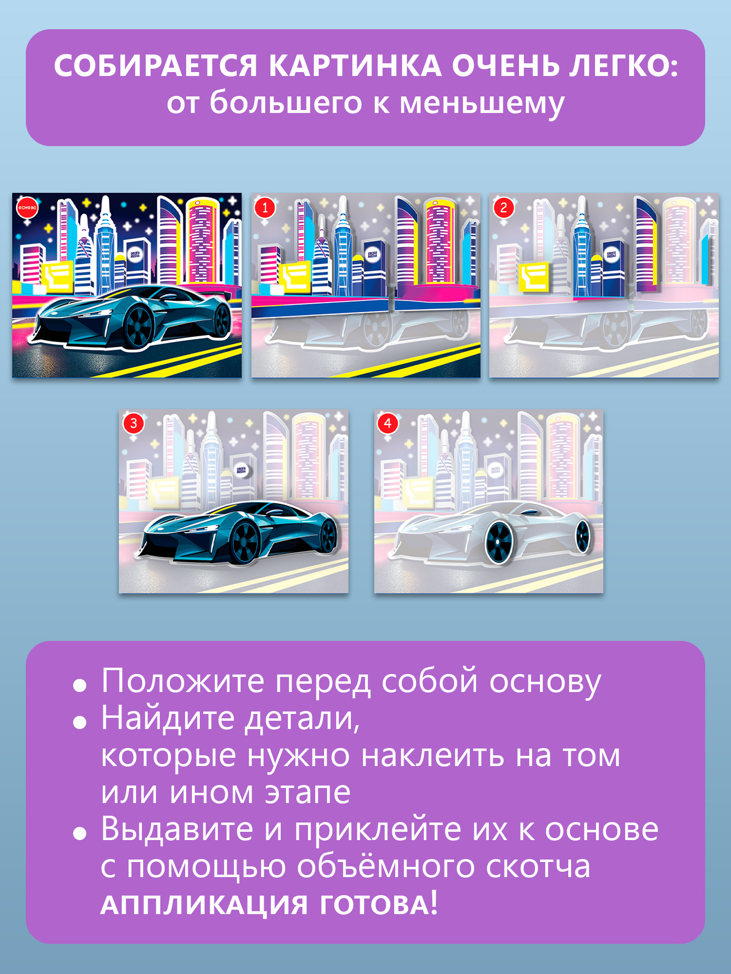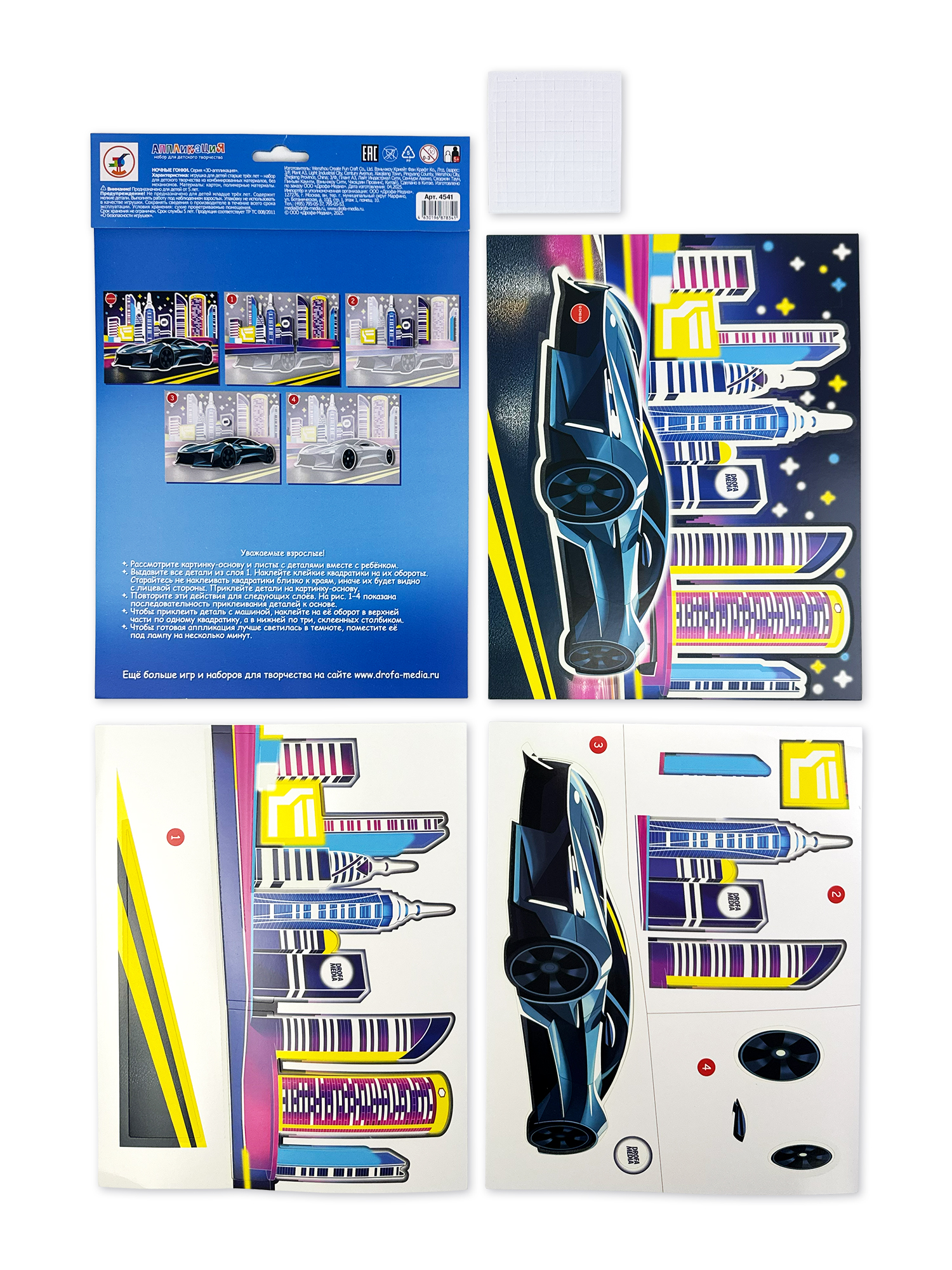 3D-аппликация безопасна для детей, ведь для этого не нужны клей и ножницы, ребёнок легко справится с набором для творчества самостоятельно. Все детали для поделки из бумаги уже вырезаны и готовы к работе. Нужно лишь приклеить их в подходящее место на двусторонние клейкие квадратики, предварительно сняв их с защитного слоя. Последовательность приклеивания показана в простой и понятной инструкции. Найти нужную деталь можно по номеру слоя.