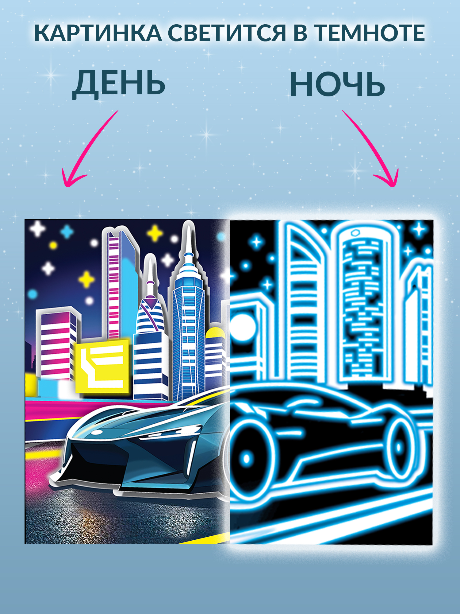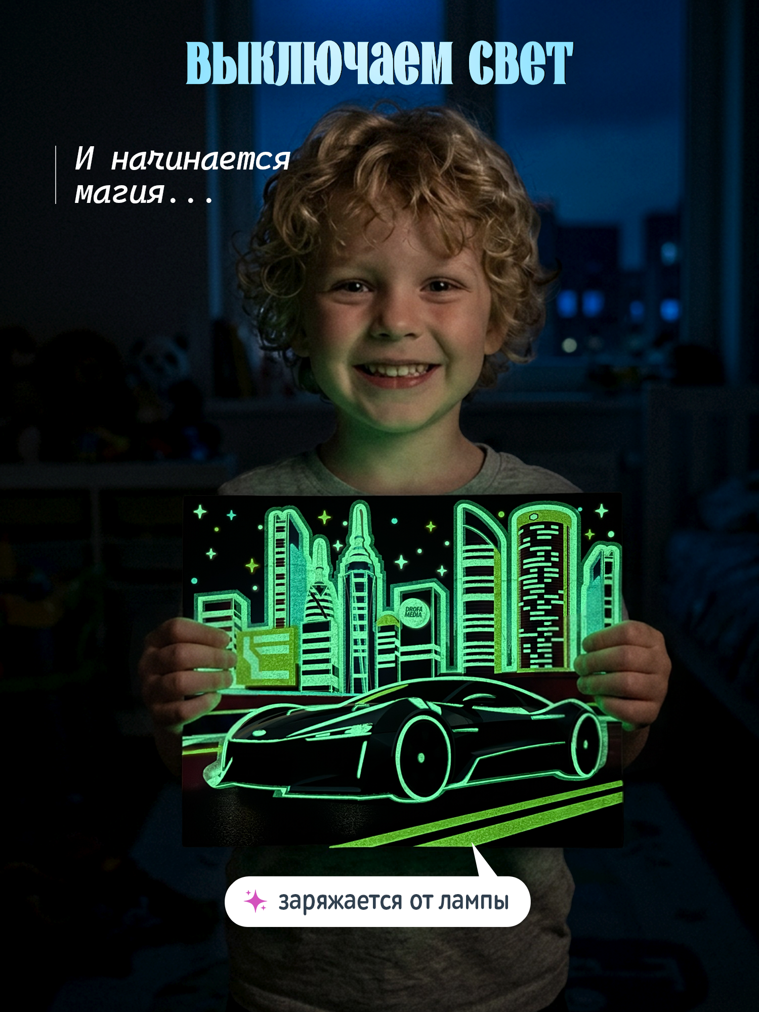 Чтобы картинка лучше светилась, предварительно подержите ее перед ярким источником света 1 минуту или посветите на нее фонариком.