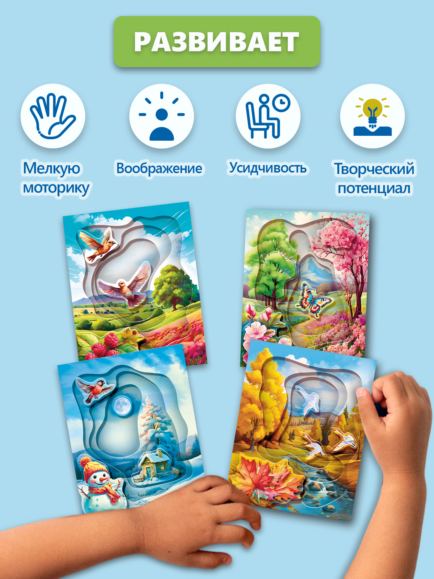 Выступая над основой, слои создают удивительный эффект туннеля, а детали — птички, цветы, листья, ягоды — придают дополнительный объём. Набор «Времена года» станет отличным подарком по любому поводу и прекрасно подойдёт в качестве тематической поделки в детском саду или начальной школе.