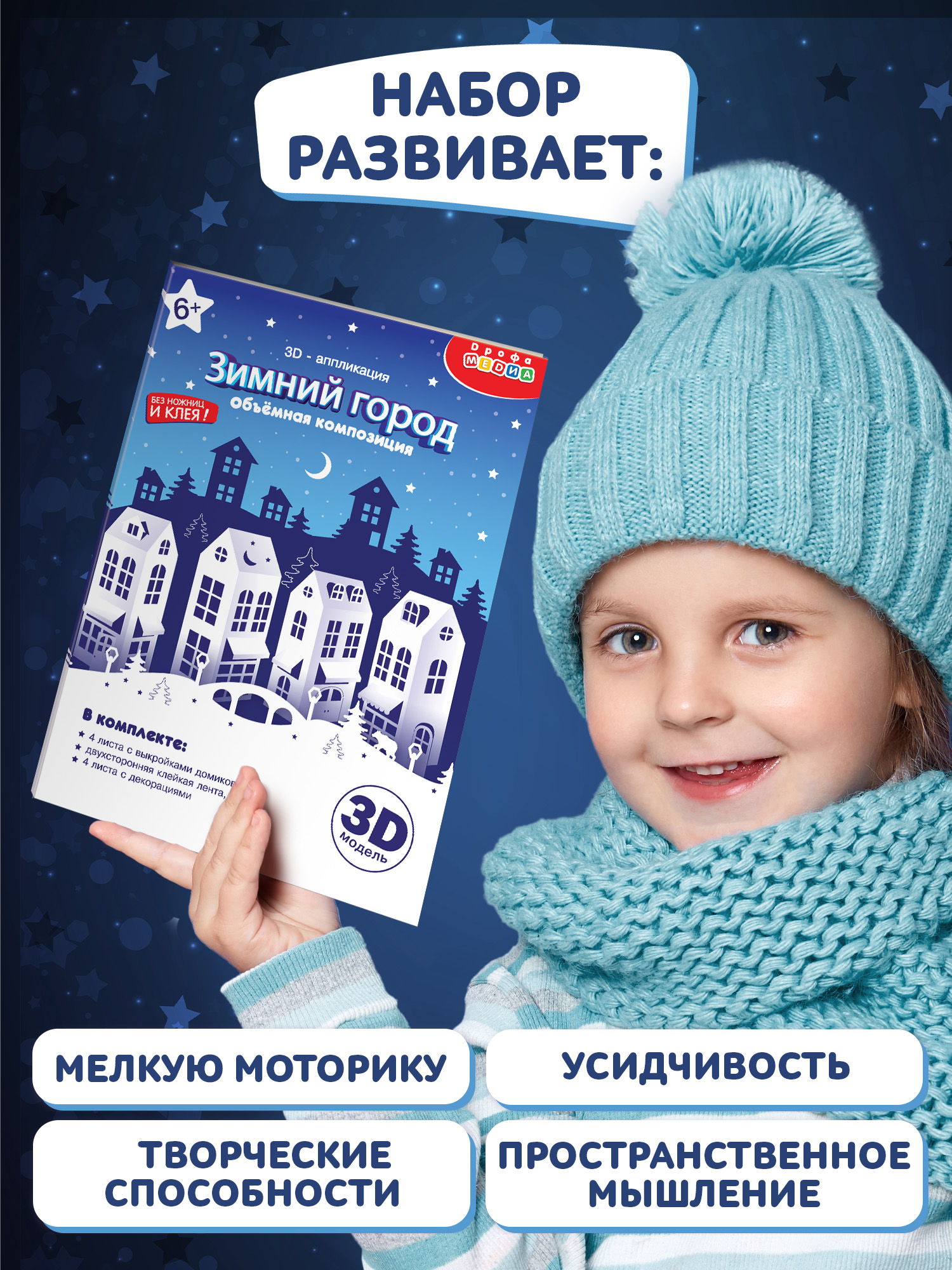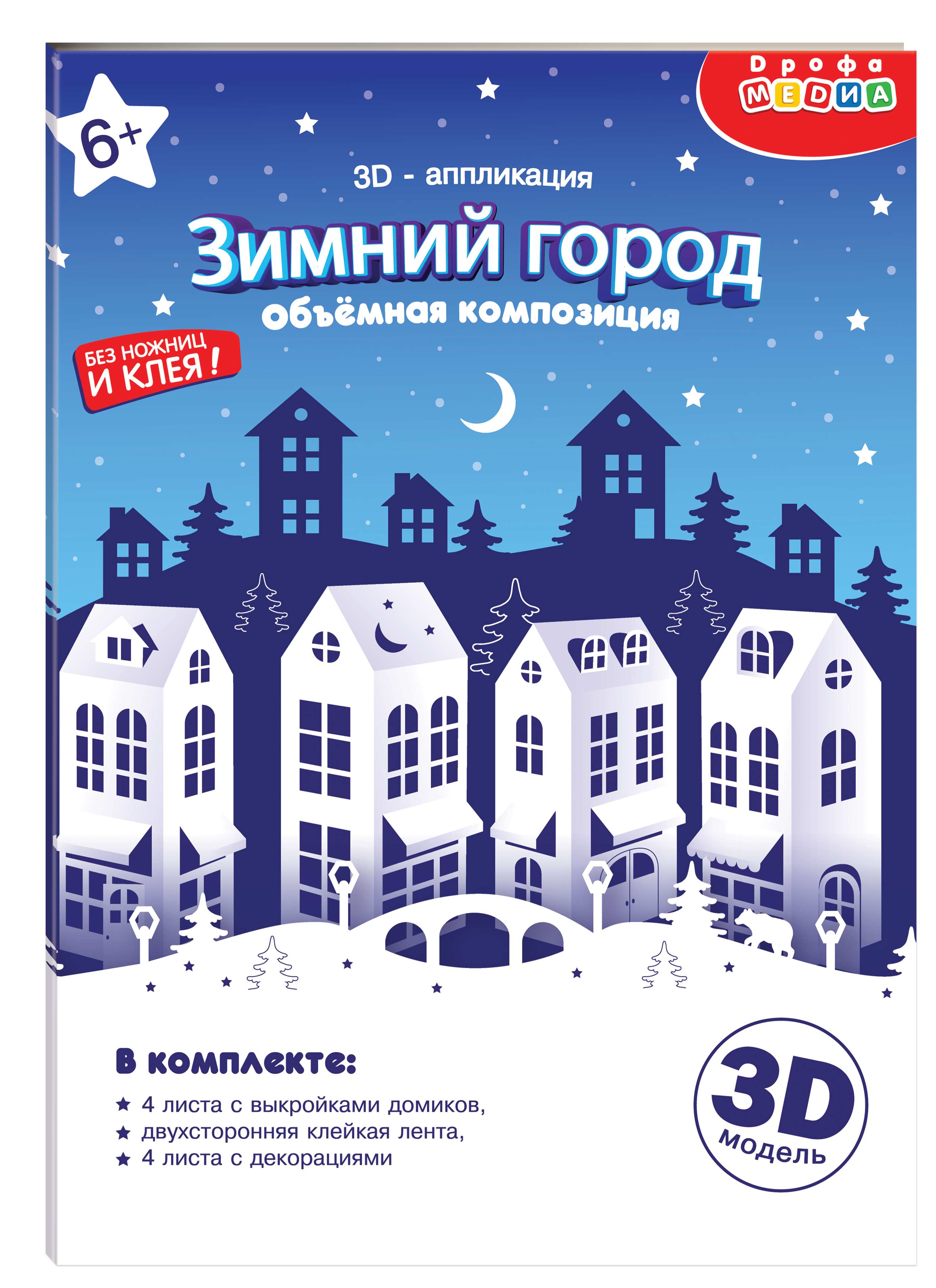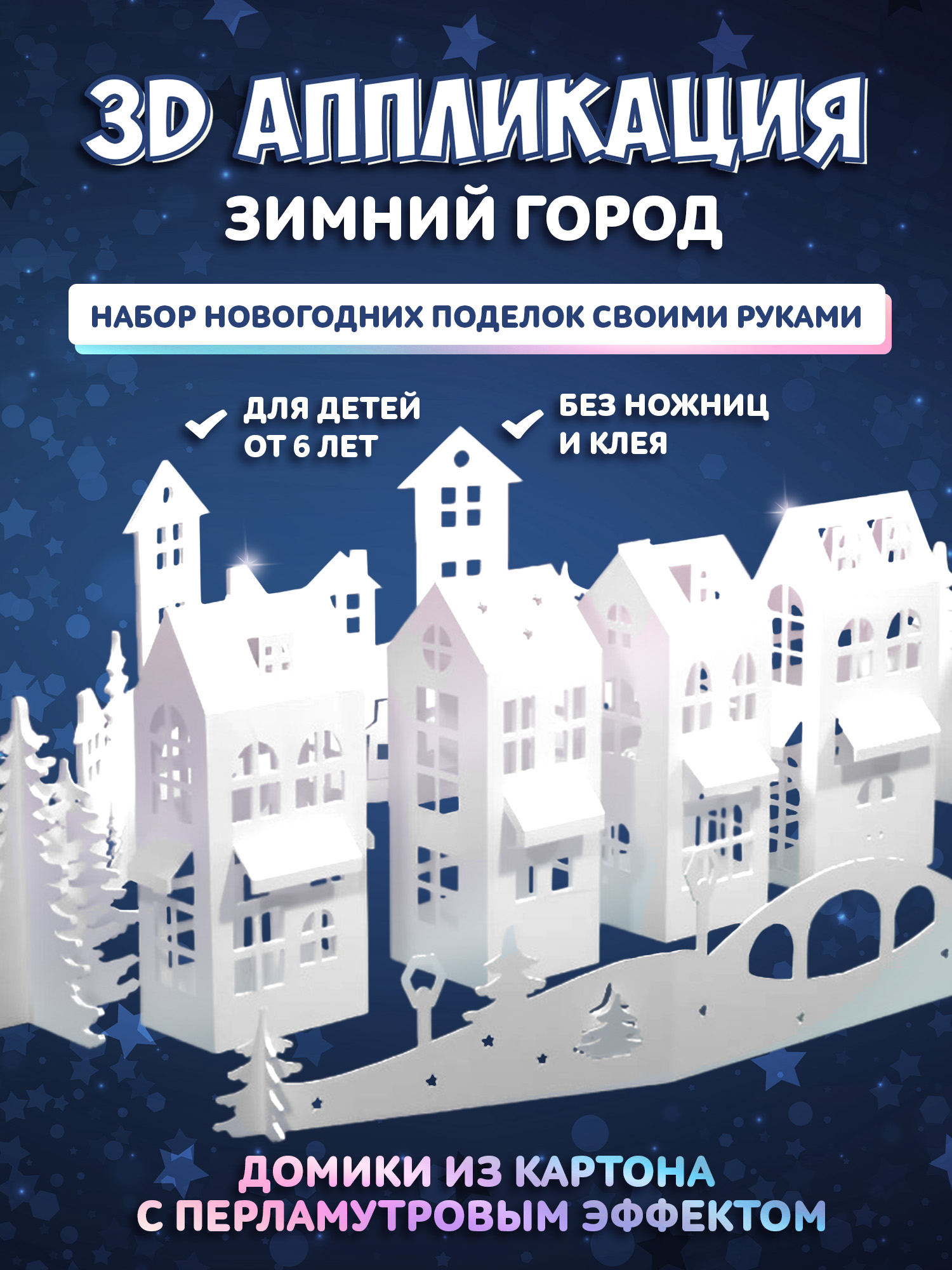 Объёмная аппликация «Зимний город. Объёмная аппликация» – отличный набор для творчества, который украсит вашу комнату. Детали из перламутрового картона, создадут предновогоднее настроение и погрузят в атмосферу волшебства заснеженного города.