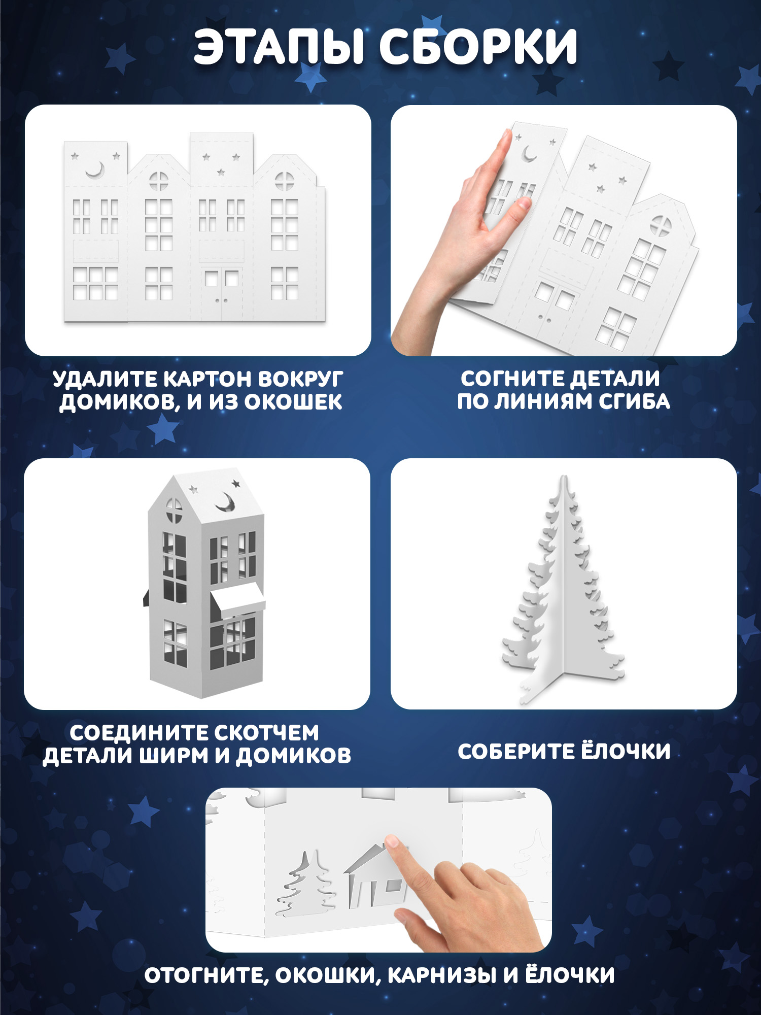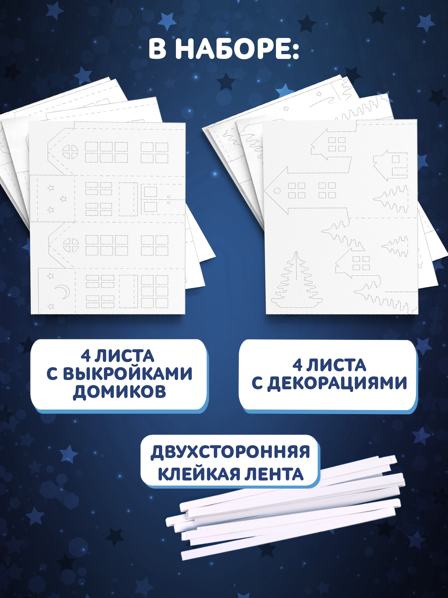 В наборе: 4 листа с выкройками домиков, двухстороння клейкая лента, 4 листа с декорациями.