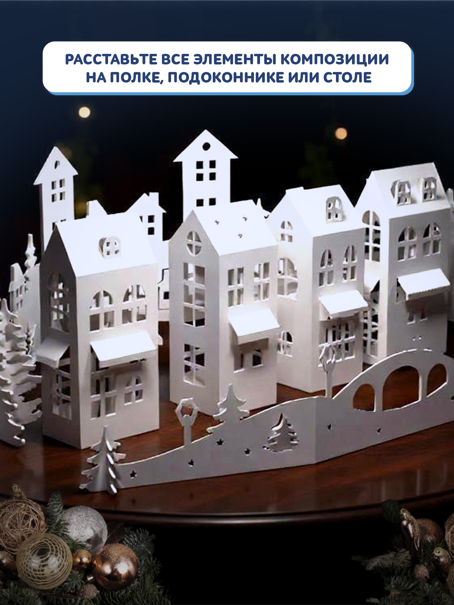 Выкройки домиков и дополнительные детали уже вырублены, нужно только аккуратно выдавить лишний картон, собрать, украсить и склеить с помощью клейкой ленты. Детали – ёлочки – придают дополнительный эффект.