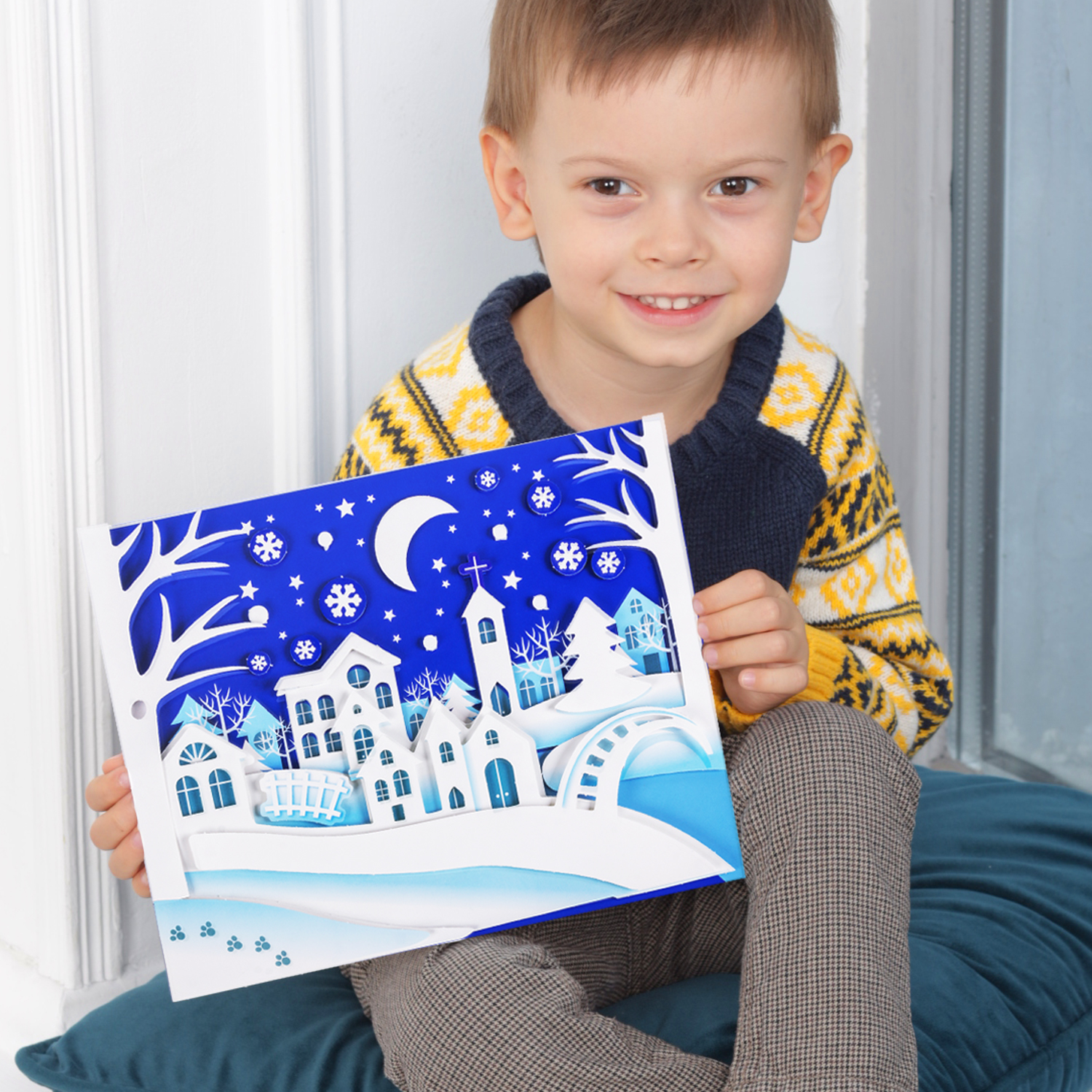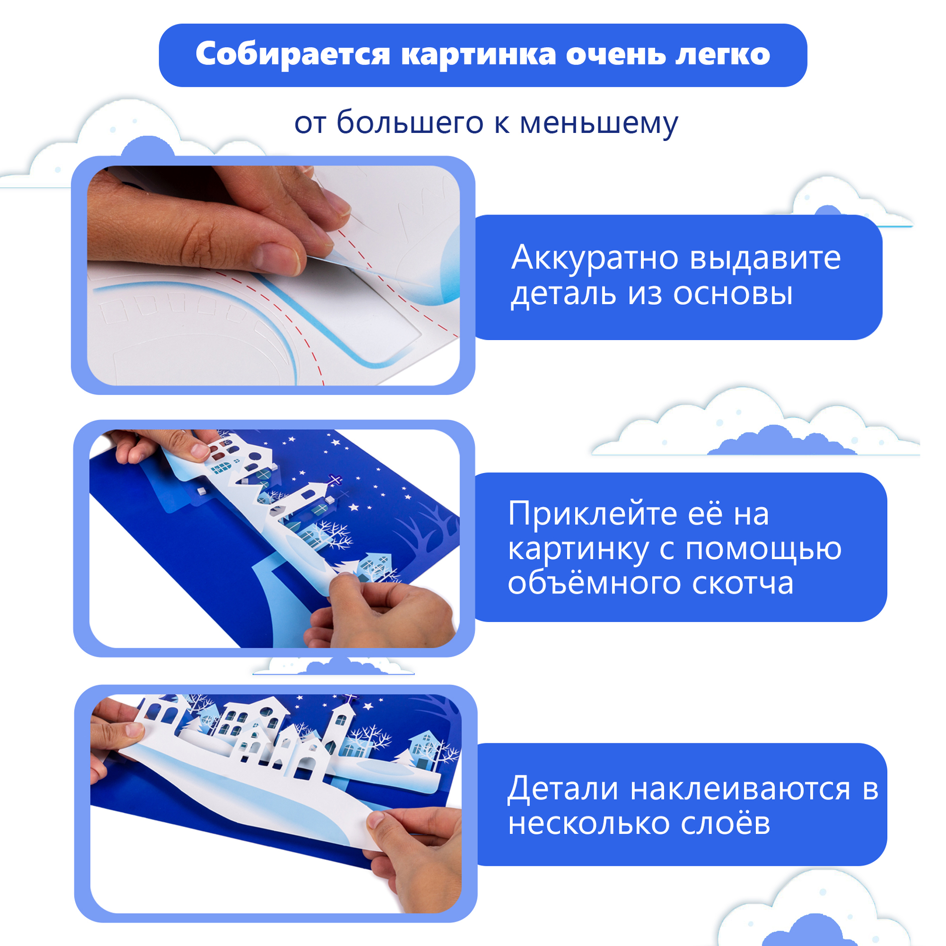 Яркие и красочные детали изображения, выполненные из плотного картона, выступают над основой, создавая эффект объёма. Этот удивительный 3D-эффект возникает благодаря использованию объёмного двустороннего скотча.