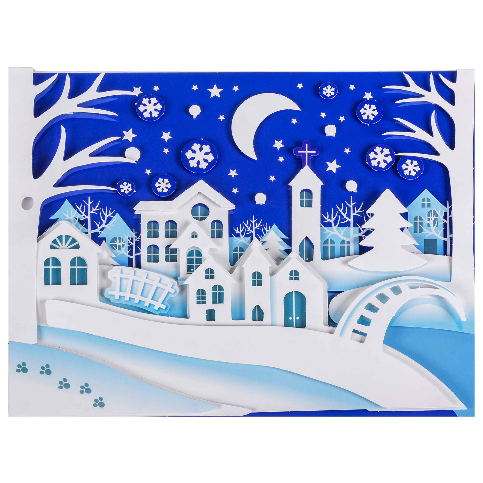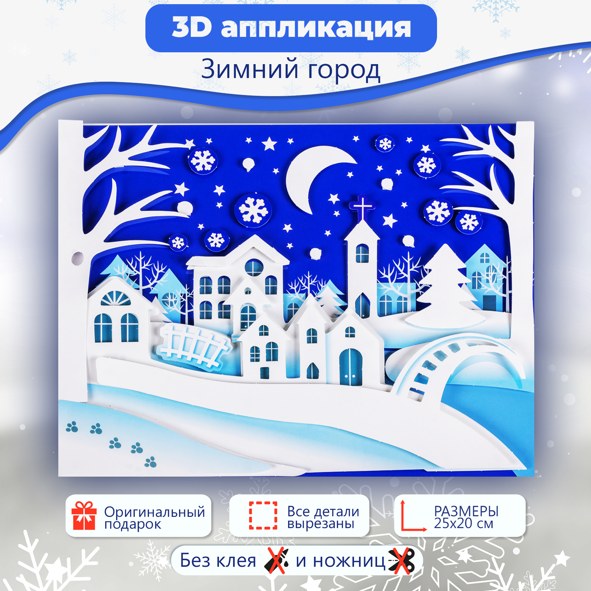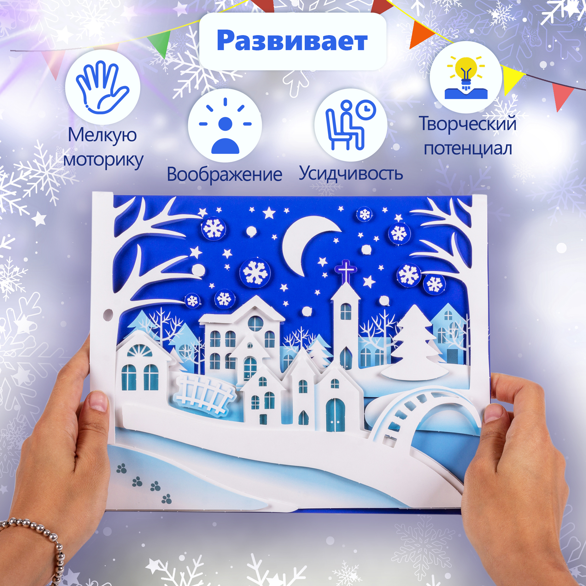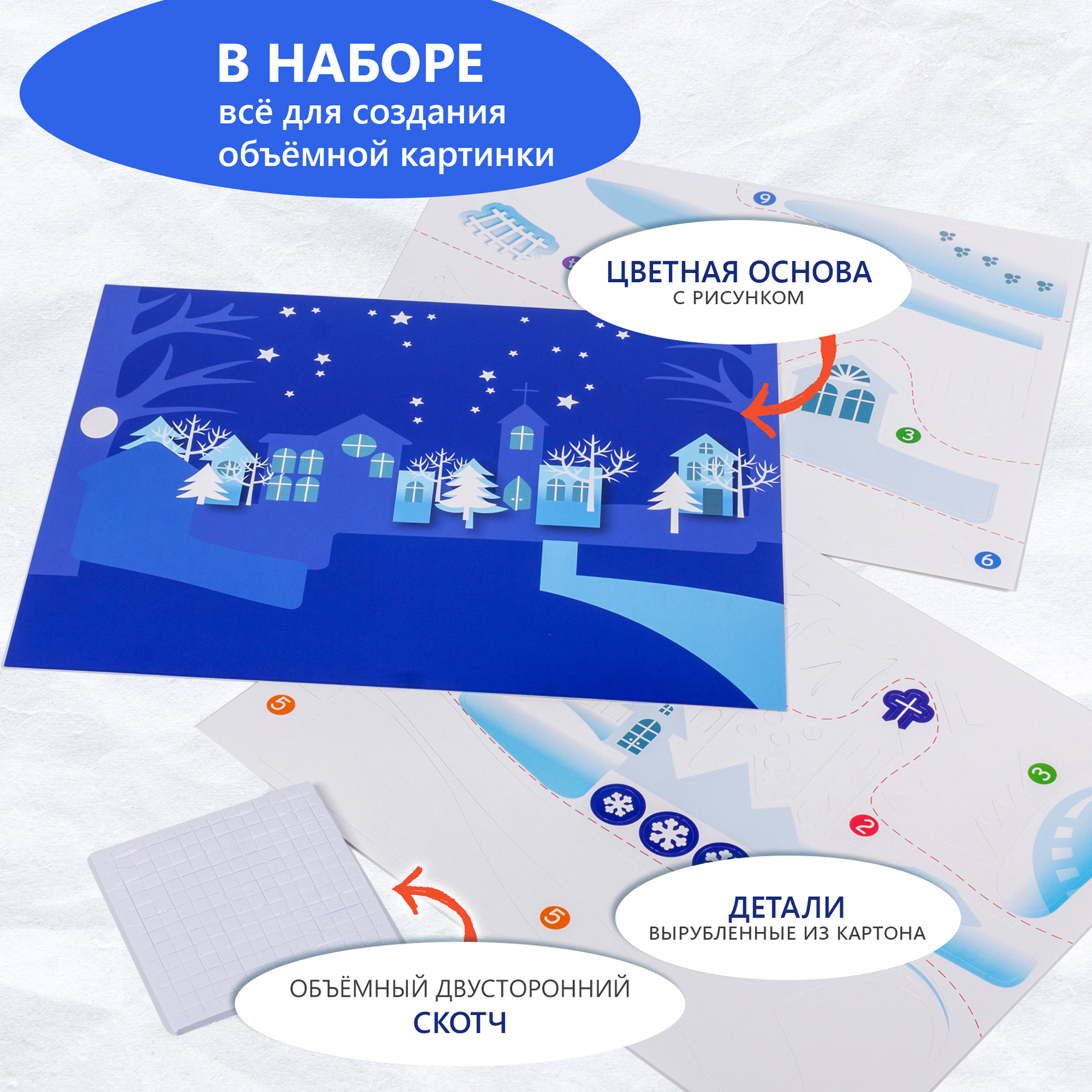 В комплекте: картонная основа с рисунком, 2 листа картона с вырубленными деталями, двусторонний скотч.