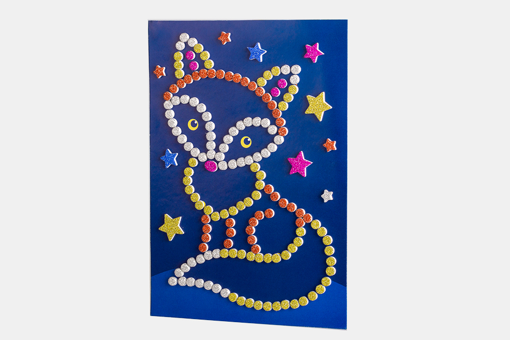 Ребёнка наверняка заинтересует эффектная картинка из блестящих кружочков глиттерной ЭВА на тёмном фоне. Сделать её очень легко: нужно аккуратно наклеить самоклеящиеся блестящие глиттерные детали из ЭВА на основу, ориентируясь по цветам, и изображение заиграет яркими, сверкающими цветами. В конце отрежьте верхнюю часть листовки и чудесная картинка готова!