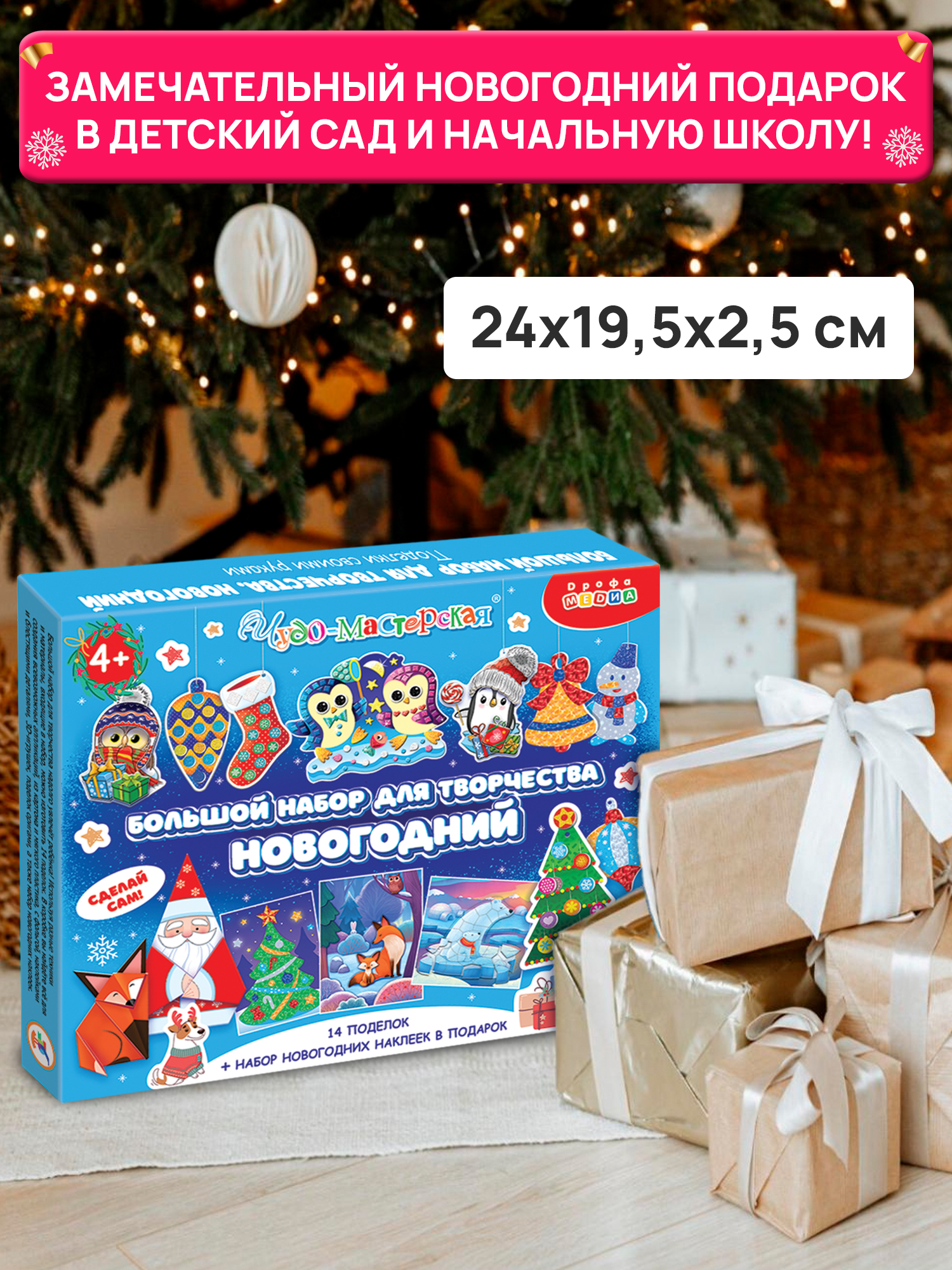 Большой новогодний набор для творчества подарит праздничное настроение и мальчикам, и девочкам. Творчество развивает художественный вкус, воображение и мелкую моторику, дарит детям радость от собственных успехов, позволяет разнообразить занятия с детьми и провести время вместе за интересным делом. Новогодние наклейки в подарок!