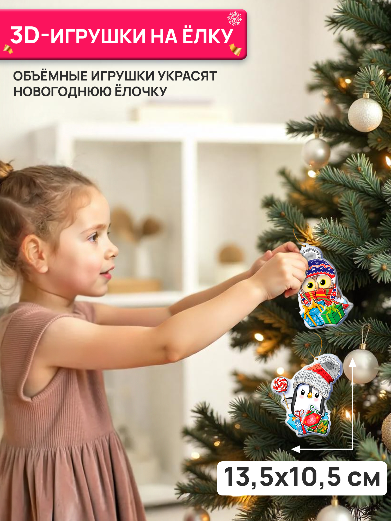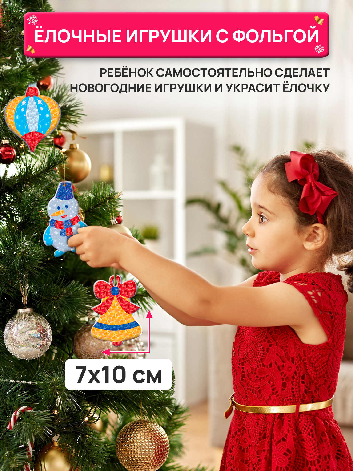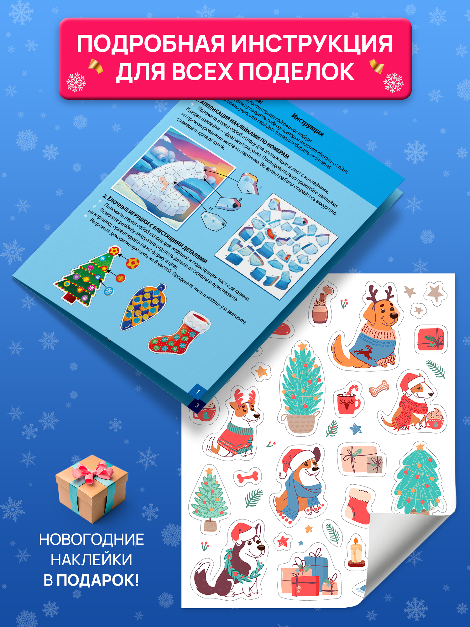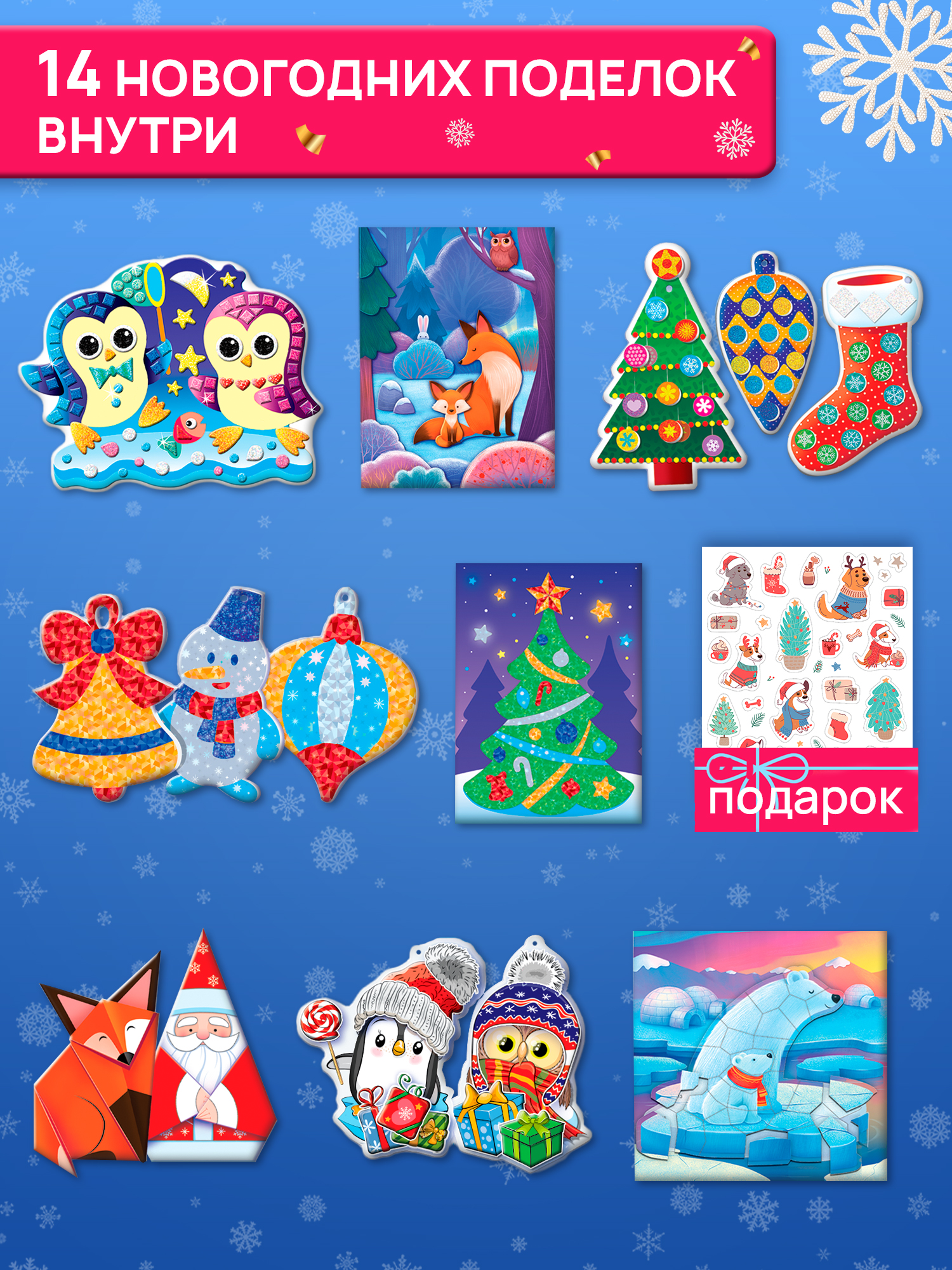 В коробке вы найдете все для создания всевозможных аппликаций, из картона и мягкого пластика, с фольгой, наклейками и блестящими деталями, 3D-игрушек, поделок оригами, а также набор новогодних наклеек. Материалы для каждого вида поделок упакованы в индивидуальный пакет.
