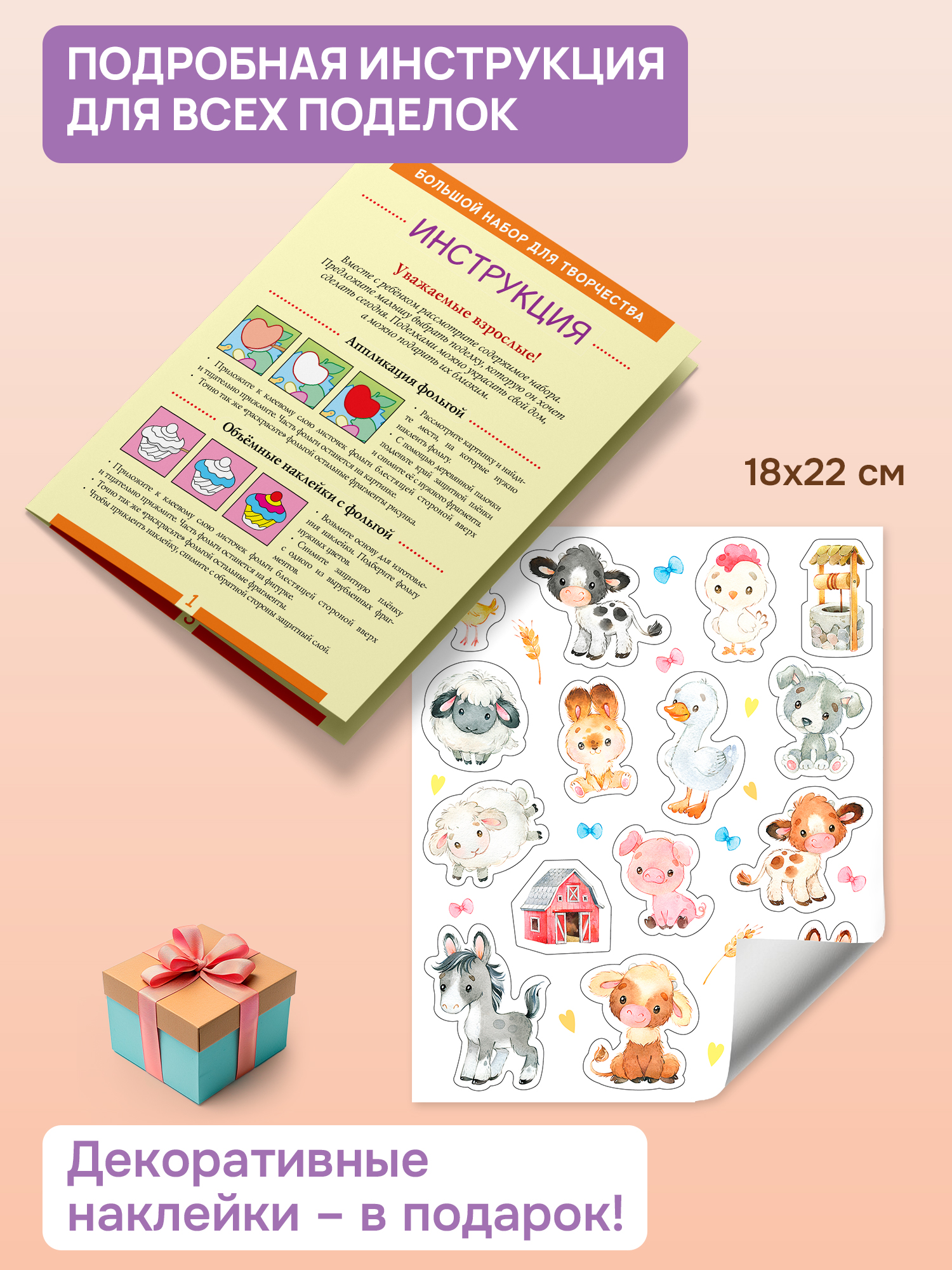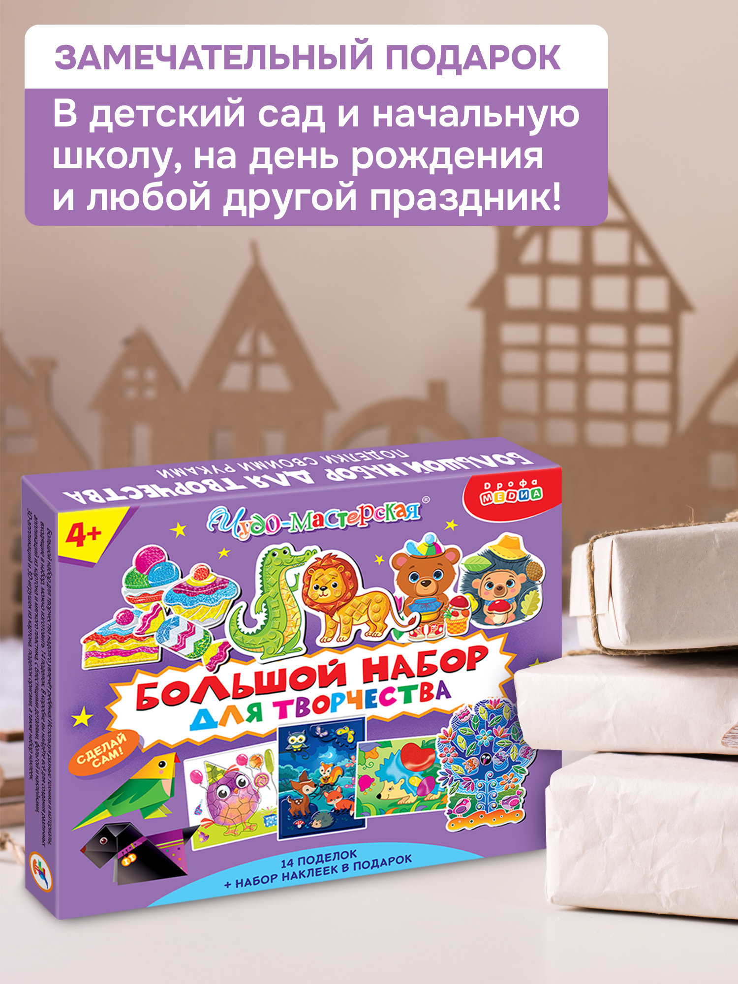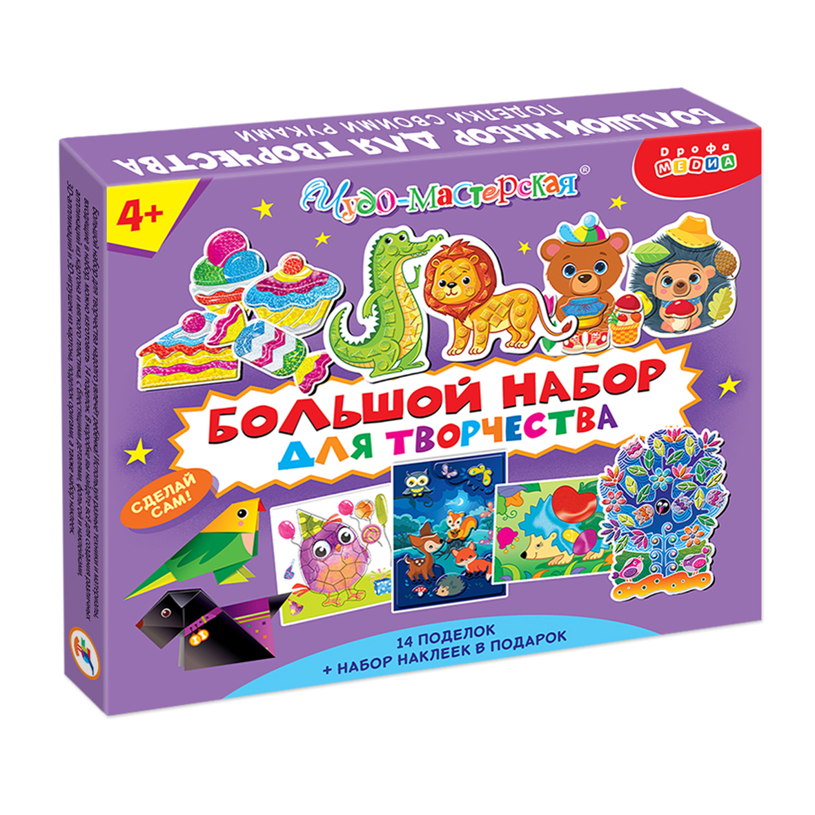 В коробке вы найдете всё для создания всевозможных аппликаций, из картона и мягкого пластика, с фольгой, наклейками и блестящими деталями, 3D-игрушек, поделок оригами, а также набор наклеек. Материалы для каждого вида поделок упакованы в индивидуальный пакет.