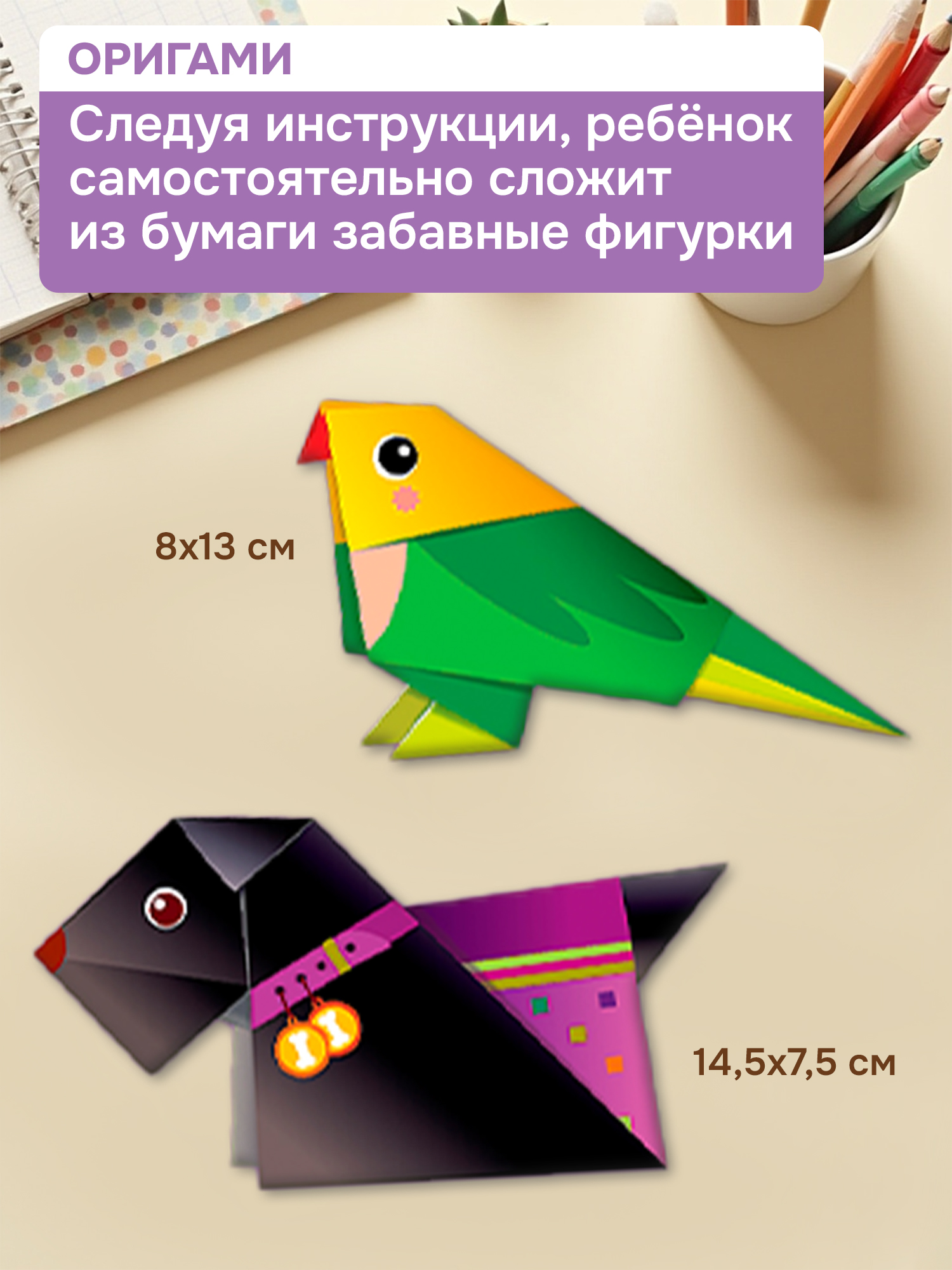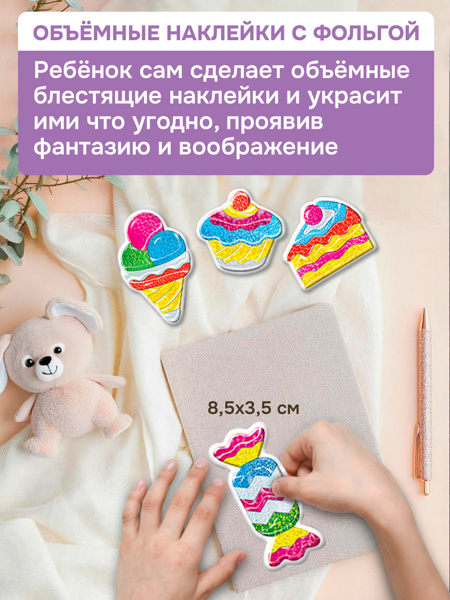 В наборе: основы для аппликаций из картона и мягкого пластика (12 шт.), листы с деталями из картона и мягкого пластика (4 шт.), фольга (8 шт.), листы с наклейками (2 шт.), листы для поделок оригами (2 шт.), декоративная нить, деревянная палочка, объёмный двухсторонний скотч, магнитик.