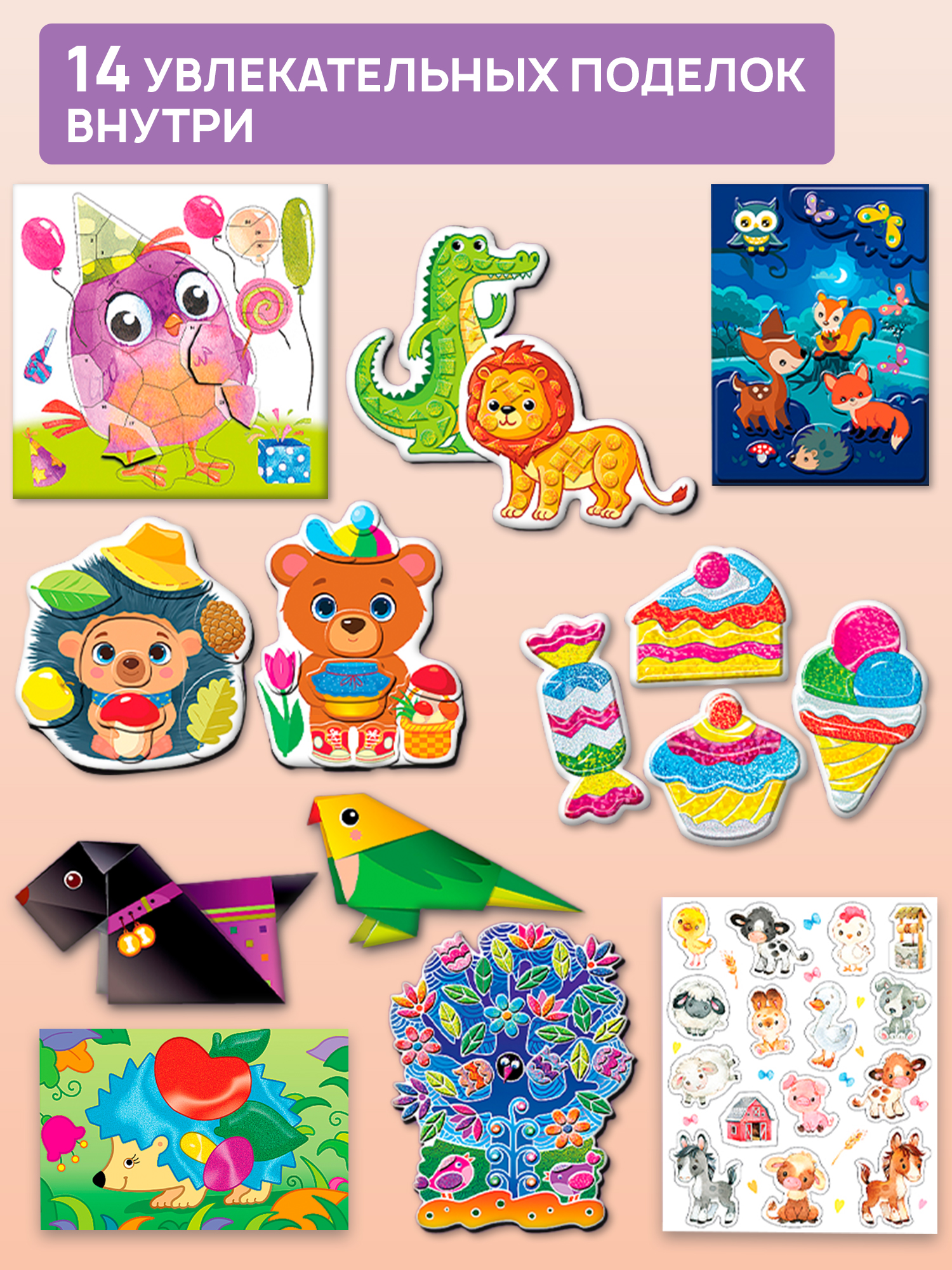 Большой набор для творчества надолго увлечёт ребенка! Используя разные техники и материалы, входящие в набор, можно изготовить 14 поделок.