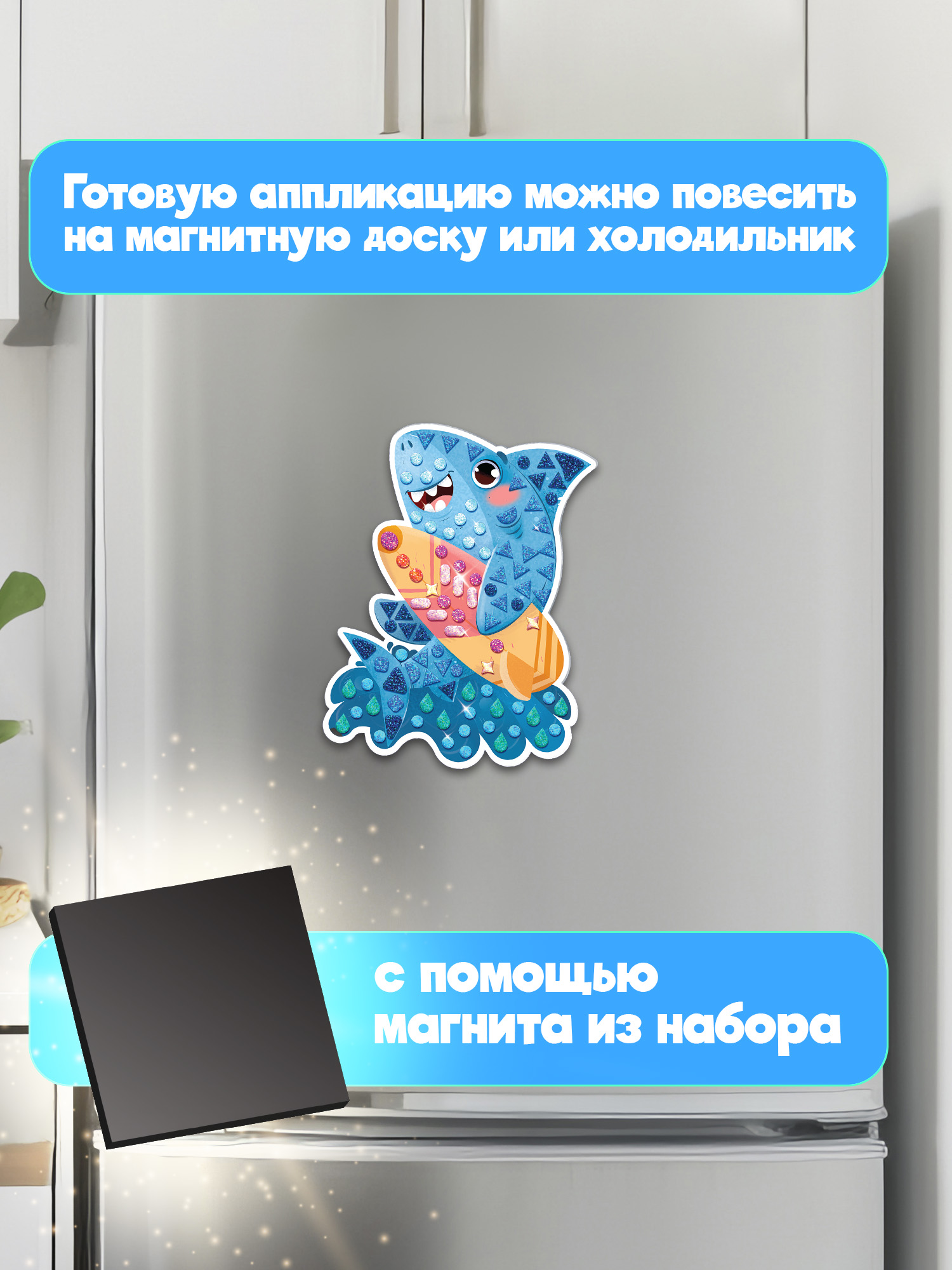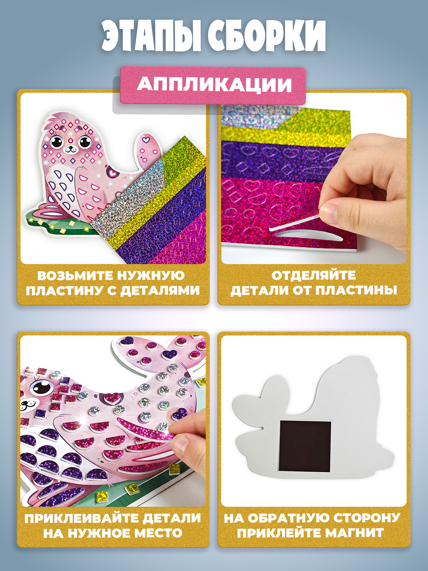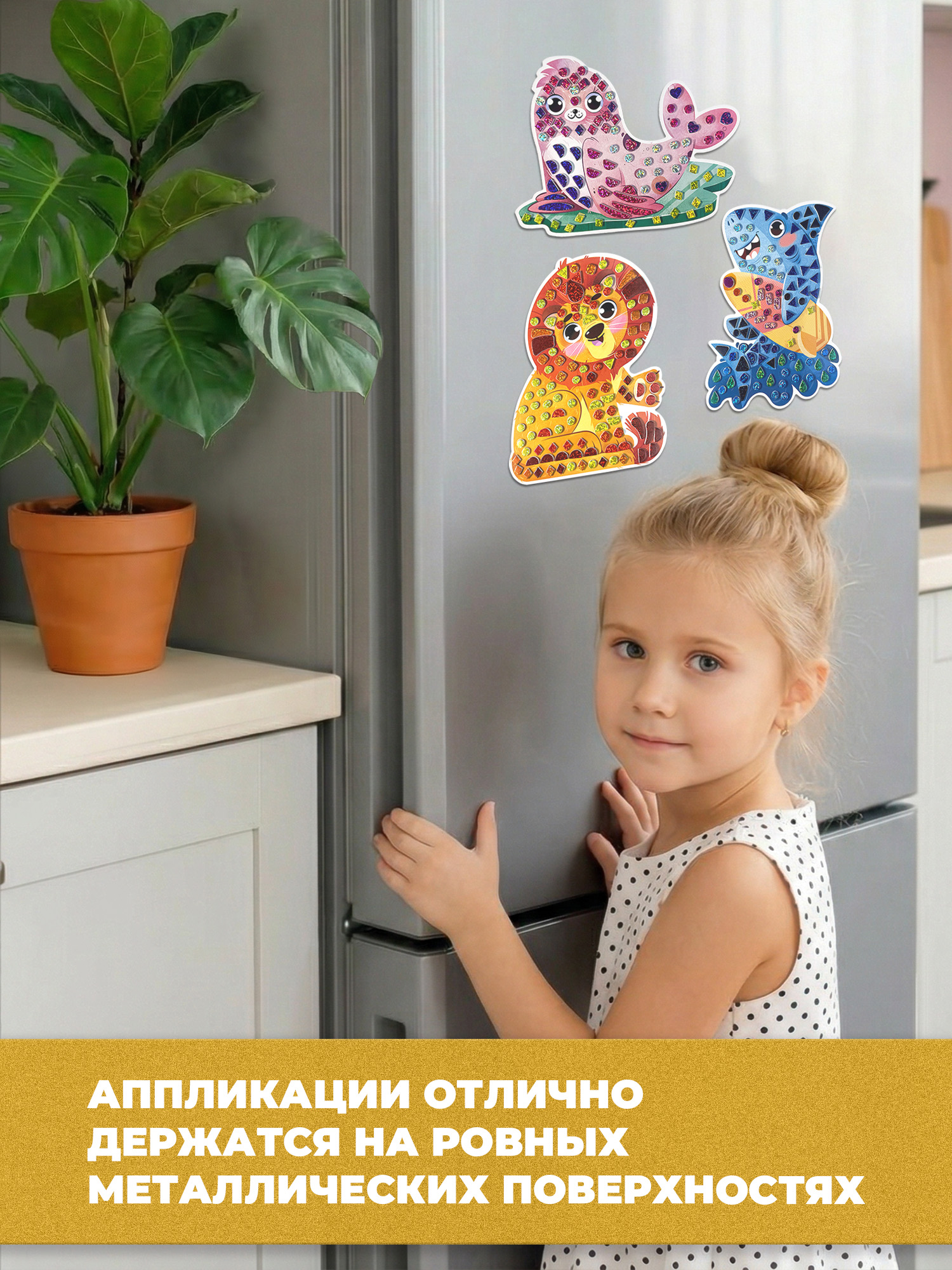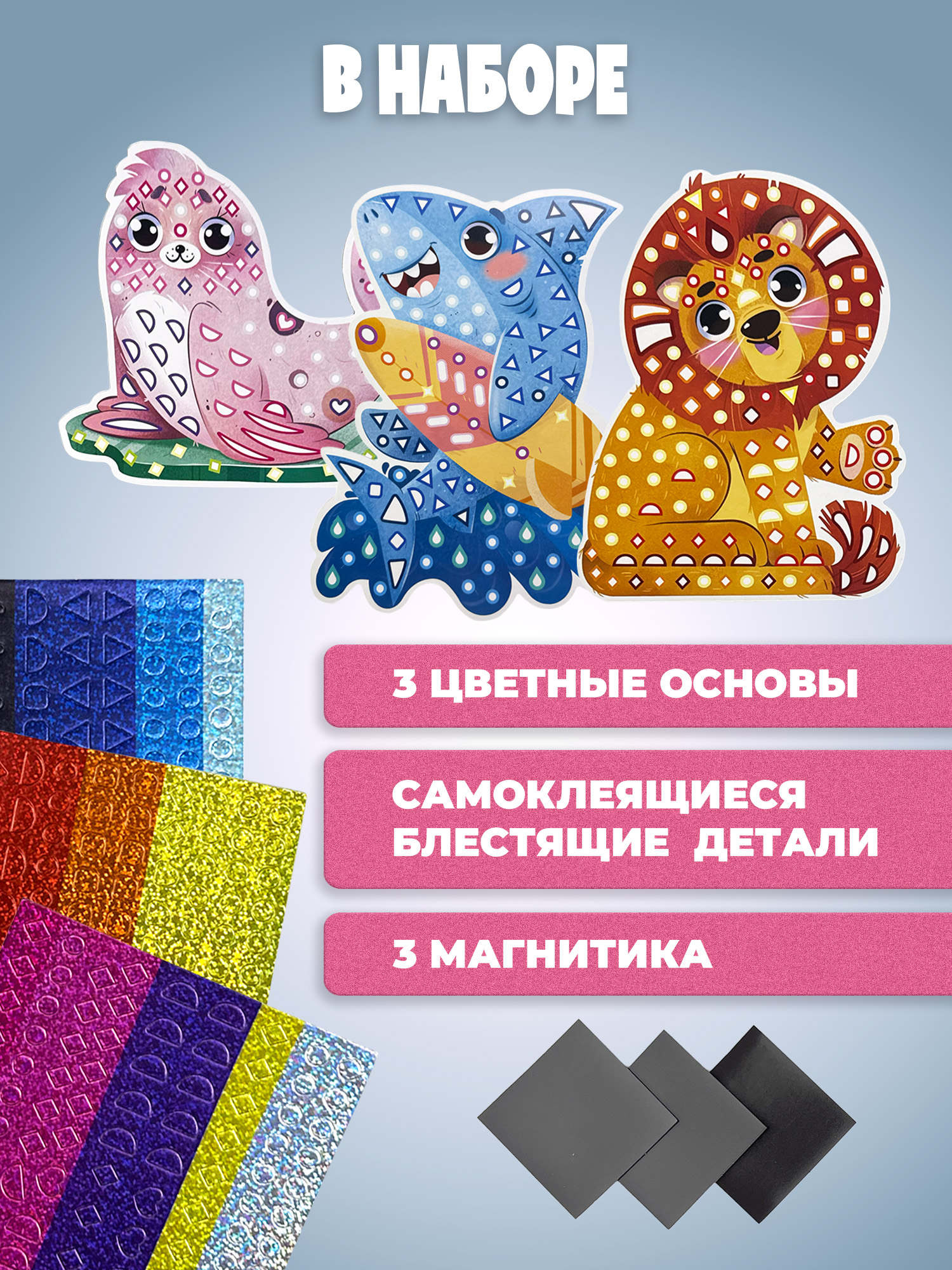 Никаких клея и ножниц – в наборе есть всё для работы. Блестящие детали мозаики легко отклеиваются от основы и надёжно крепятся к фигурке. В комплект входят магнитики, с помощью которых готовую работу можно повесить на магнитную доску или холодильник.