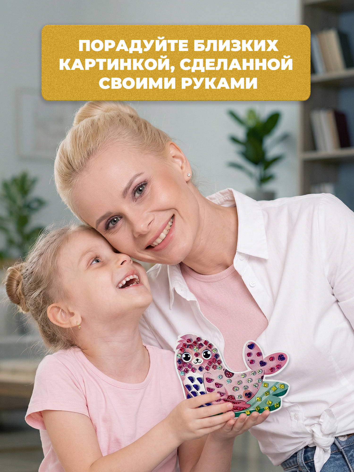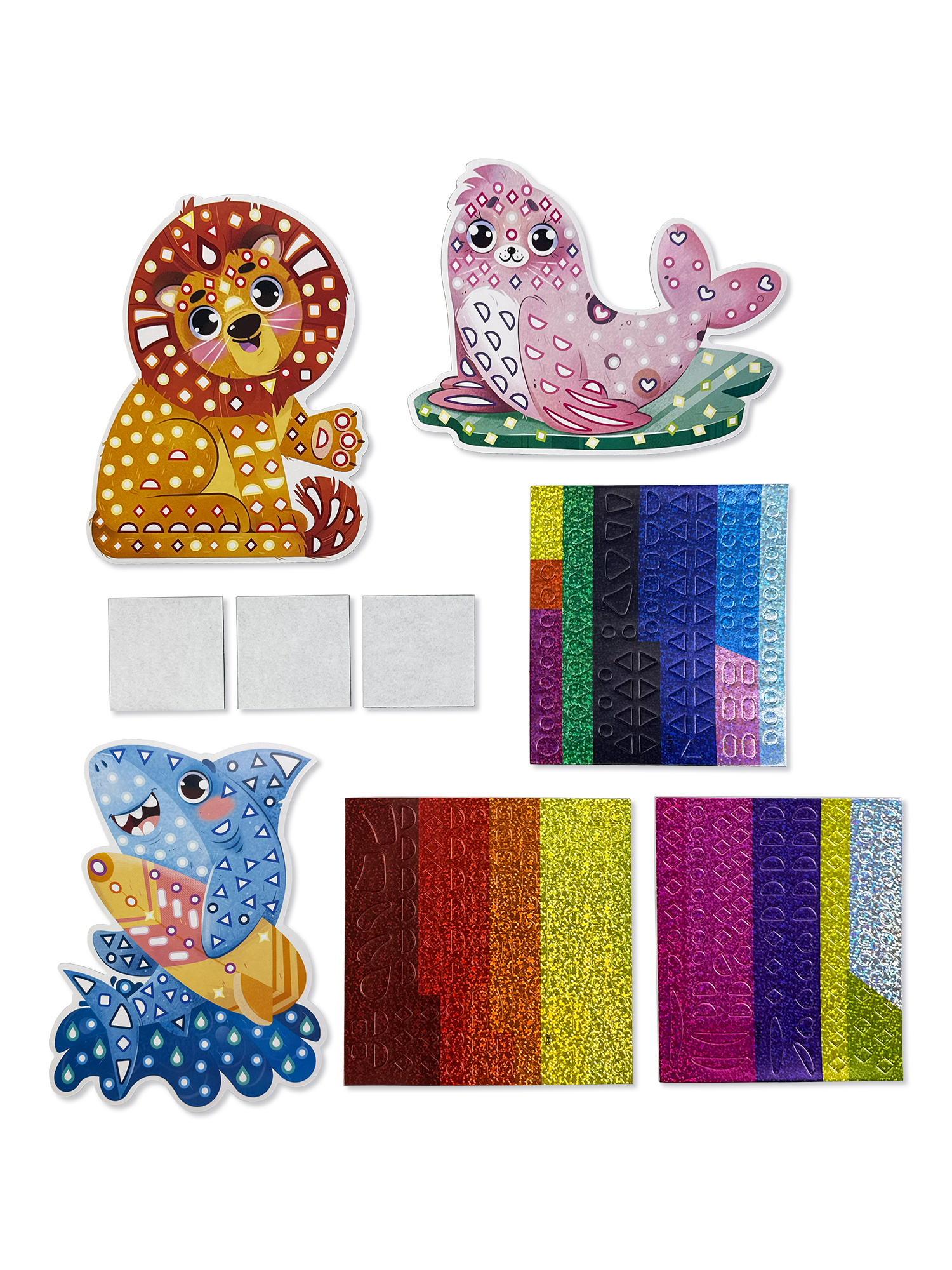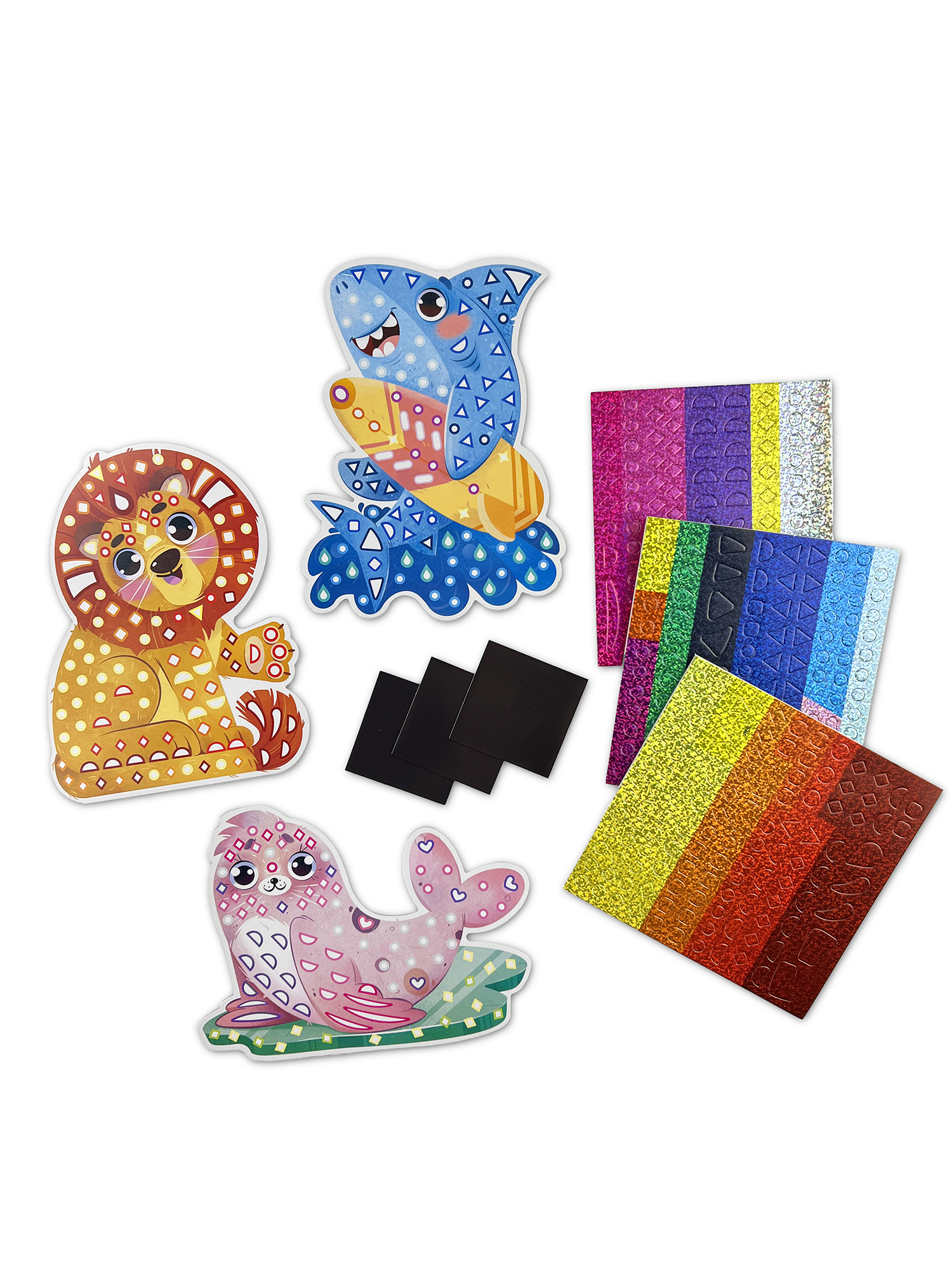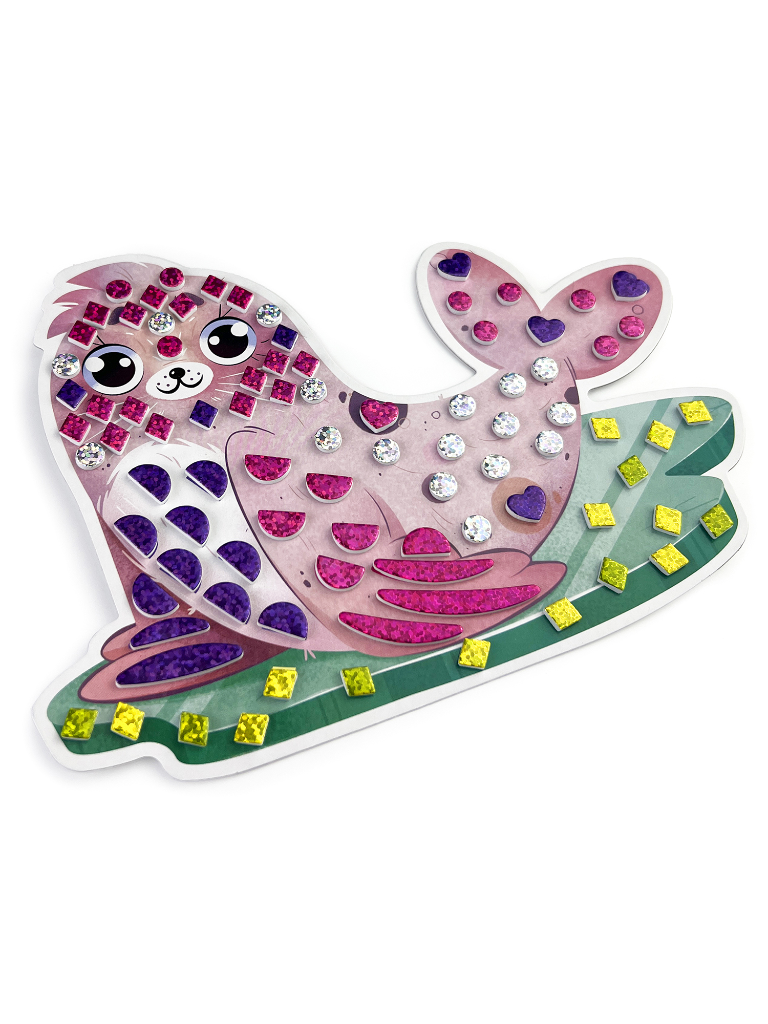 Никаких клея и ножниц – в наборе есть всё для работы. Блестящие детали мозаики легко отклеиваются от основы и надёжно крепятся к фигурке. В комплект входят магнитики, с помощью которых готовую работу можно повесить на магнитную доску или холодильник.