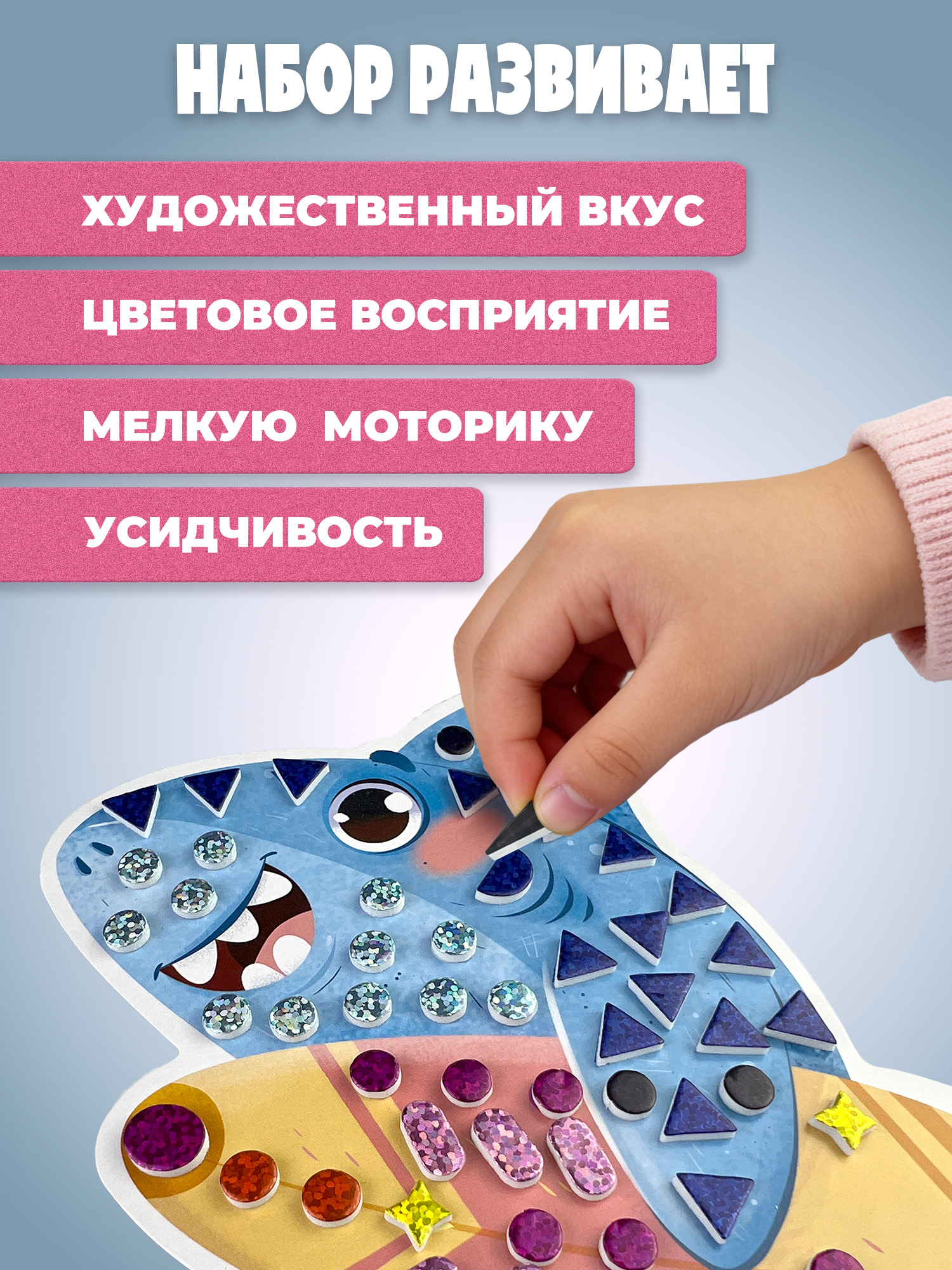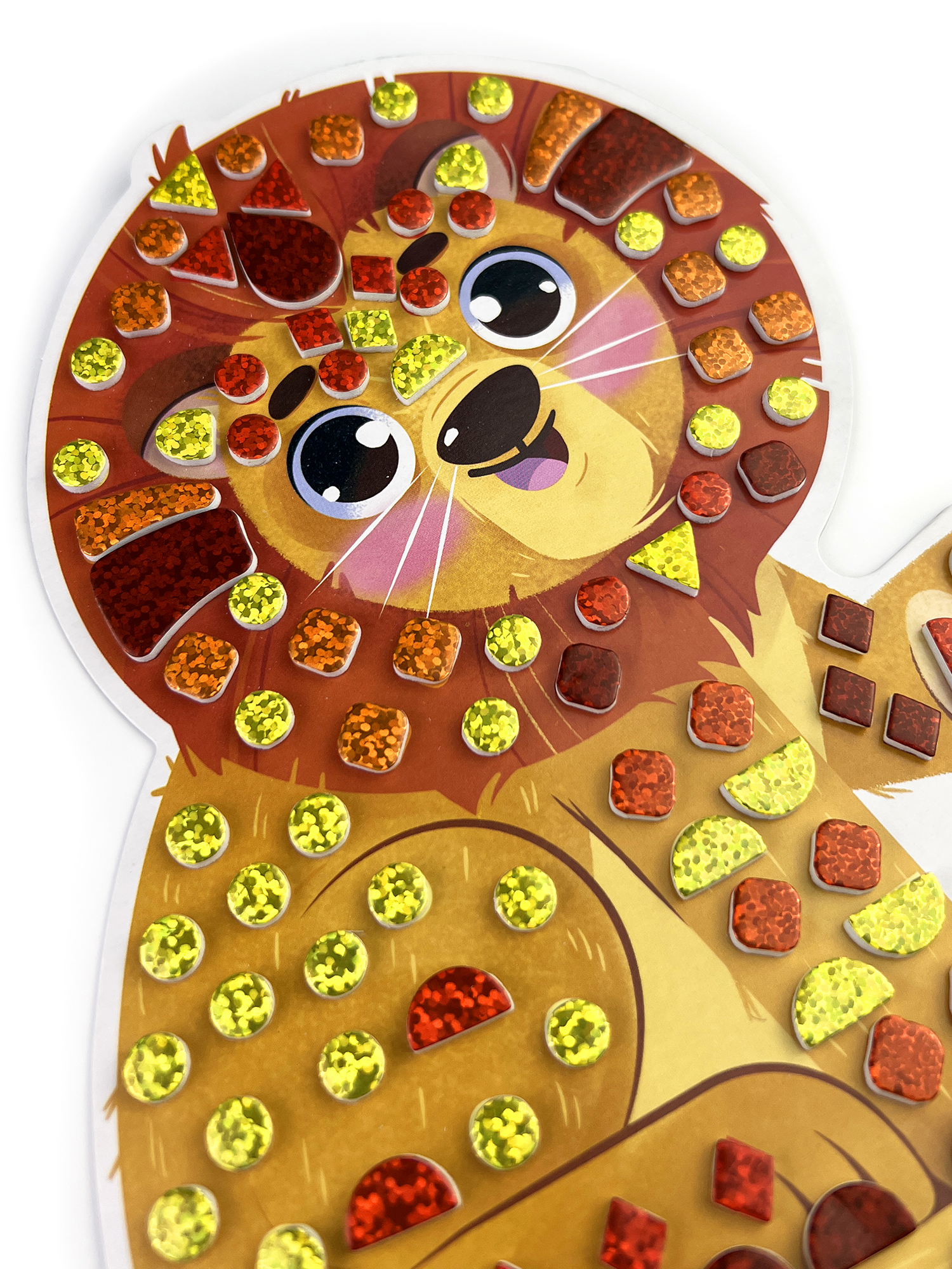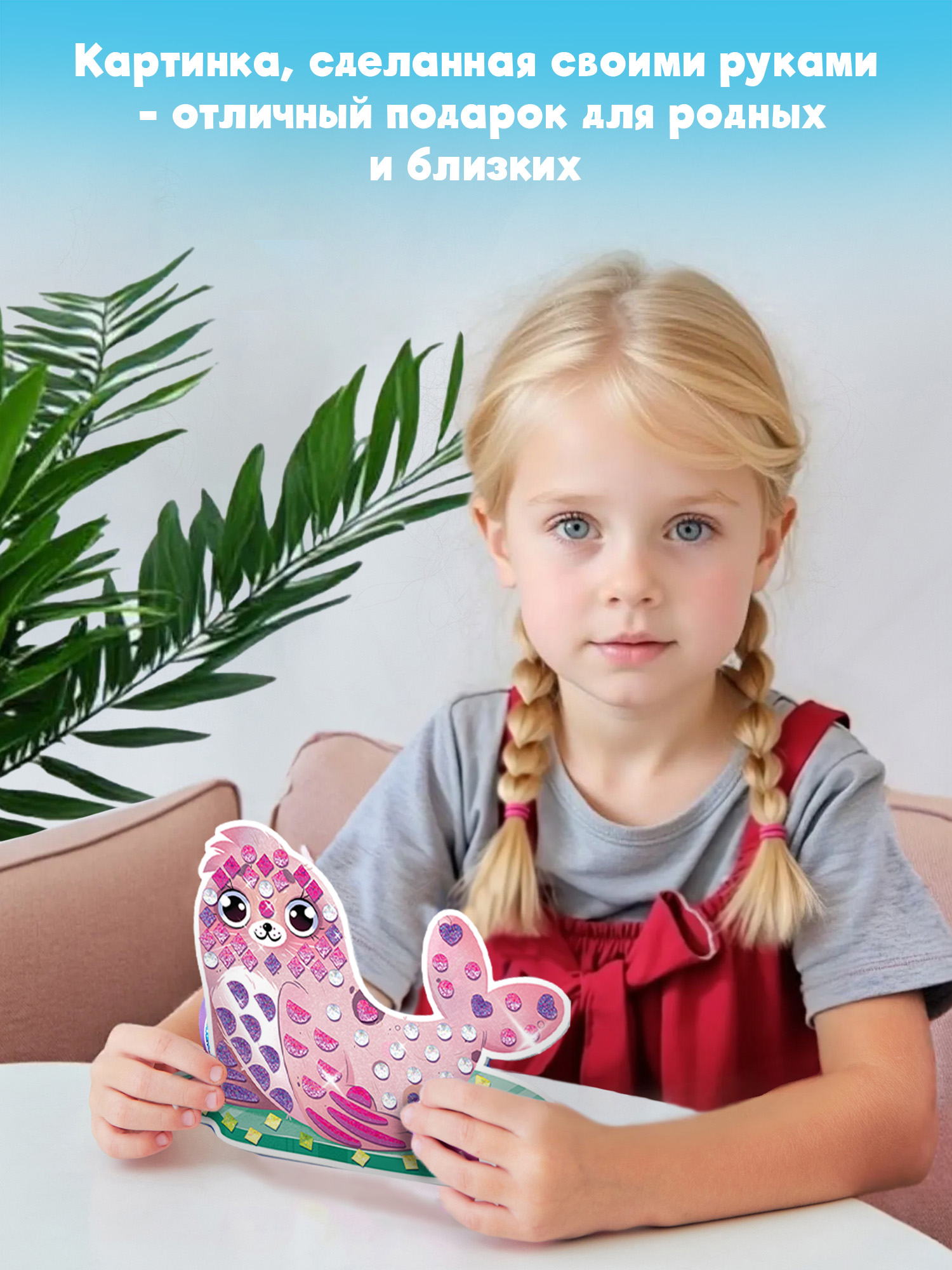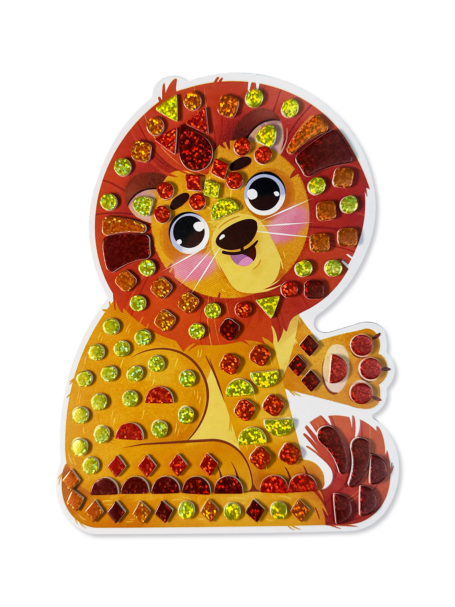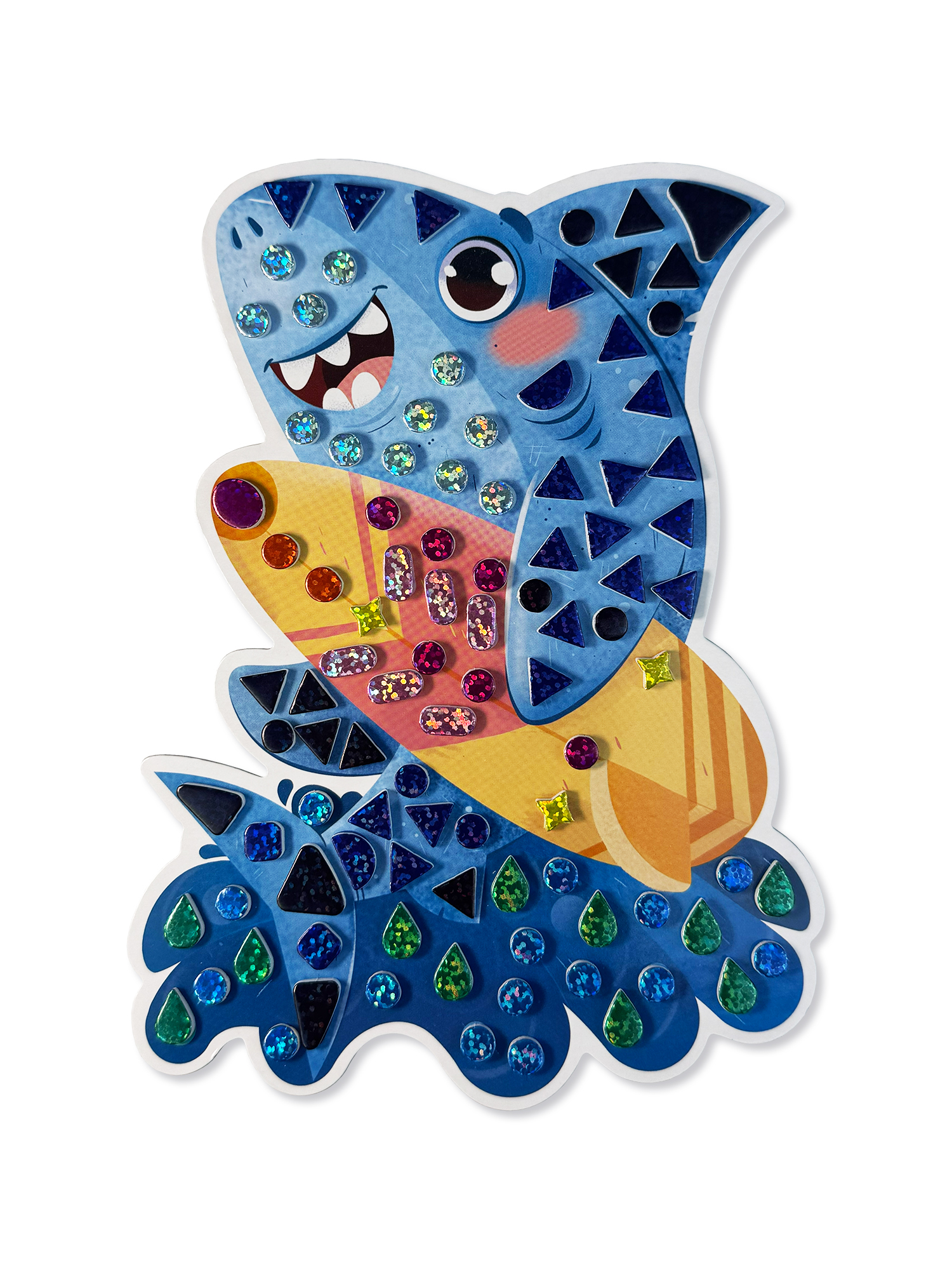 Никаких клея и ножниц – в наборе есть всё для работы. Блестящие детали мозаики легко отклеиваются от основы и надёжно крепятся к фигурке. В комплект входят магнитики, с помощью которых готовую работу можно повесить на магнитную доску или холодильник.