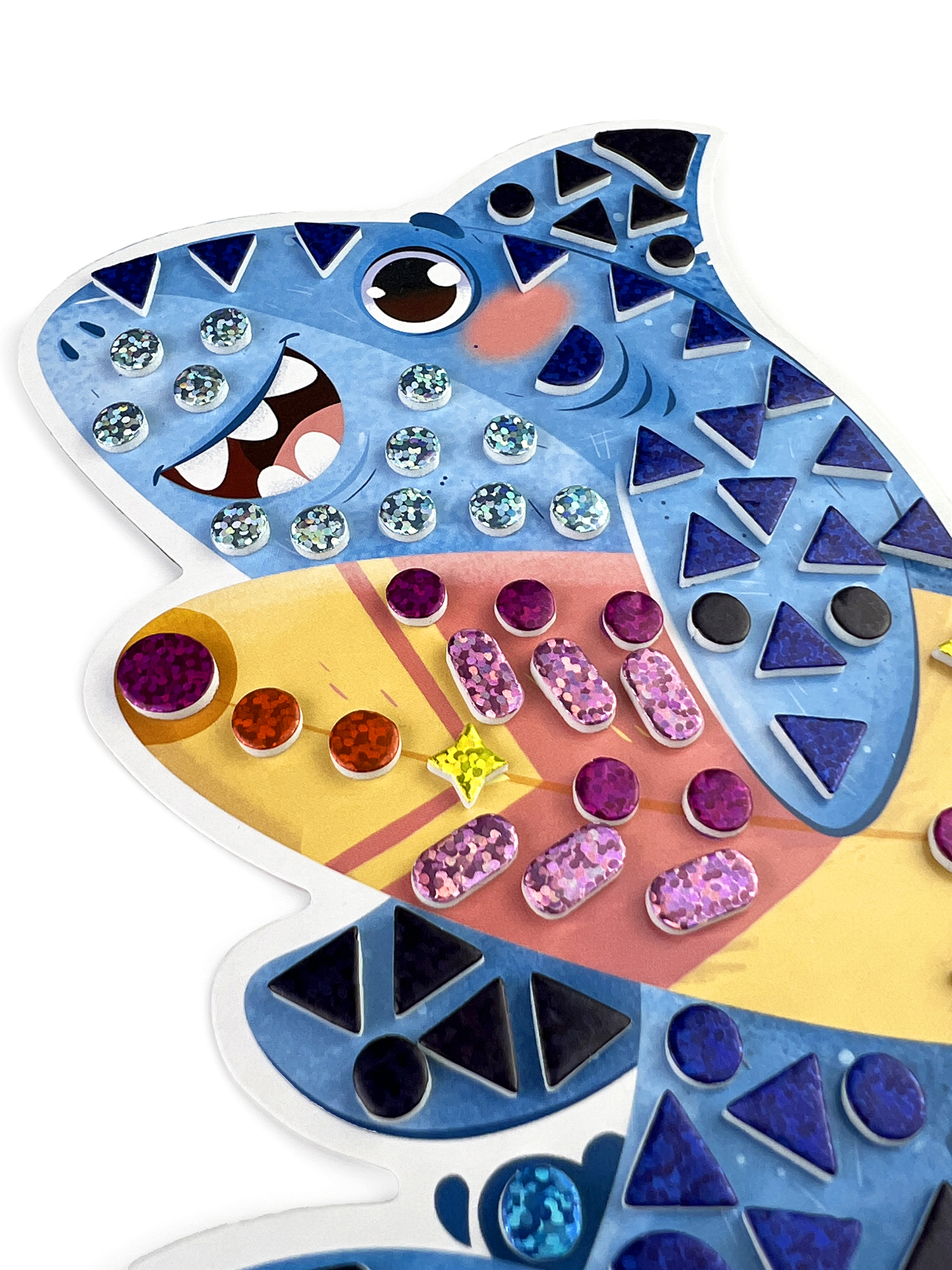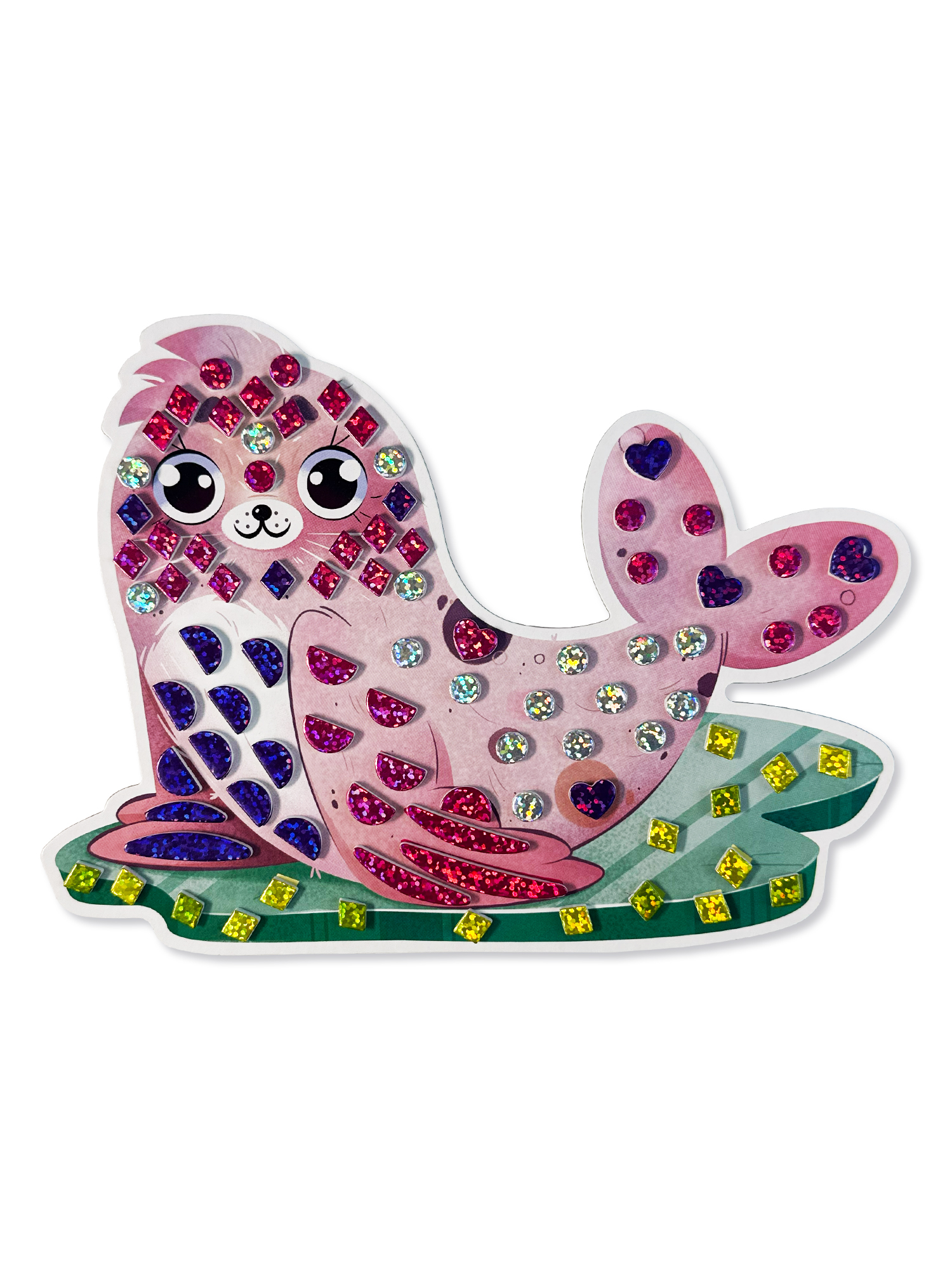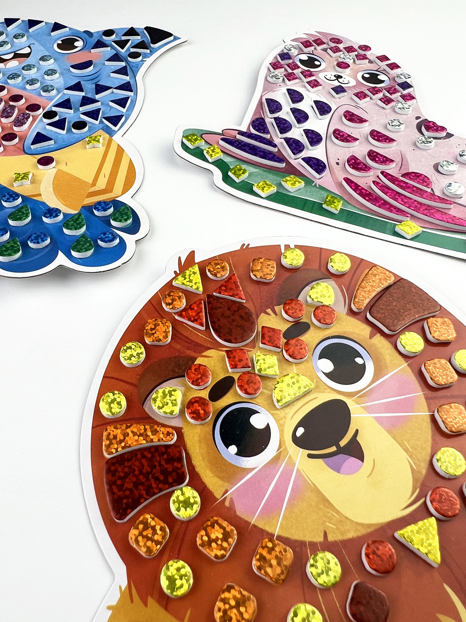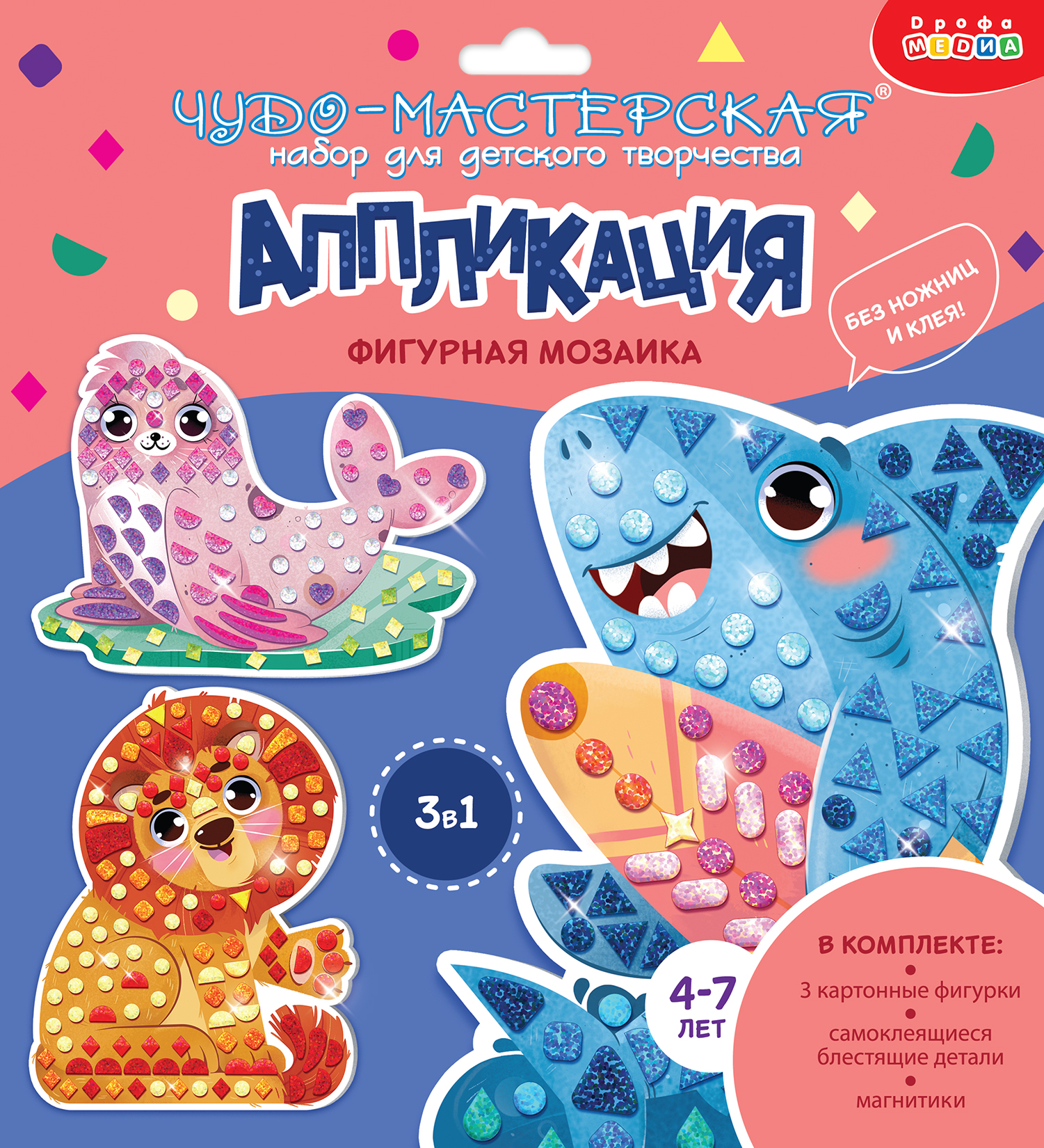 Никаких клея и ножниц – в наборе есть всё для работы. Блестящие детали мозаики легко отклеиваются от основы и надёжно крепятся к фигурке. В комплект входят магнитики, с помощью которых готовую работу можно повесить на магнитную доску или холодильник.