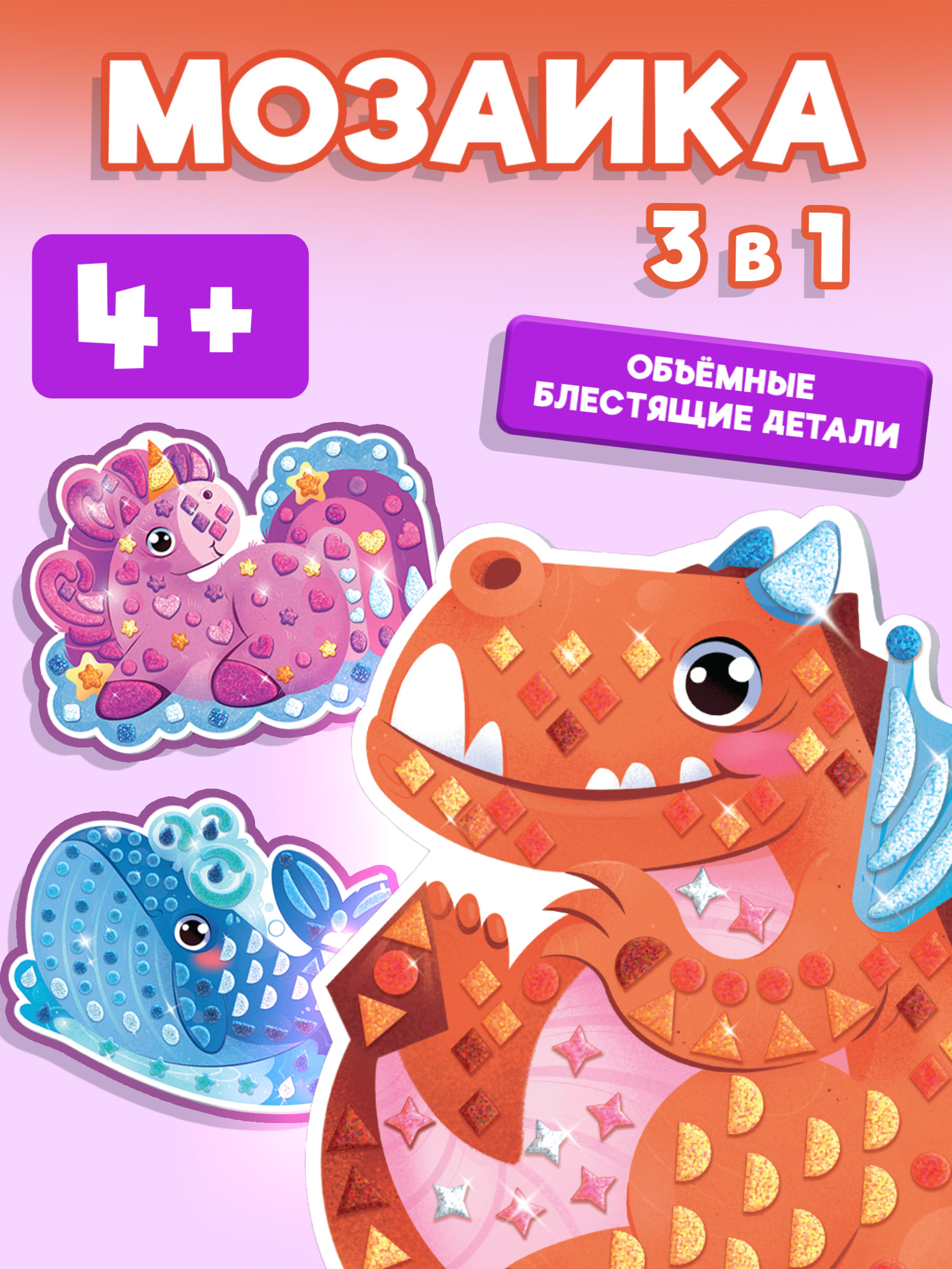 Фигурная мозаика 3 в 1 – это яркий и интересный набор для творчества, в котором украшать блестящими деталями мозаики нужно картонные фигурки, вырубленные по контуру.