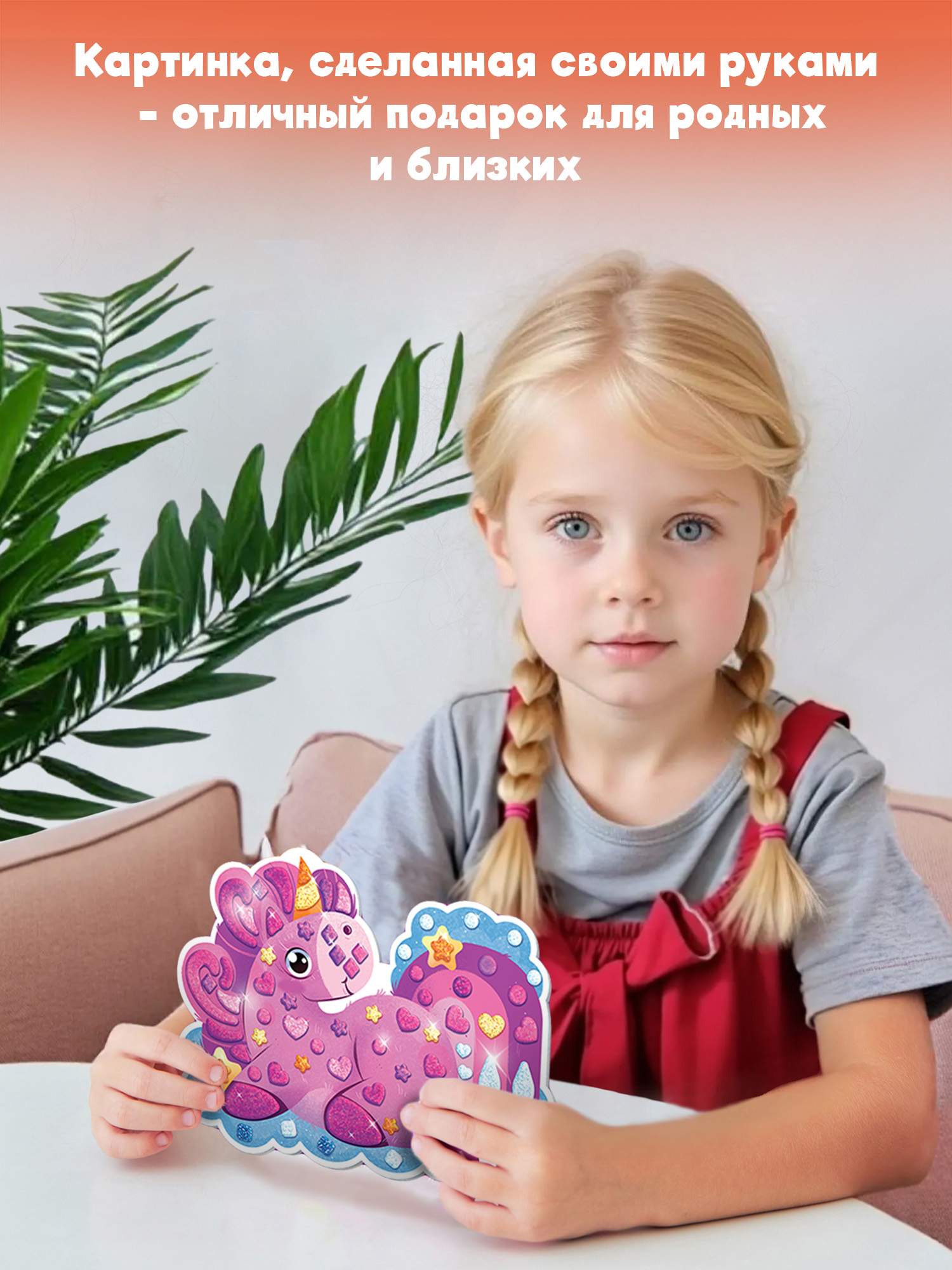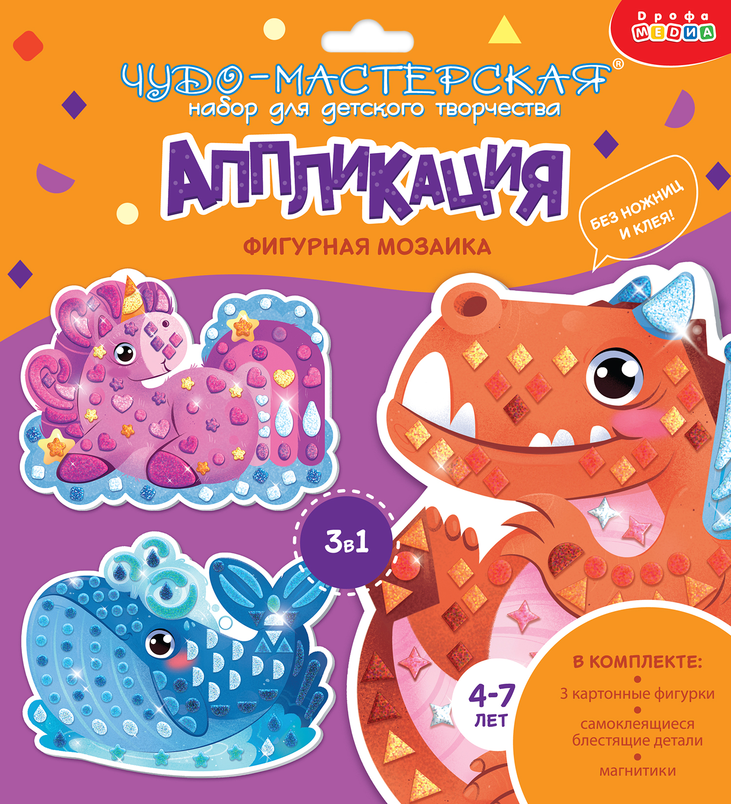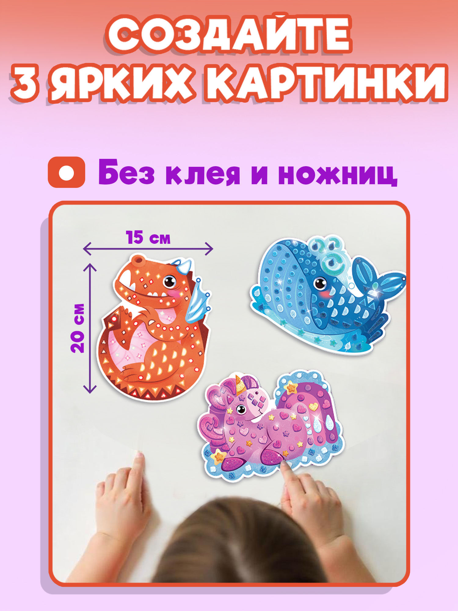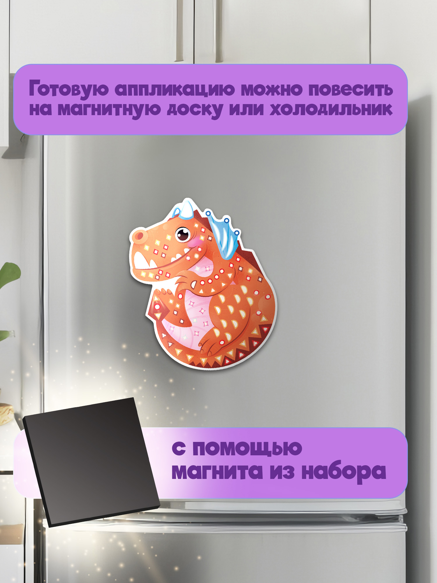 Никаких клея и ножниц – в наборе есть всё для работы. Блестящие детали мозаики легко отклеиваются от основы и надёжно крепятся к фигурке. В комплект входят магнитики, с помощью которых готовую работу можно повесить на магнитную доску или холодильник.