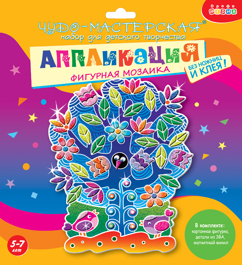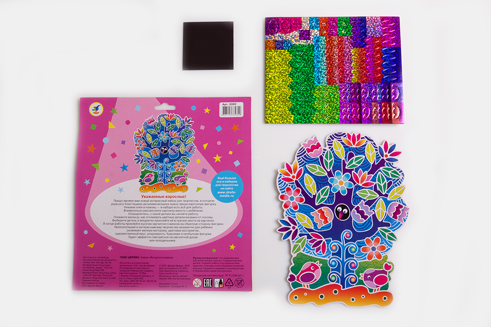 Новый интересный набор для творчества, в котором украшать блестящими ЭВА-деталями мозаики нужно яркую, вырубленную по контуру, картонную фигурку-персонаж. Никаких клея и ножниц — в наборе есть всё для работы. Блестящие детали мозаики легко отклеиваются от основы и надёжно крепятся к фигурке-персонажу. В комплект входит магнитный винил, с помощью которого готовую работу можно повесить на магнитную доску или холодильник.