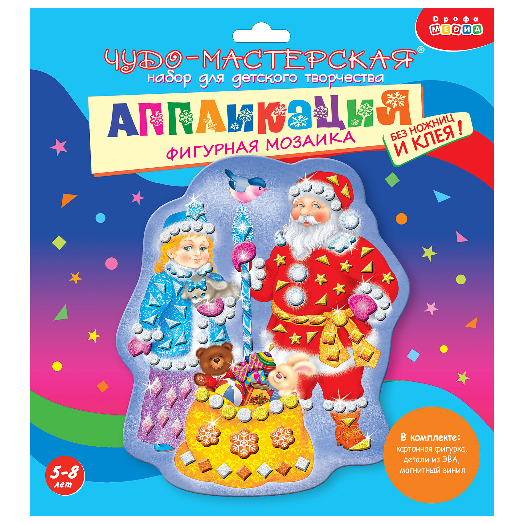 Поддержать новогоднюю атмосферу поможет новый набор для творчества от «Дрофы-Медиа», в котором нужно украсить блестящими деталями мозаики весёлую праздничную картинку. Никаких клея и ножниц — в наборе уже есть всё для работы. Не забудьте приклеить кусочек магнитного винила на обратную сторону картинки. Готово! Теперь весёлых, добрых сказочных героев можно прикрепить к магнитной доске или холодильнику, и они будут радовать вашего малыша, создавая волшебную атмосферу зимних праздников.
