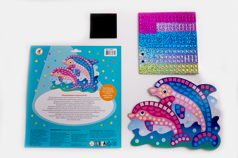 Новый интересный набор для творчества, в котором украшать блестящими ЭВА-деталями мозаики нужно яркую, вырубленную по контуру, картонную фигурку-персонаж. Никаких клея и ножниц — в наборе есть всё для работы. Блестящие детали мозаики легко отклеиваются от основы и надёжно крепятся к фигурке-персонажу. В комплект входит магнитный винил, с помощью которого готовую работу можно повесить на магнитную доску или холодильник.