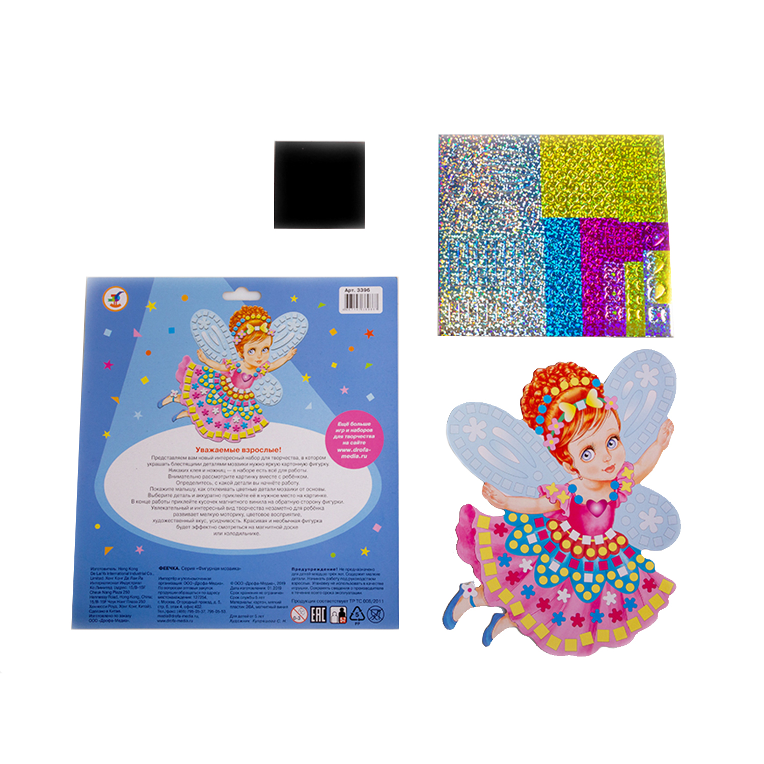 Новый интересный набор для творчества, в котором украшать блестящими ЭВА-деталями мозаики нужно яркую, вырубленную по контуру, картонную фигурку-персонаж. Никаких клея и ножниц — в наборе есть всё для работы. Блестящие детали мозаики легко отклеиваются от основы и надёжно крепятся к фигурке-персонажу. В комплект входит магнитный винил, с помощью которого готовую работу можно повесить на магнитную доску или холодильник.