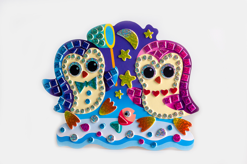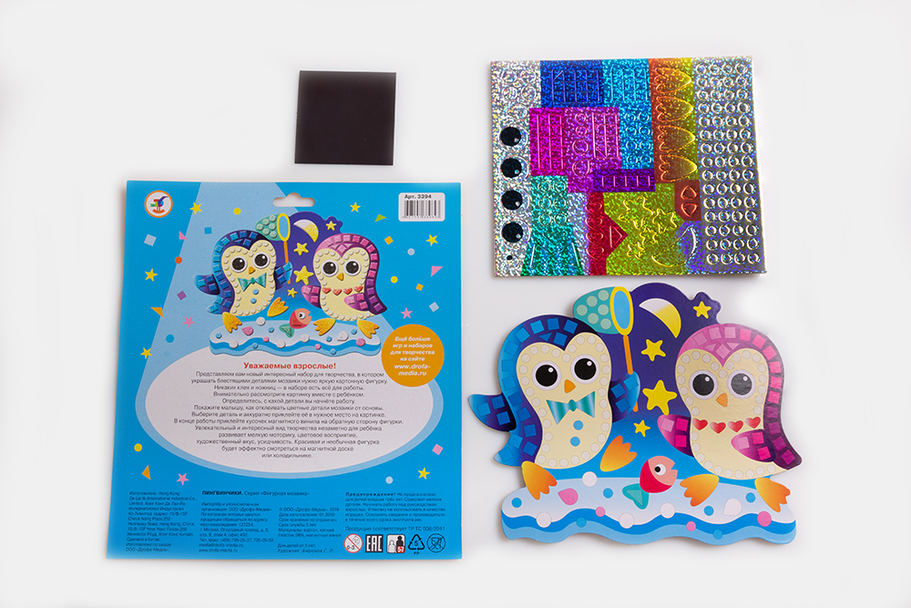 Новый интересный набор для творчества, в котором украшать блестящими ЭВА-деталями мозаики нужно яркую, вырубленную по контуру, картонную фигурку-персонаж. Никаких клея и ножниц — в наборе есть всё для работы. Блестящие детали мозаики легко отклеиваются от основы и надёжно крепятся к фигурке-персонажу. В комплект входит магнитный винил, с помощью которого готовую работу можно повесить на магнитную доску или холодильник.