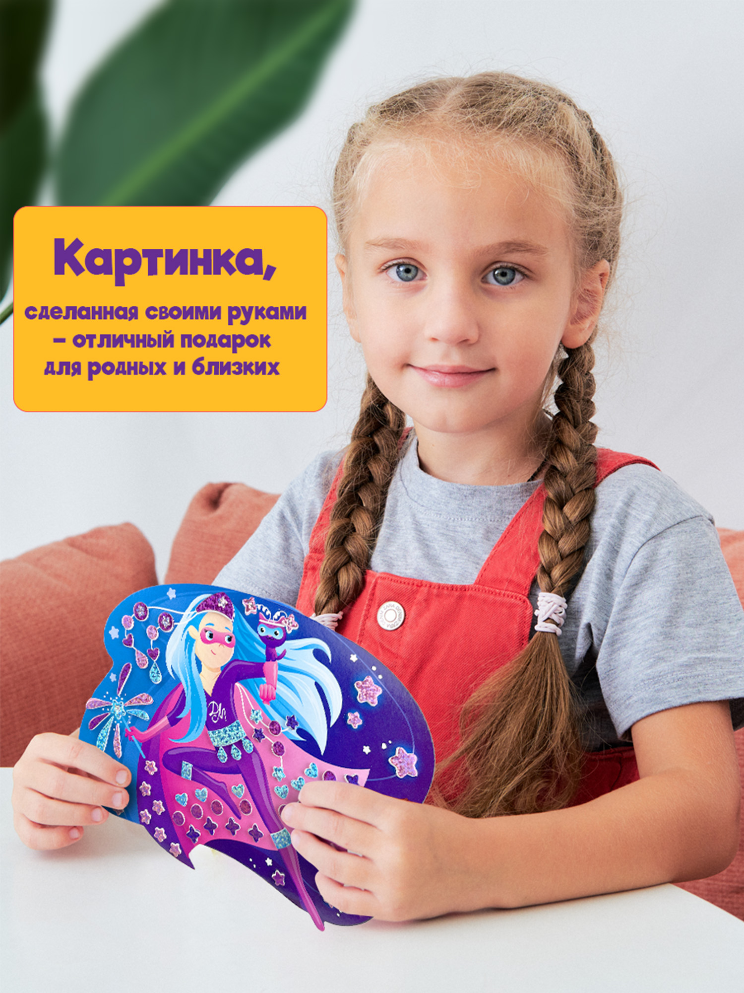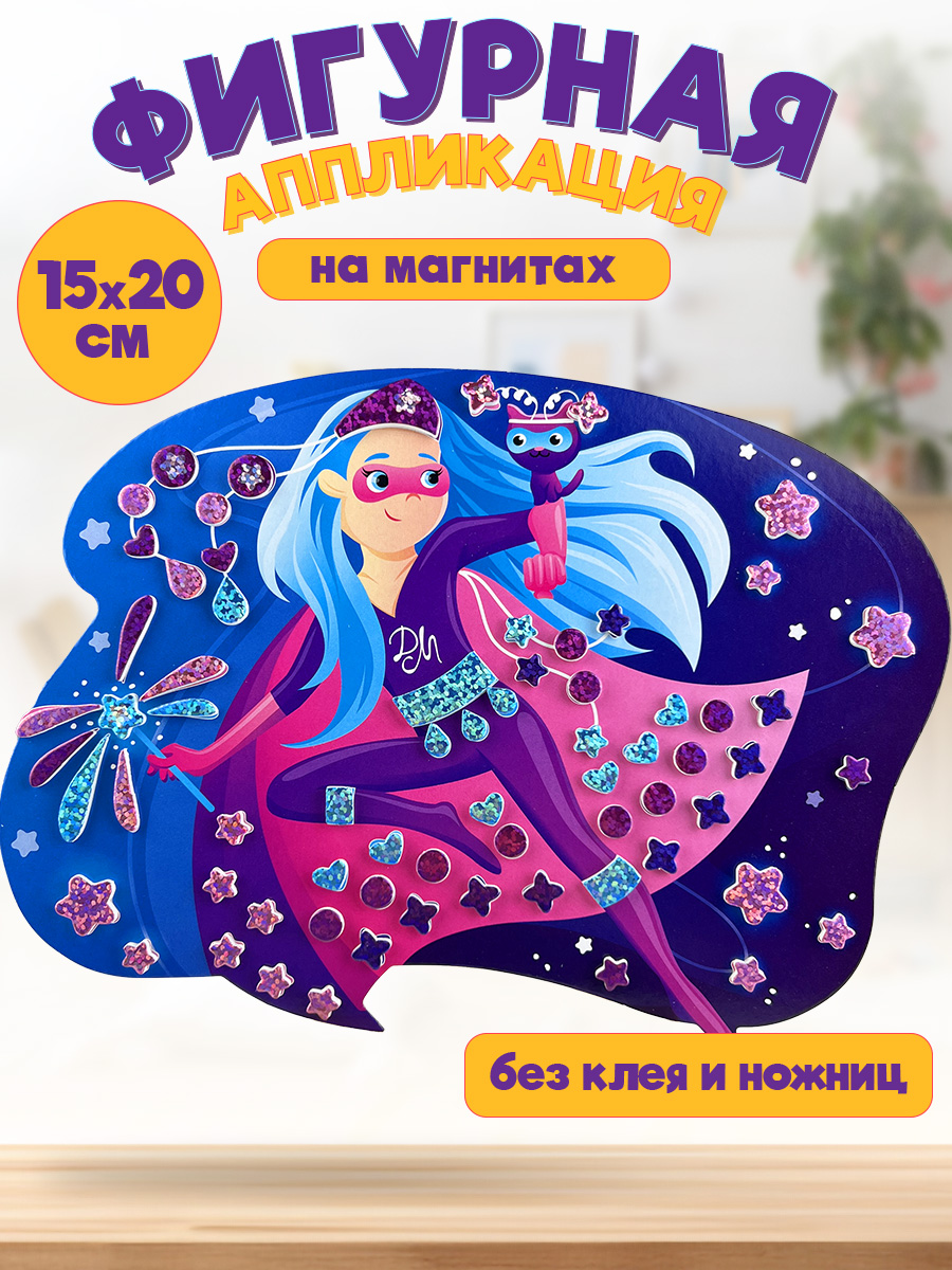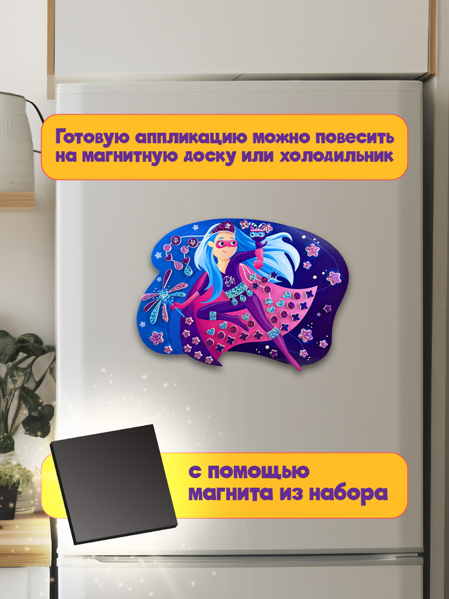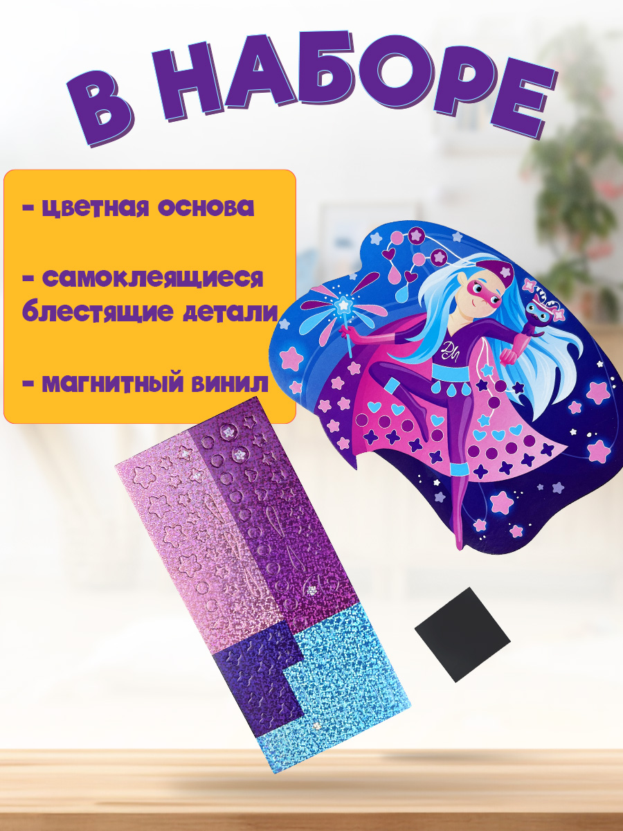 Никаких клея и ножниц – в наборе есть всё для работы. Блестящие детали мозаики легко отклеиваются от основы и надёжно крепятся к фигурке. В комплект входит магнитный винил, с помощью которого готовую работу можно повесить на магнитную доску или холодильник.